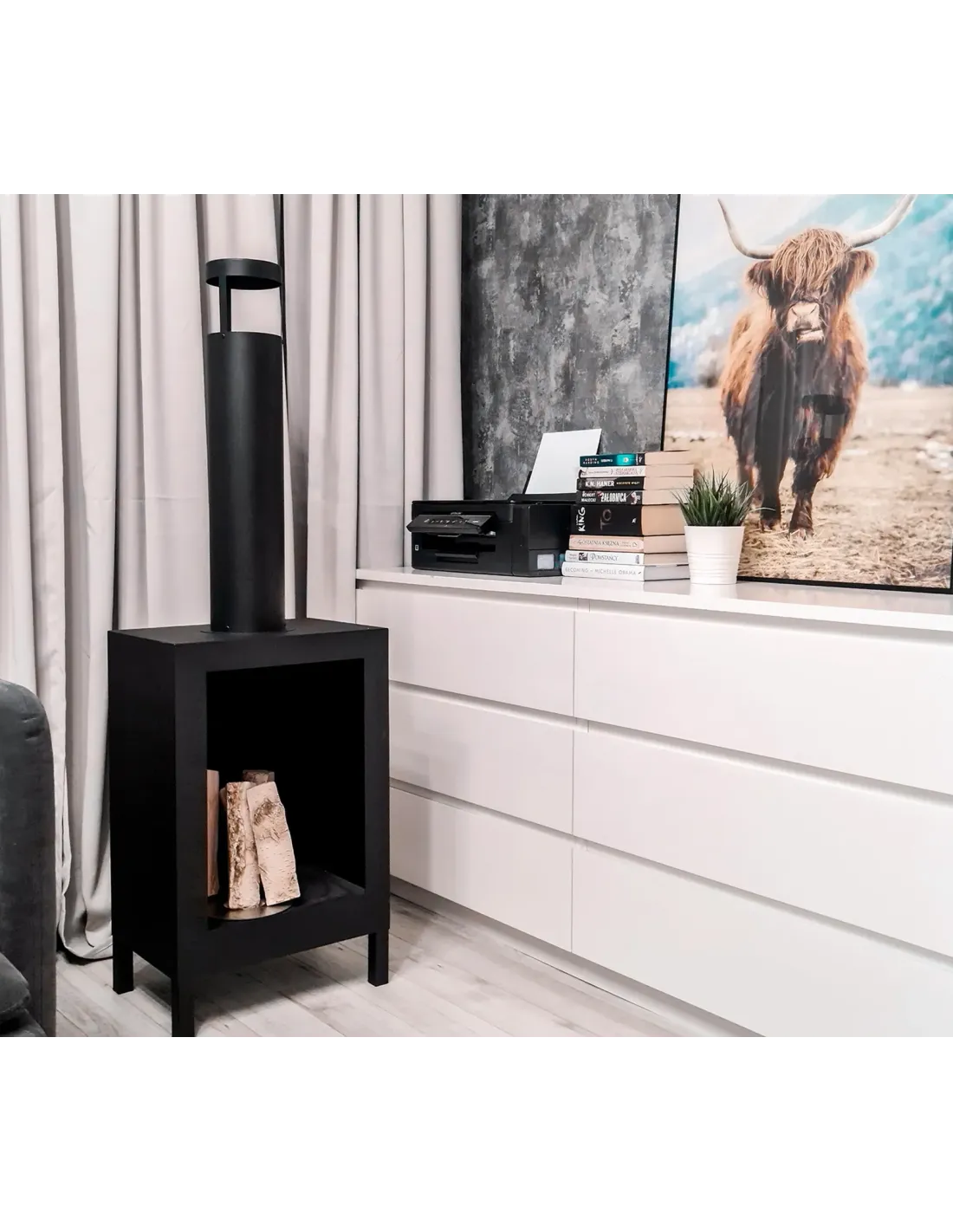 Wysoki biokominek wolnostojący o nowoczesnej stylistyce