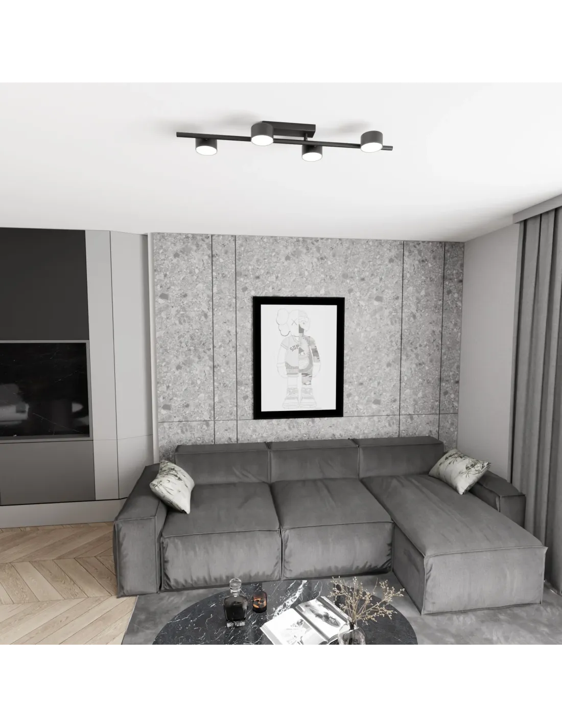 Lampa sufitowa BET 4 to znakomite rozwiązanie dla osób ceniących nowoczesny minimalizm i funkcjonalne oświetlenie. Jej geometryczna konstrukcja i czarne matowe wykończenie doskonale wpisują się w aktualne trendy aranżacyjne, stanowiąc zarówno praktyczne źródło światła, jak i stylowy element dekoracyjny. Lampa została zaprojektowana w oparciu o poziomą listwę, na której umieszczono cztery cylindryczne klosze, co zapewnia równomierne rozprowadzenie światła w pomieszczeniu.