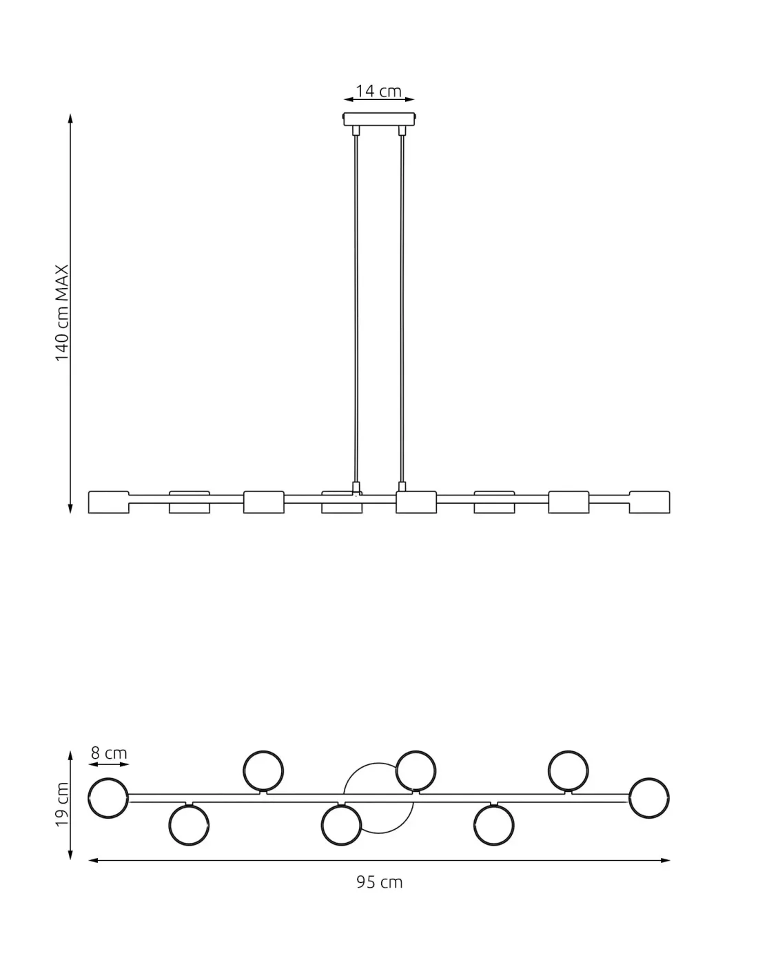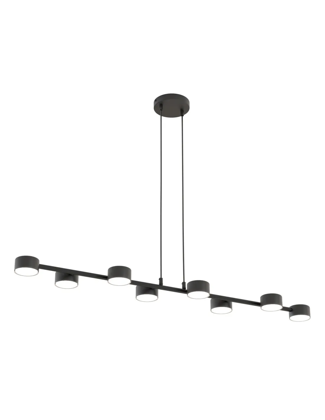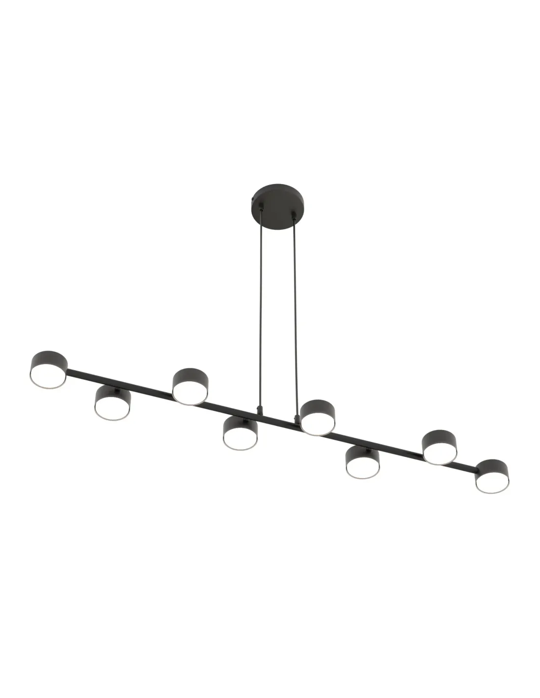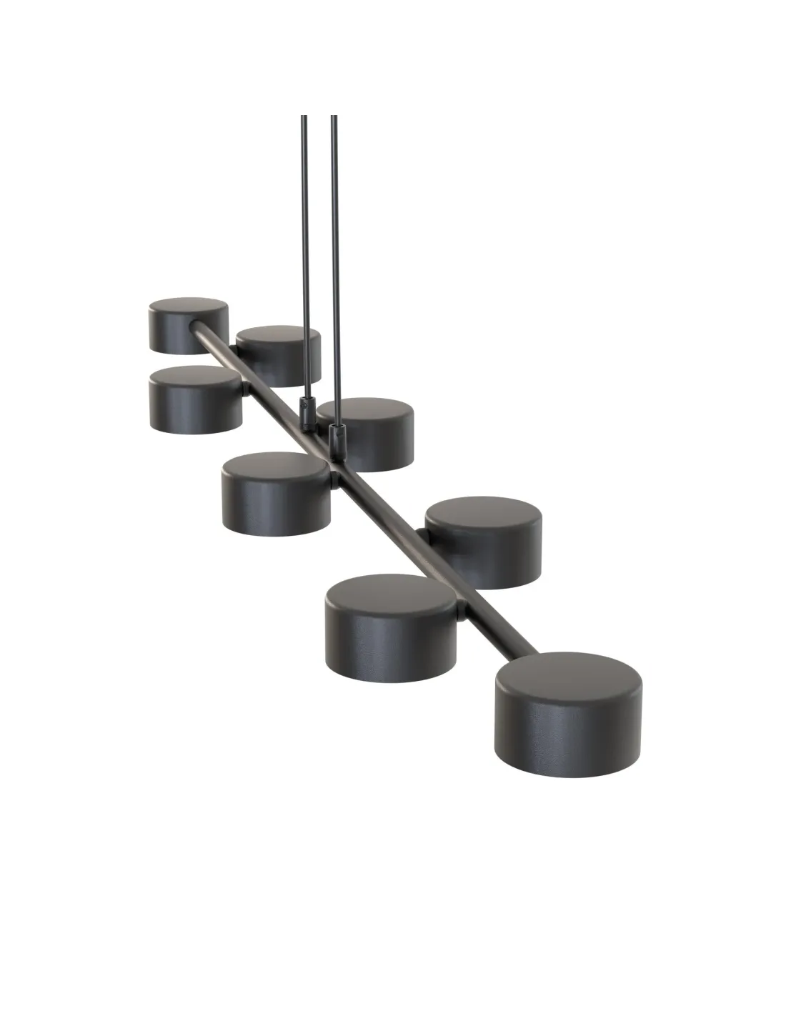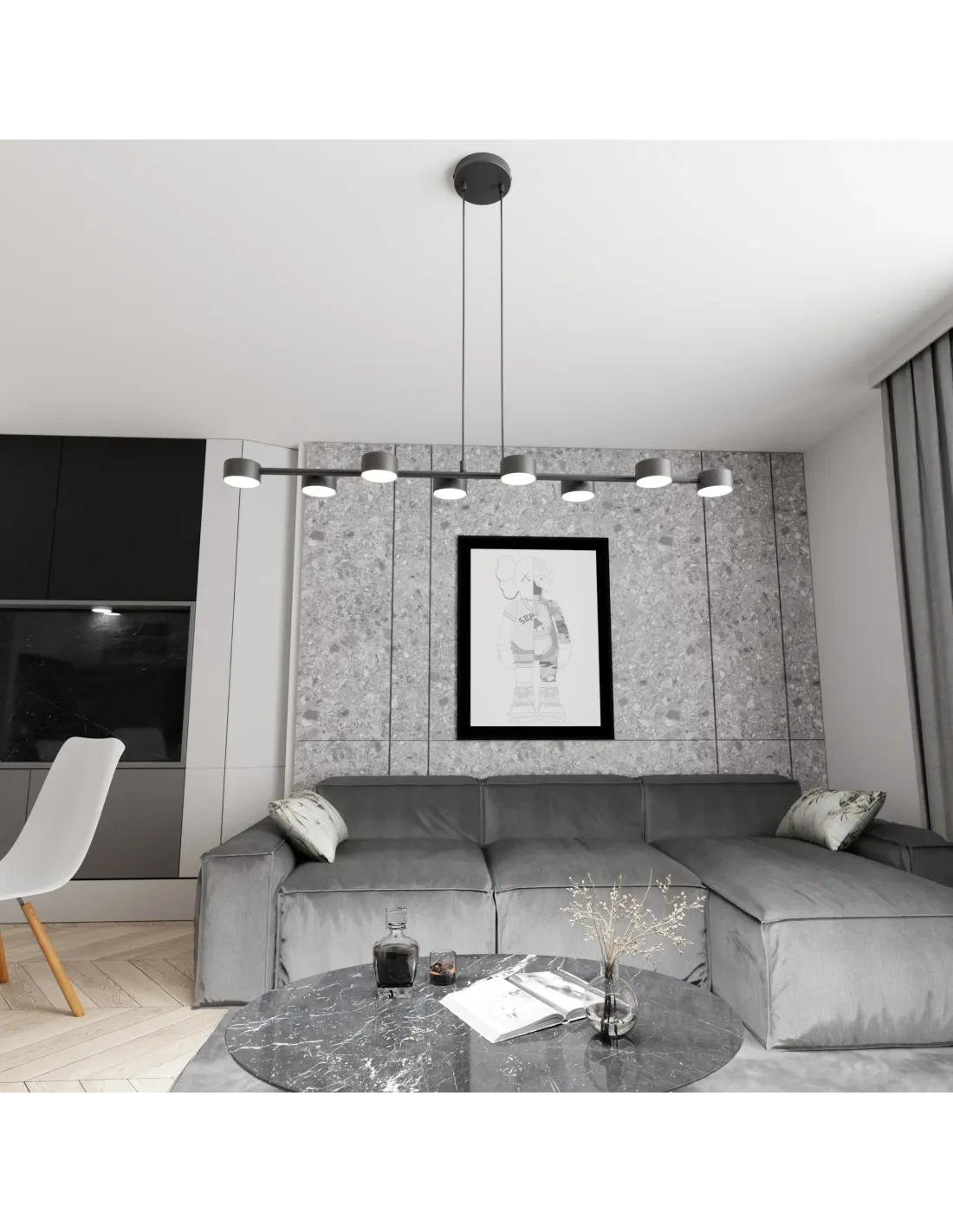 MEGARA 8 BL BLACK to imponująca lampa wisząca, która łączy minimalizm z efektywnością oświetleniową. Jej przemyślana konstrukcja opiera się na poziomej listwie o długości 100 cm, na której rozmieszczono aż osiem cylindrycznych opraw. Każda z nich jest przygotowana do montażu energooszczędnej żarówki GX53, co pozwala osiągnąć intensywne i równomierne światło nawet w większych przestrzeniach.