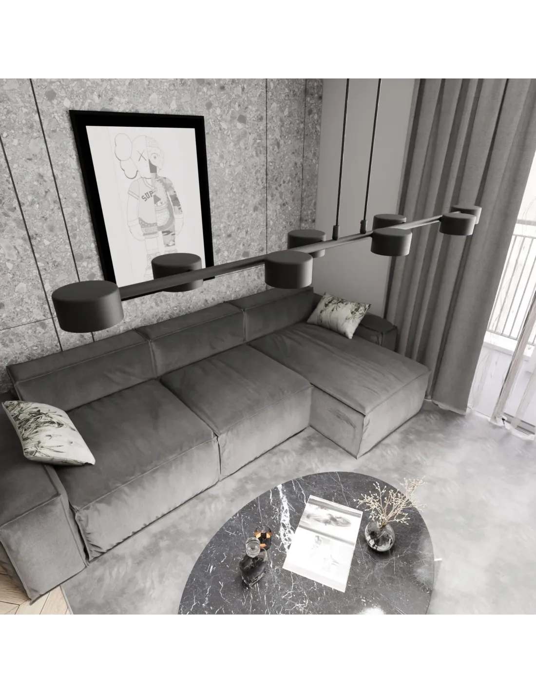 Matowa, czarna kolorystyka nadaje jej uniwersalności i sprawia, że idealnie wpisuje się w styl industrialny oraz nowoczesny. Metalowe osłony opraw dodają formie spójności i podkreślają jej nowoczesny charakter. Lampa zawieszona jest na cienkich przewodach, których długość można regulować, osiągając maksymalną wysokość 140 cm – co pozwala na jej dopasowanie do wysokości sufitu i stylu wnętrza.