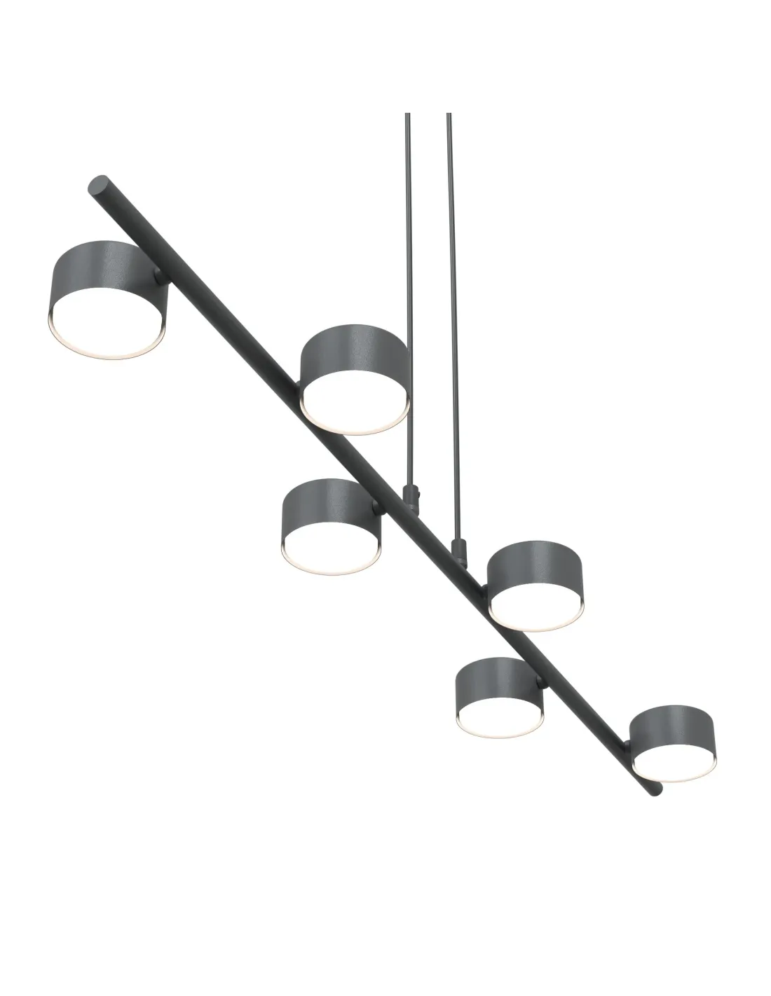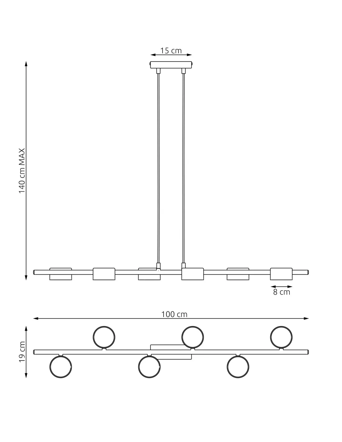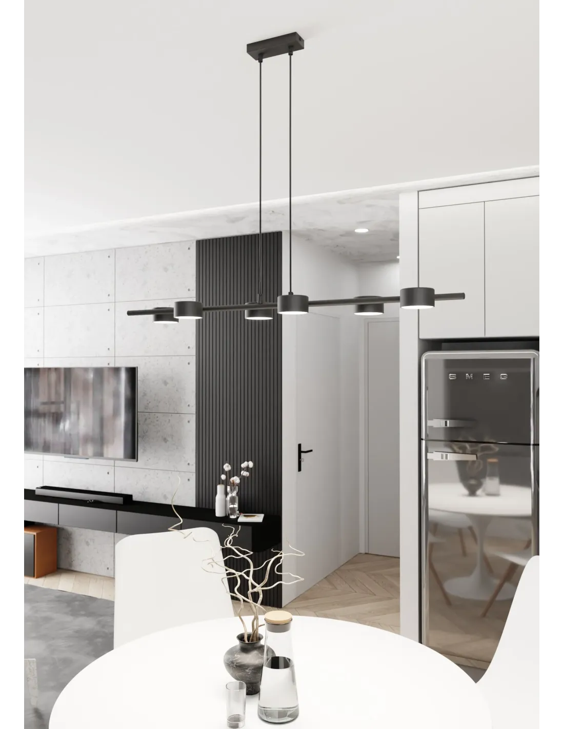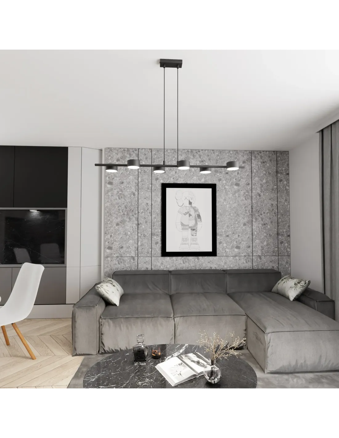 SORA 6 BL BLACK to model stworzony z myślą o nowoczesnych wnętrzach, w których liczy się precyzja wykonania i estetyczna lekkość. Jej konstrukcja opiera się na poziomej belce o długości 100 cm, do której przymocowane zostały sześć opraw oświetleniowych. Lampa zawieszona jest na cienkich przewodach, których wysokość można dowolnie regulować – maksymalnie do 140 cm – co pozwala na perfekcyjne dopasowanie jej do charakteru wnętrza i funkcji, jaką ma pełnić.