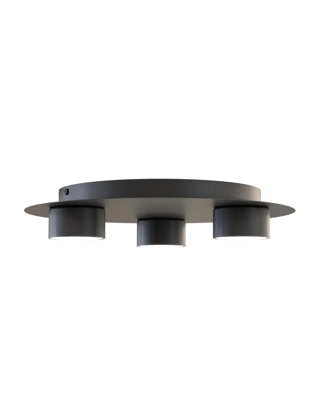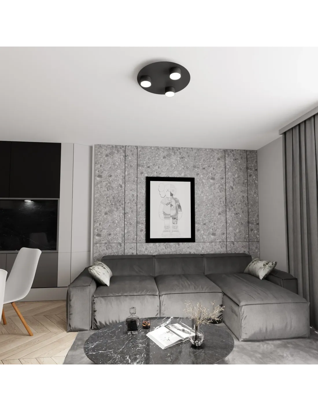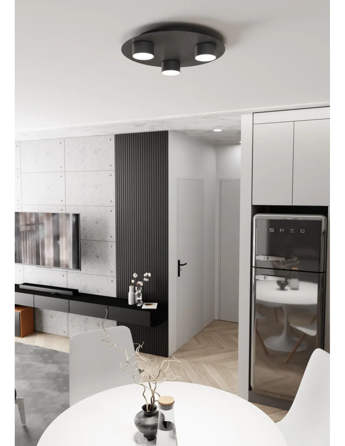 BOLX 3 BL BLACK to model wyróżniający się prostotą i klarowną konstrukcją. Na okrągłej podstawie zamontowano trzy symetrycznie rozmieszczone oprawki, każda osłonięta cylindryczną nakładką z metalu. Taka forma umożliwia skierowanie światła w różnych kierunkach, zapewniając skuteczne i funkcjonalne oświetlenie wnętrza.