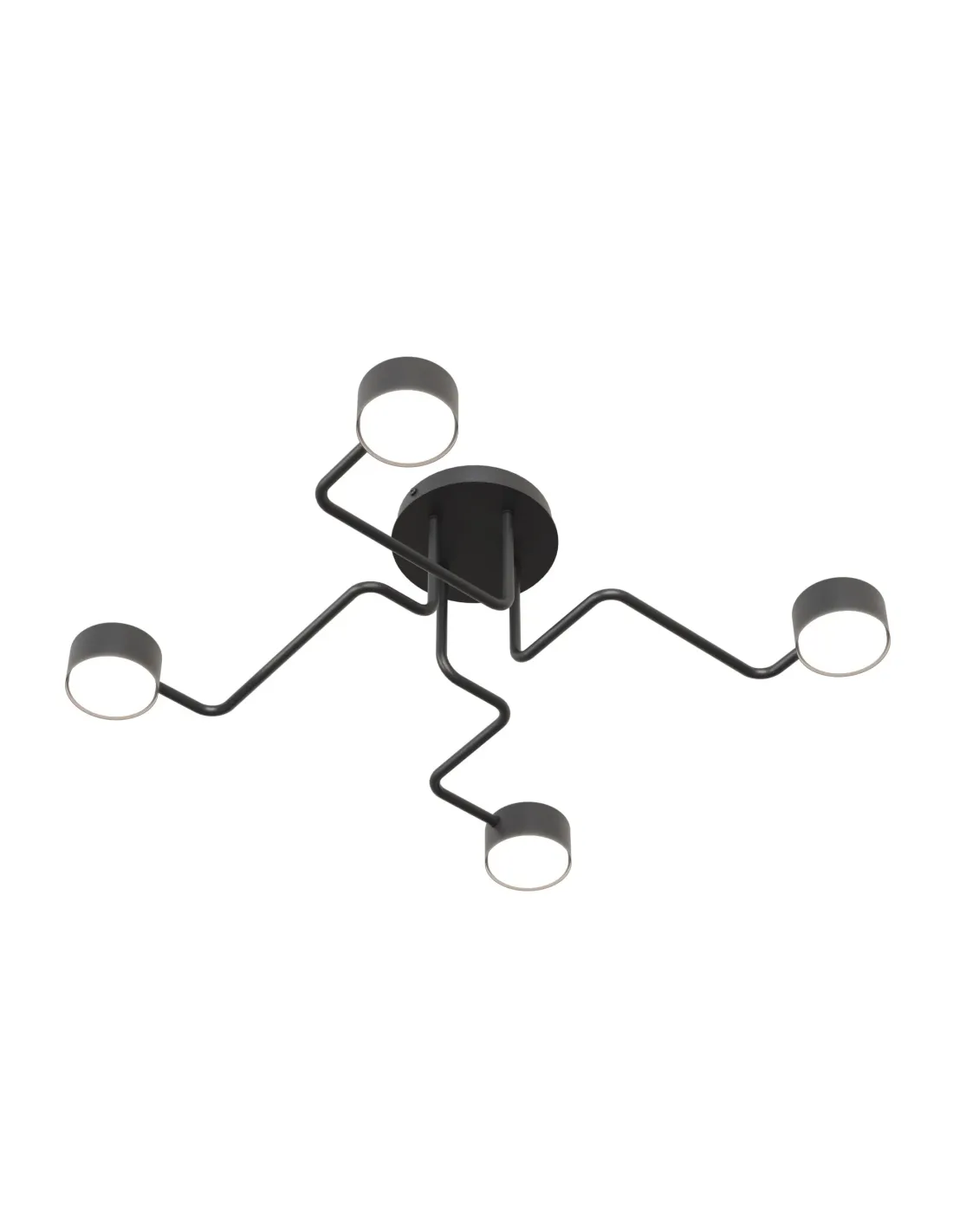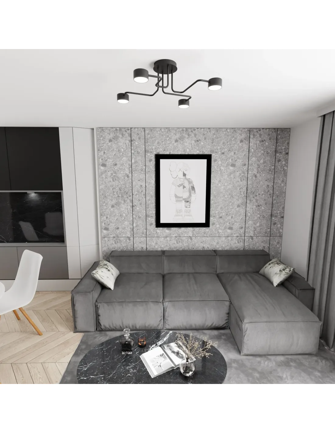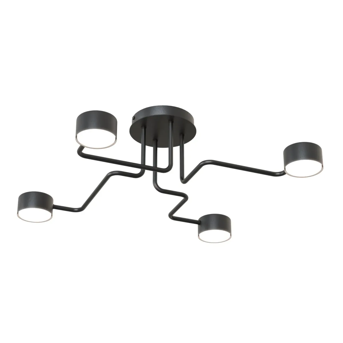 KURAGE 4 BL BLACK to nowoczesna lampa sufitowa, która przyciąga uwagę swoją oryginalną i dynamiczną formą. Jej nieregularny, asymetryczny układ ramion od razu wyróżnia ją spośród klasycznych plafonów i wprowadza do wnętrza nutę artystycznej ekspresji. Lampa idealnie odnajduje się w przestrzeniach o minimalistycznym lub industrialnym charakterze, stając się dekoracyjnym punktem aranżacji.