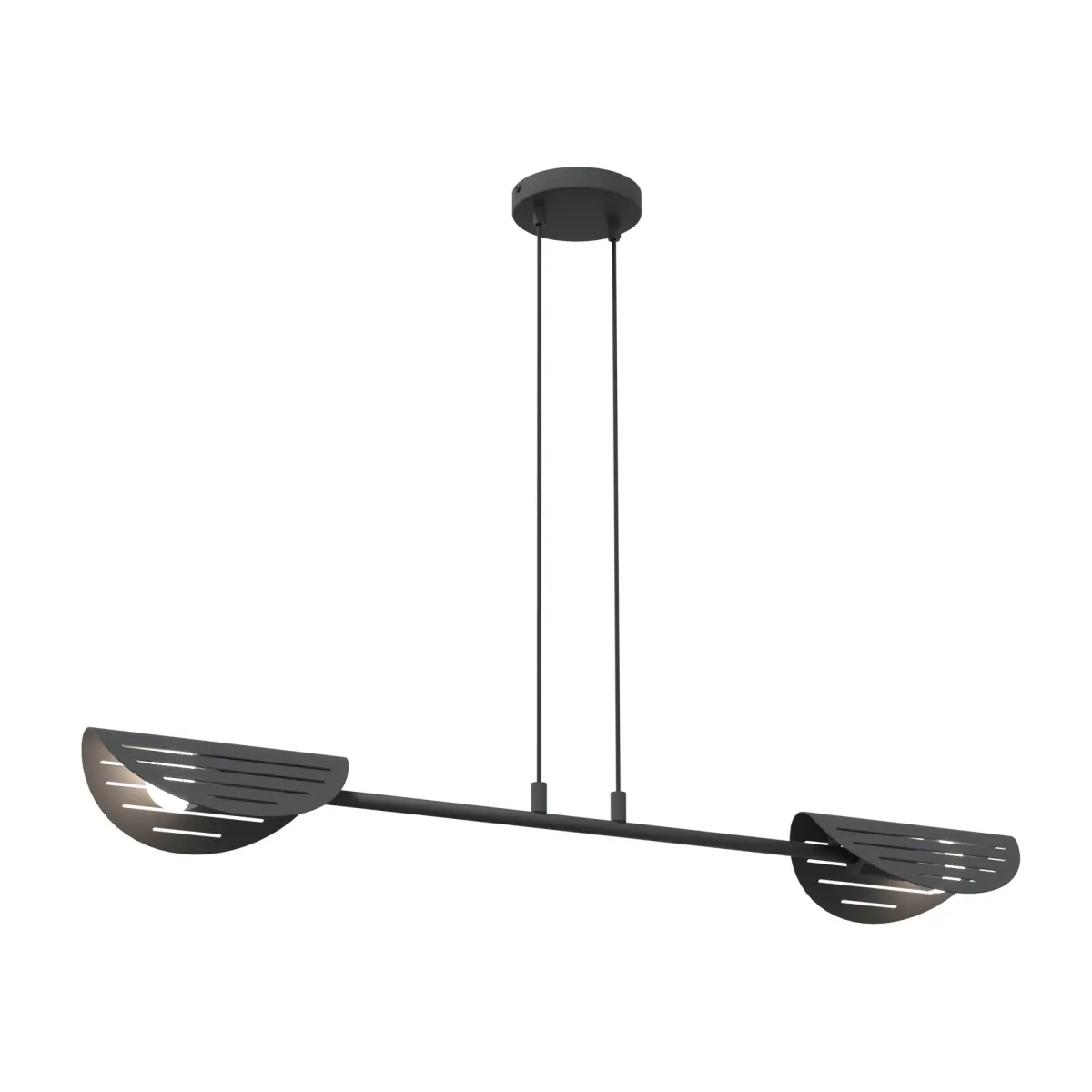 Lampa wyposażona jest w dwa punkty świetlne, co czyni ją idealnym rozwiązaniem nad stół w jadalni, blat kuchenny lub jako oświetlenie centralne w mniejszych pomieszczeniach. Brak kloszy sprawia, że światło nie jest tłumione, a widoczne żarówki tworzą efektowny, industrialny klimat. SABER 2 BL pozwala uzyskać intensywne, rozproszone światło, które skutecznie rozświetla przestrzeń, zachowując przy tym designerski charakter.