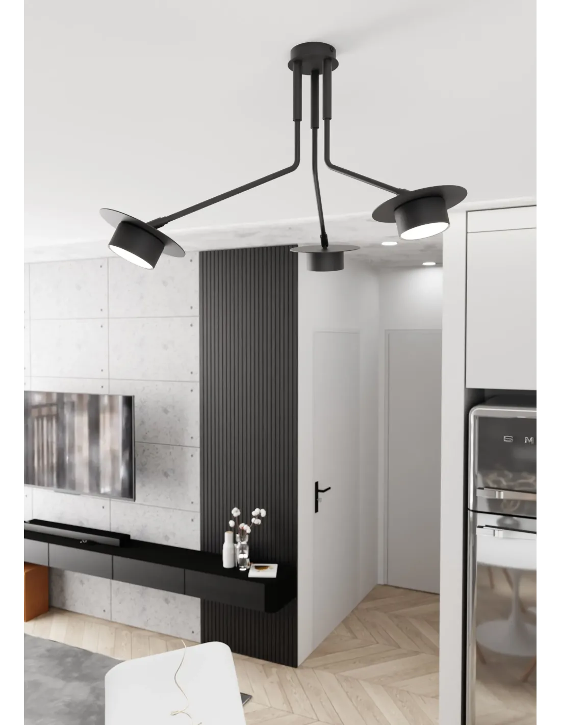 Czarna kolorystyka podkreśla ponadczasową elegancję, dzięki czemu lampa doskonale komponuje się zarówno w przestronnych salonach, jak i bardziej kameralnych wnętrzach. MIZU 3 świetnie sprawdzi się jako centralne oświetlenie w salonie, elegancki akcent nad stołem w jadalni czy element nadający stylu w gabinecie.