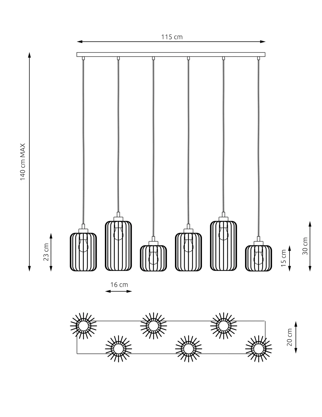 VANDER 6 wyposażona jest w sześć oprawek E27, które umożliwiają zastosowanie różnorodnych żarówek, w tym energooszczędnych LED. Dzięki otwartej formie kloszy, światło rozchodzi się na 360 stopni, gwarantując intensywne i równomierne oświetlenie dużych przestrzeni.