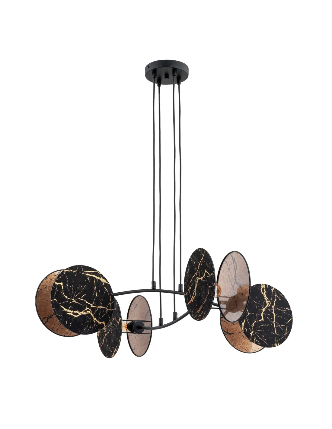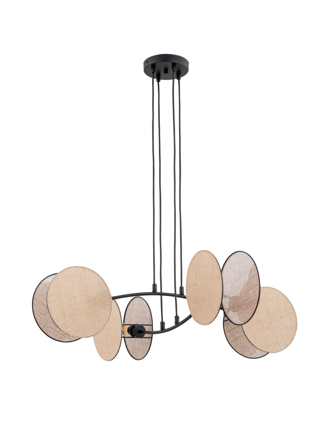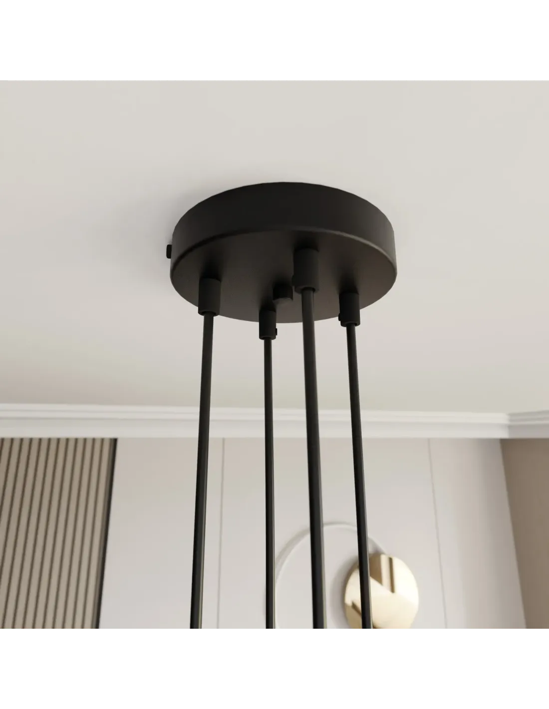 Lampa MOTIF w wersji czteropunktowej zachwyca swoją elegancją i prostotą jednocześnie. Cztery wygięte ramiona wychodzące z centralnej podsufitki podtrzymują tkaninowe abażury, które równomiernie oświetlają przestrzeń i stanowią jej ozdobę. Konstrukcja oparta na czarno-złotej kolorystyce doskonale wpisuje się w nowoczesne trendy aranżacyjne.