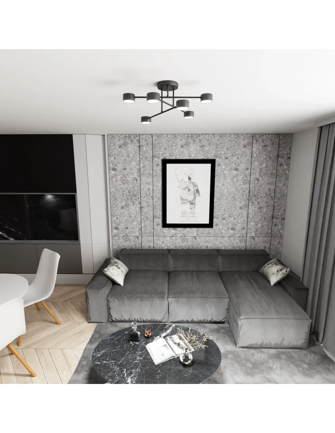 HALO 6 to nowoczesna lampa sufitowa, która łączy minimalistyczną formę z maksymalną wydajnością oświetleniową. Wyposażona w sześć punktów świetlnych, doskonale rozświetla większe przestrzenie, takie jak salon, jadalnia, przestronny korytarz czy otwarta kuchnia. Prosty design i matowe, czarne wykończenie sprawiają, że plafon świetnie odnajduje się we wnętrzach w stylu industrialnym, nowoczesnym i minimalistycznym.