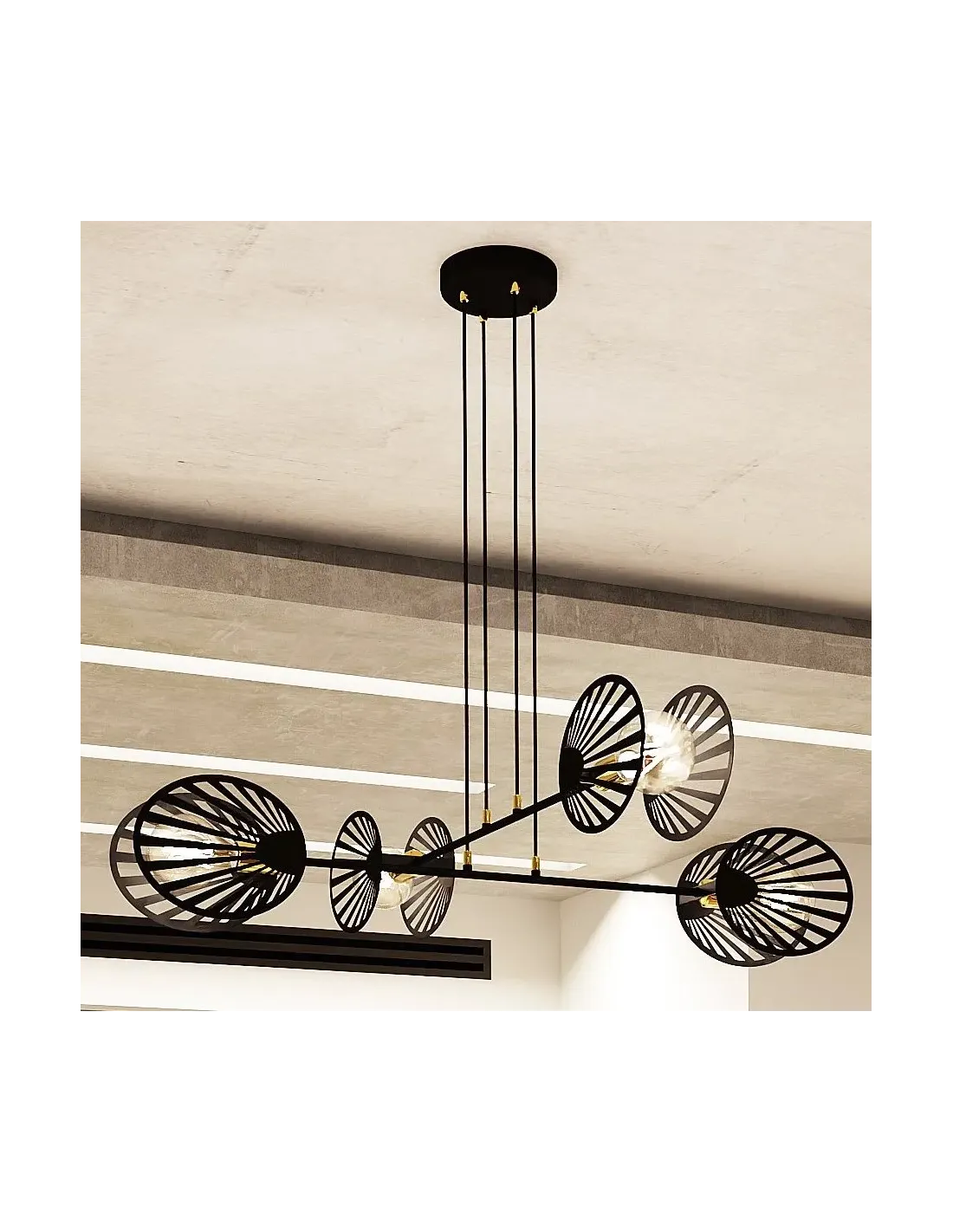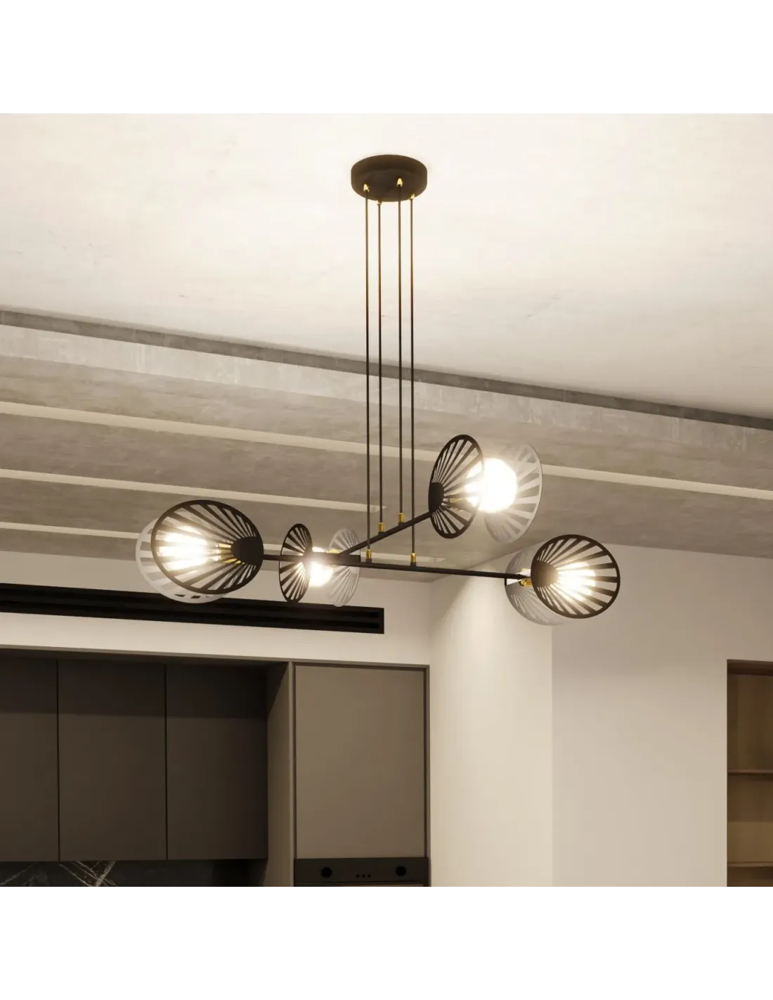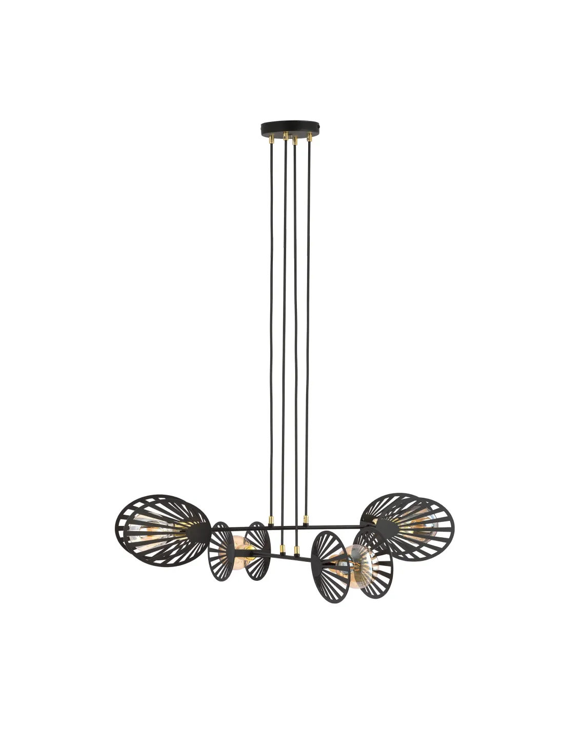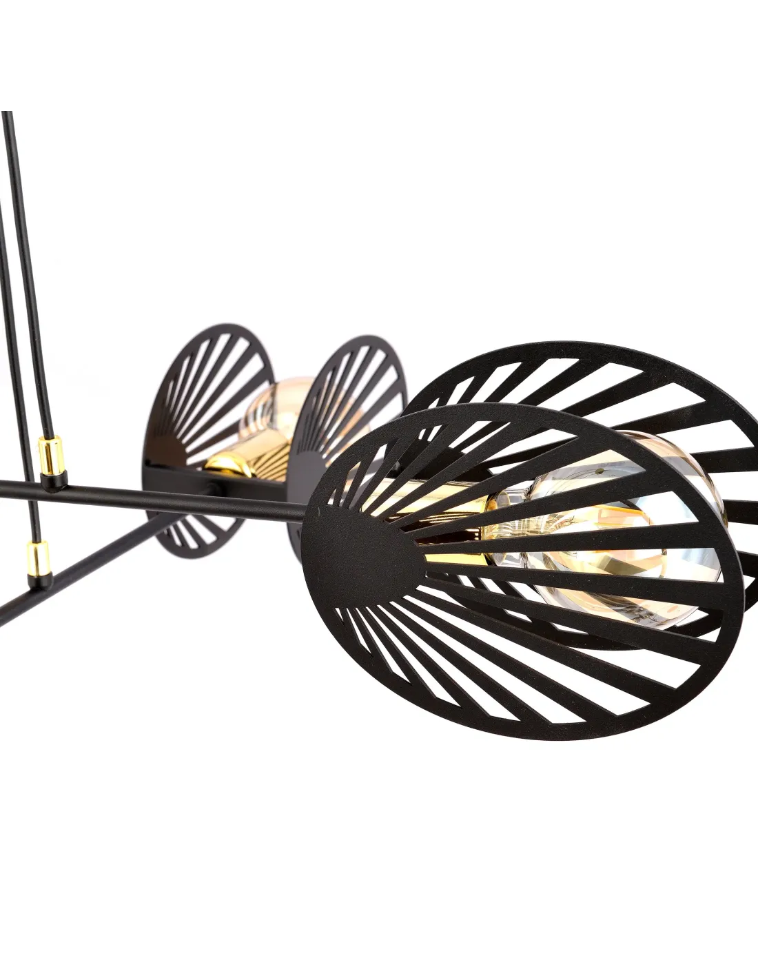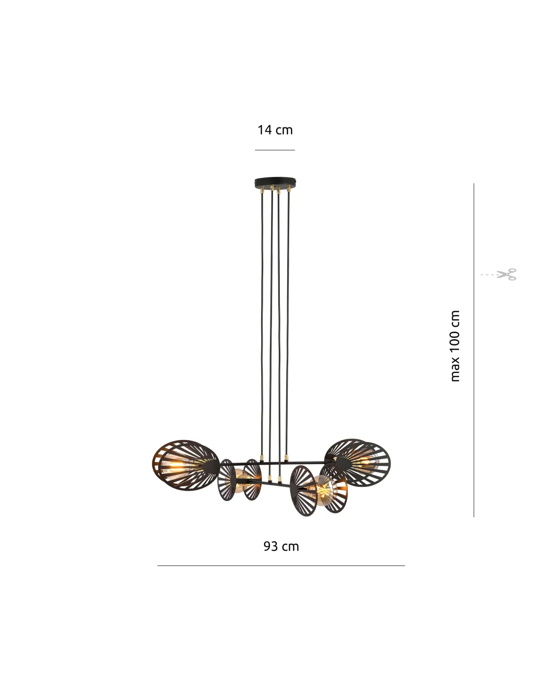 PLAYA 4 wyróżnia się ażurowymi kloszami w kształcie liści palmy, które w efektowny sposób przepuszczają światło. Brak tradycyjnej osłony żarówki sprawia, że sama żarówka staje się częścią kompozycji, nadając całości nowoczesnego, loftowego charakteru. To rozwiązanie, które łączy funkcjonalność z artystycznym designem.