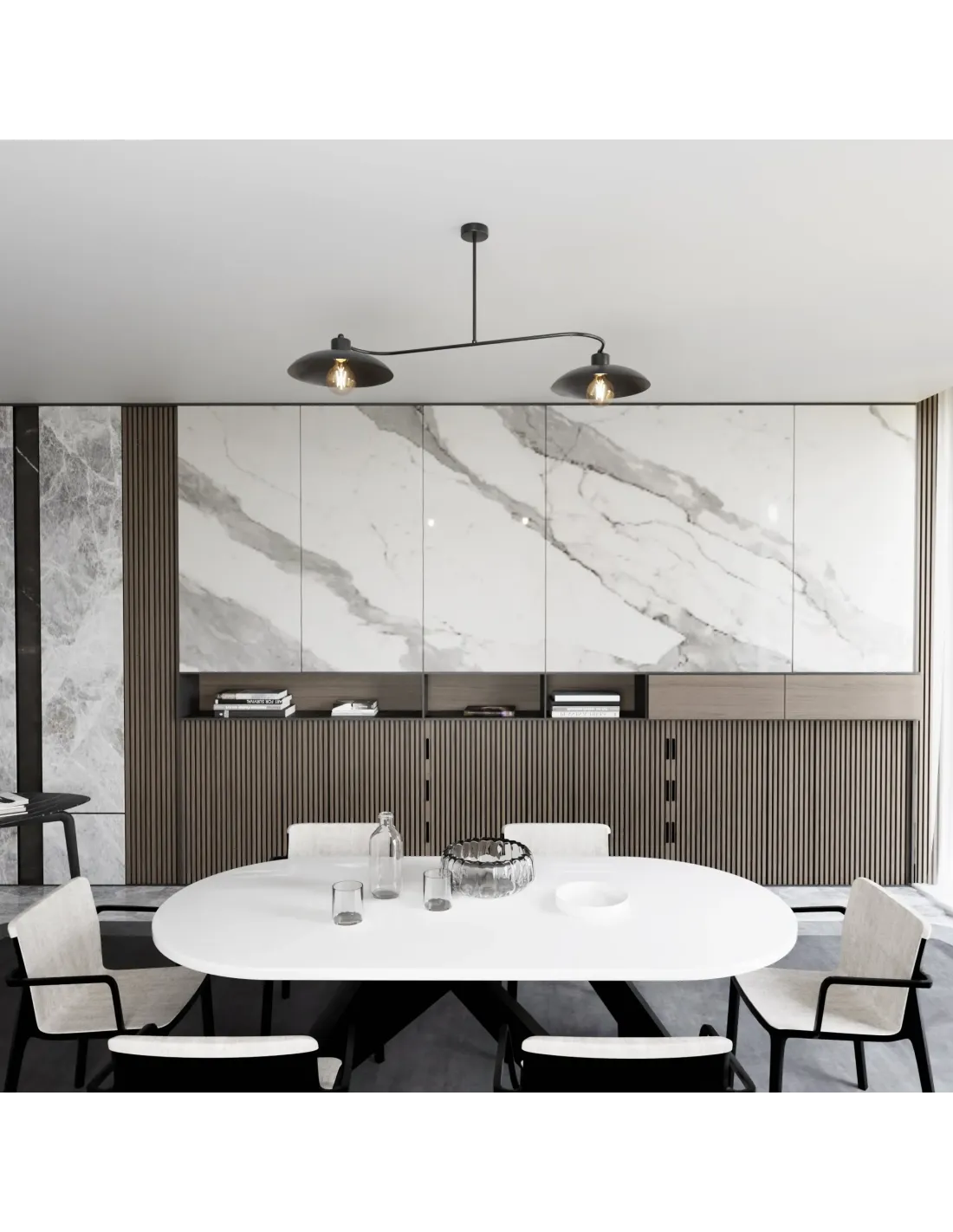 Dzięki dwóm otwartym kloszom lampa FOSTER równomiernie rozprowadza światło, zapewniając idealne oświetlenie nad stołem, wyspą kuchenną czy strefą wypoczynkową. Jej uniwersalny charakter pozwala dopasować ją do różnorodnych aranżacji – od surowych loftów po przytulne, minimalistyczne wnętrza.