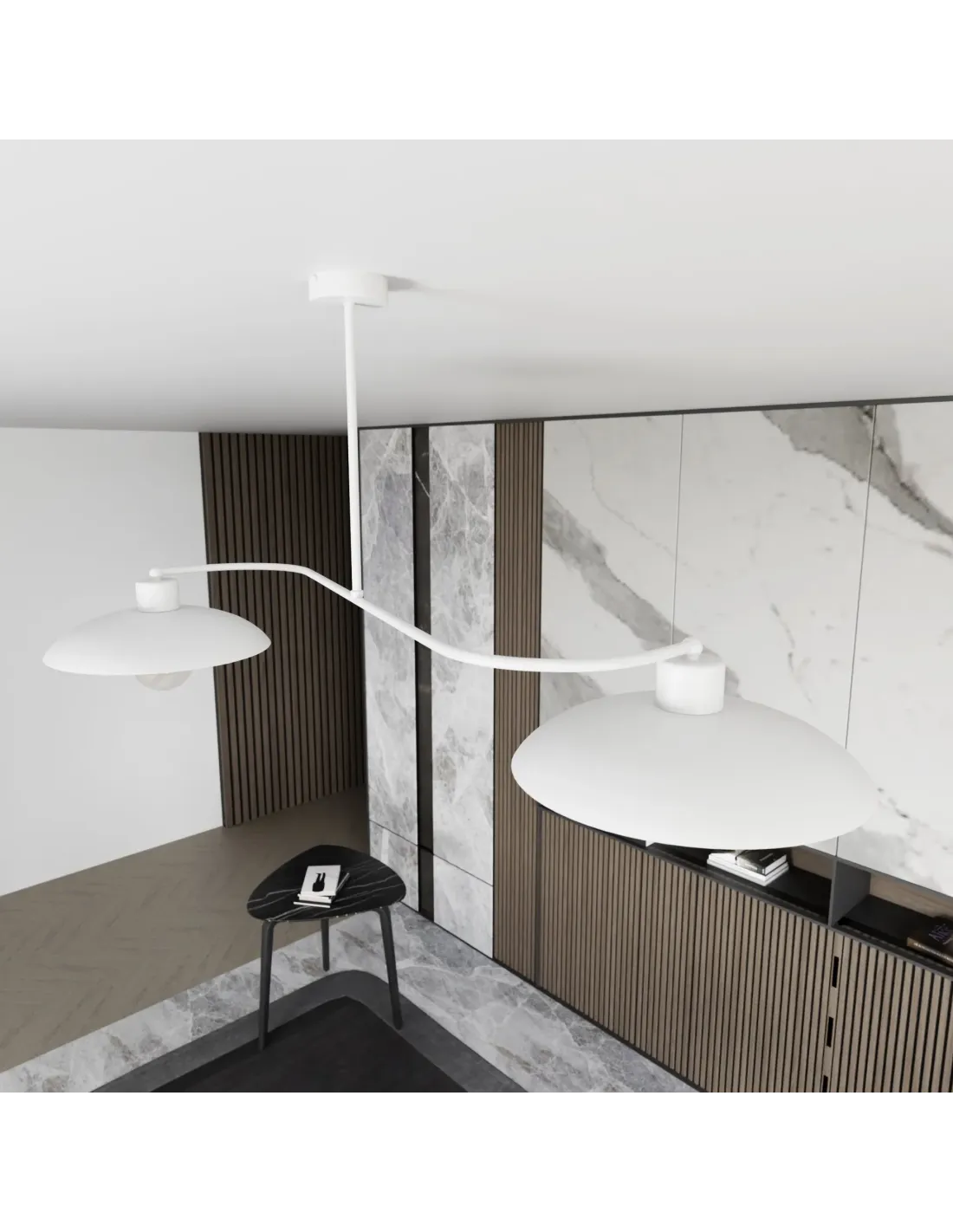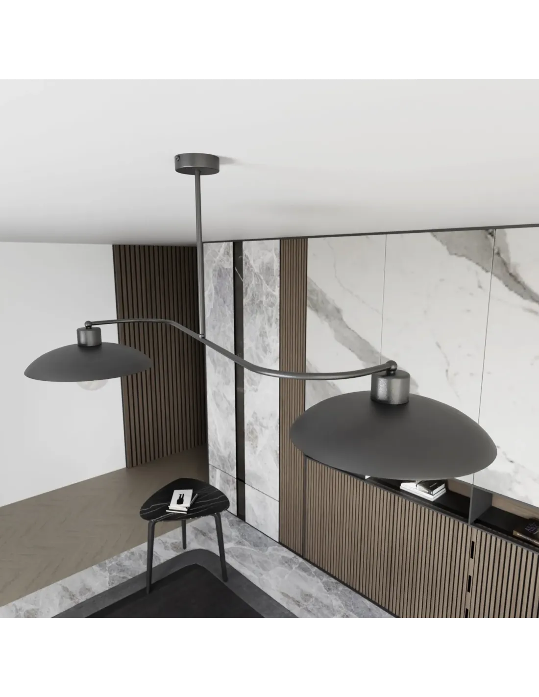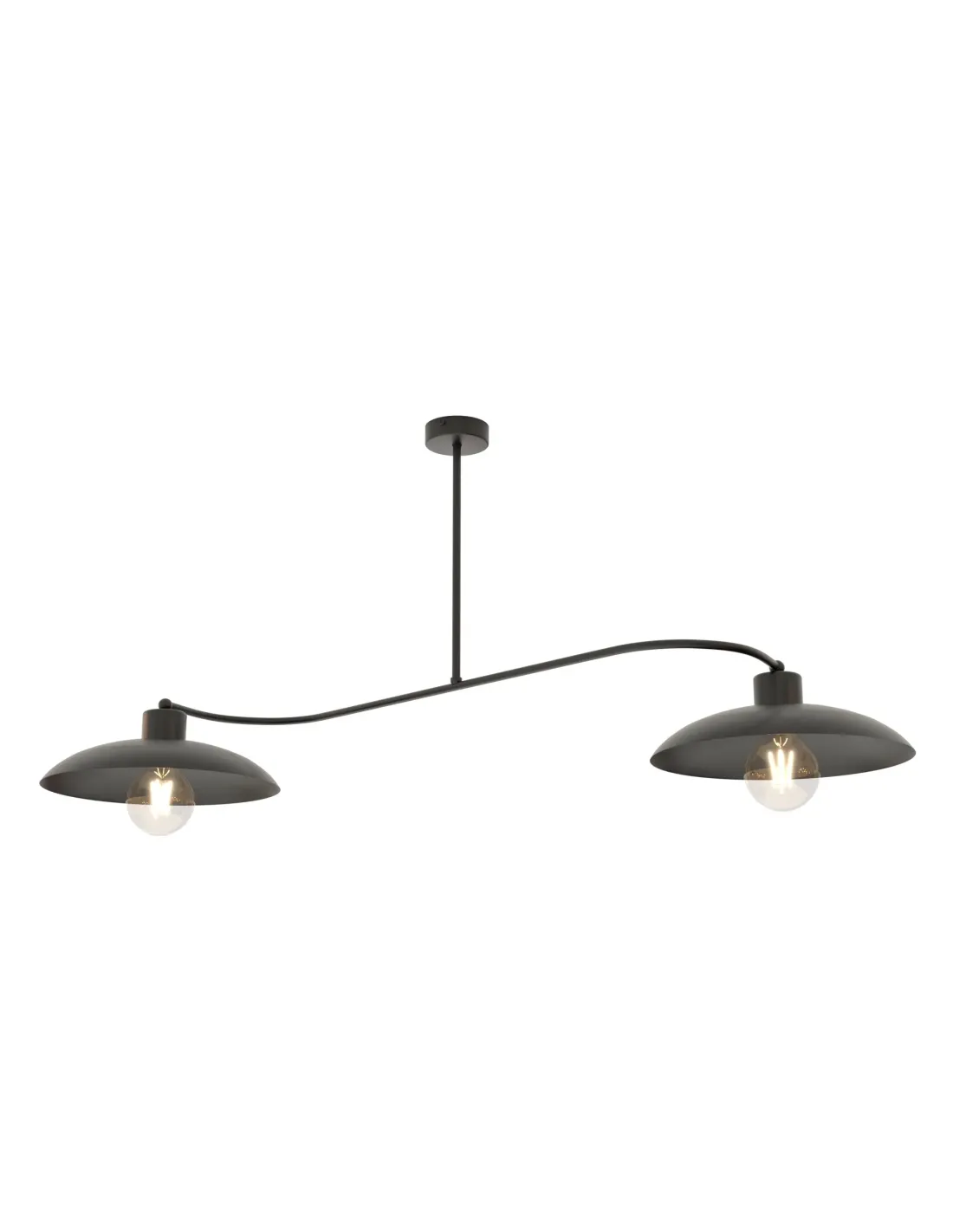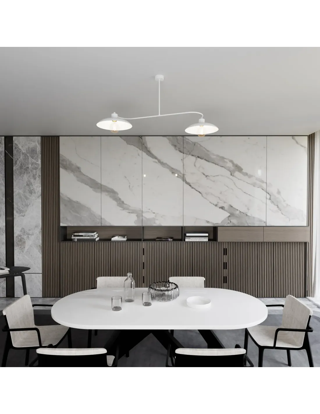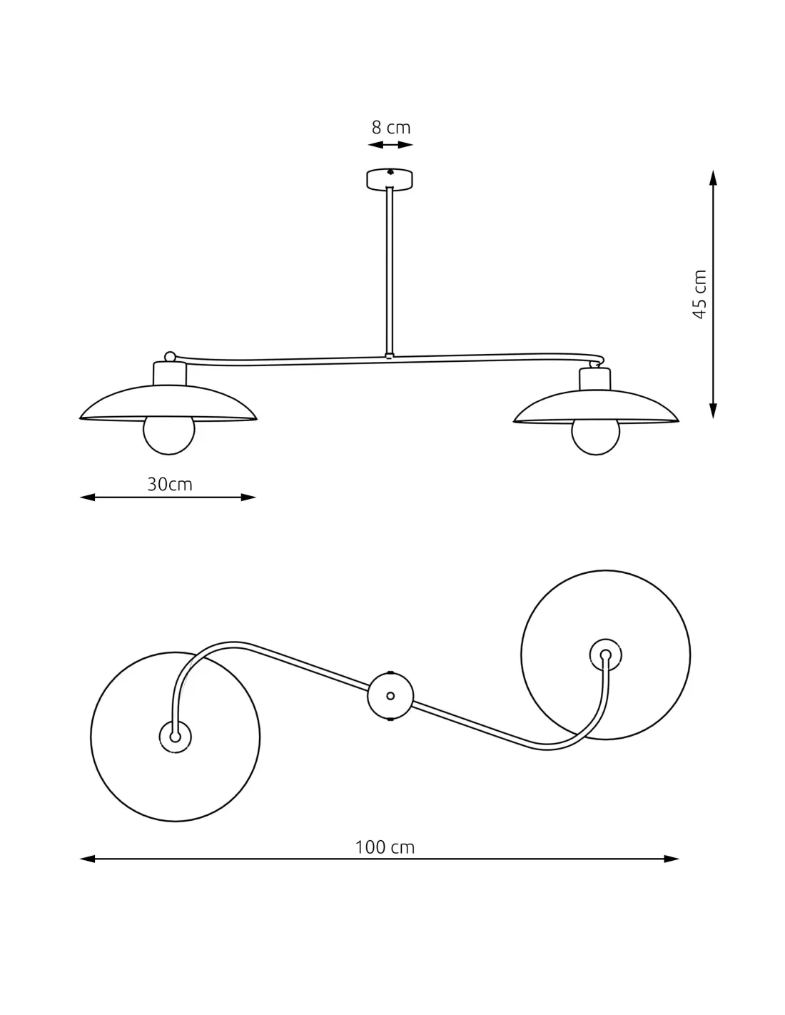 Lampa FOSTER 2 zachwyca prostotą i estetyką wykonania. Dwa metalowe klosze o średnicy 30 cm zostały umieszczone na belce o długości 100 cm, co pozwala na równomierne rozproszenie światła. Otwarta konstrukcja kloszy zapewnia doskonałe oświetlenie całego pomieszczenia bez efektu olśnienia.