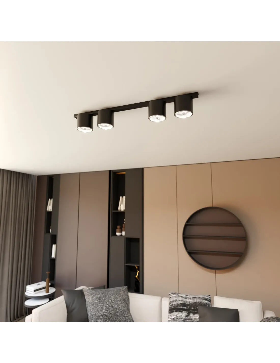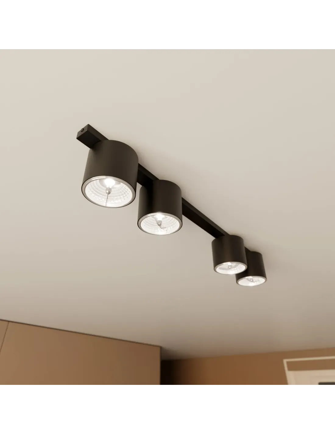 Lampa została wyposażona w cztery punkty świetlne z oprawami typu AR-111, które gwarantują mocne i równomierne światło. Dzięki temu sprawdzi się zarówno jako główne oświetlenie, jak i uzupełniające źródło światła w większych pomieszczeniach. Metalowa obudowa oraz precyzyjne wykończenie podkreślają nowoczesny charakter produktu, a minimalistyczny design czyni go ponadczasowym dodatkiem.