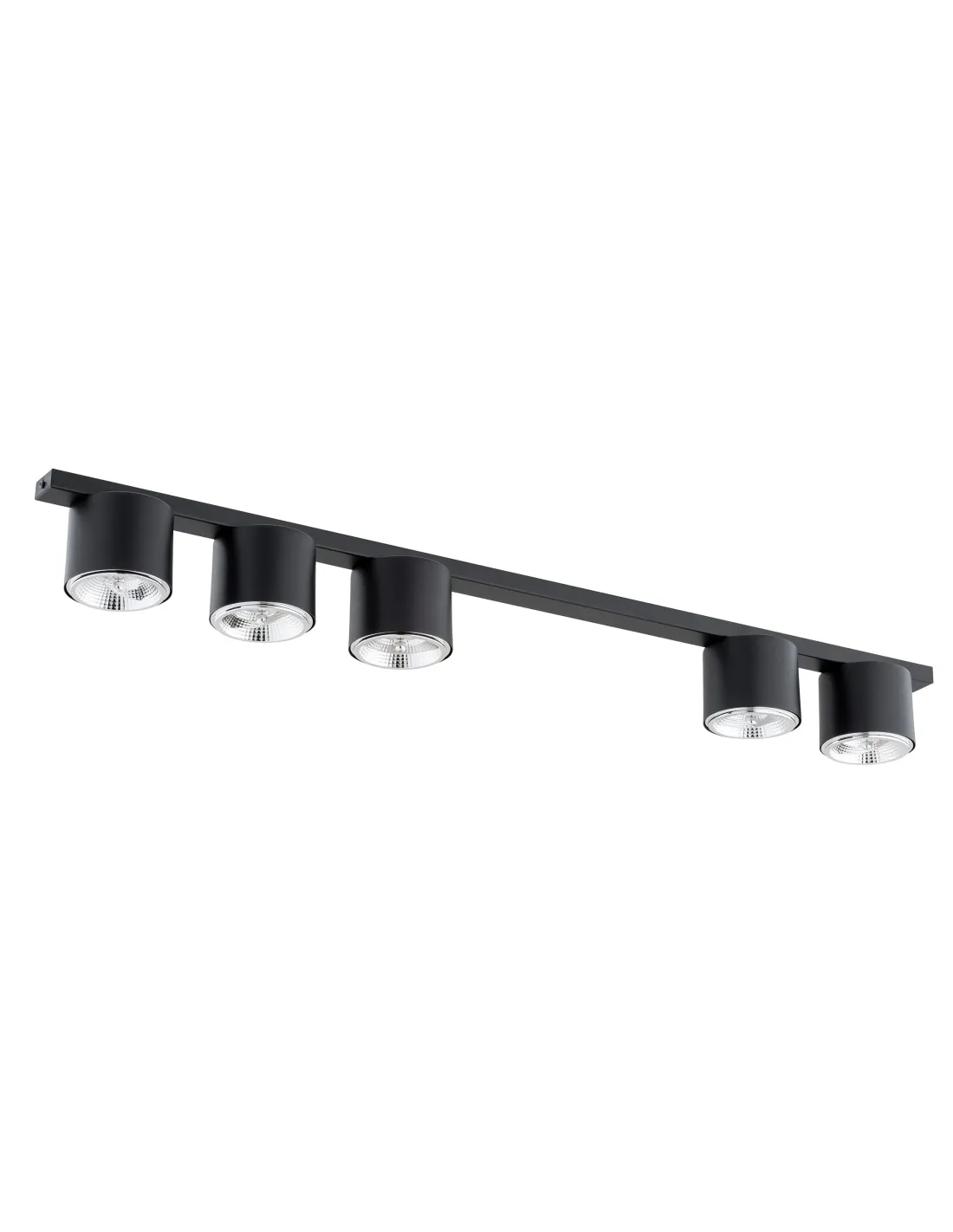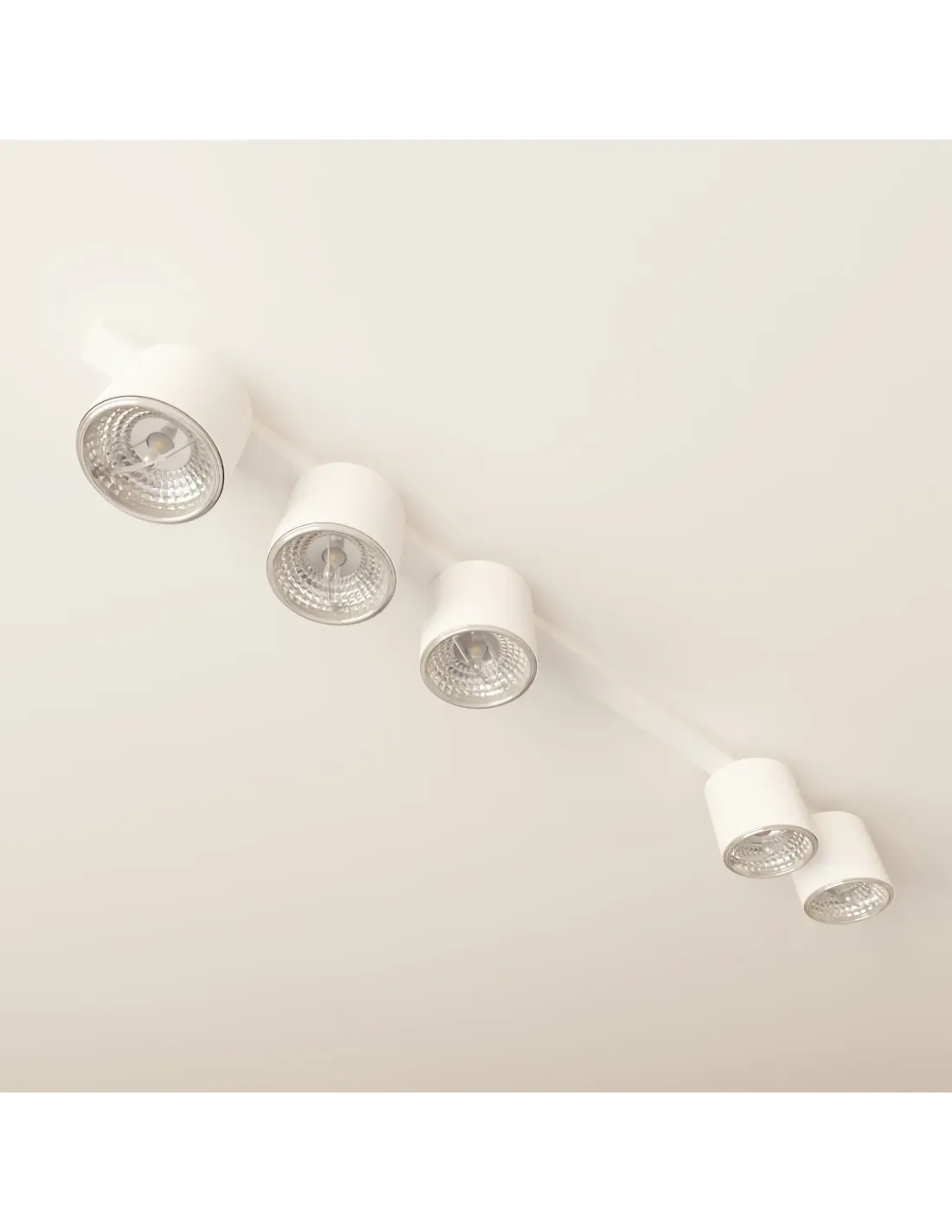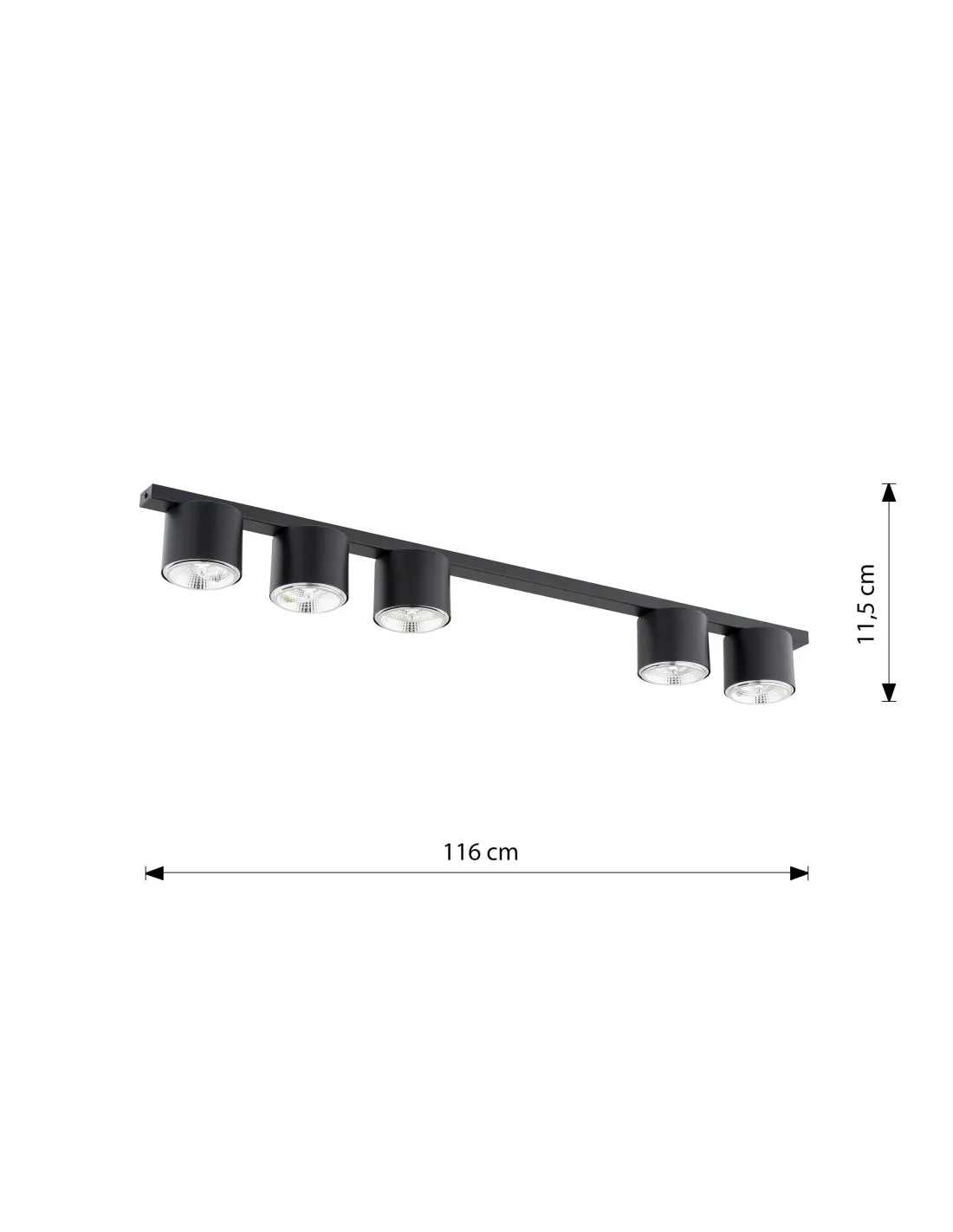 Lampa wyposażona jest w pięć punktów świetlnych z oprawami typu AR-111, które gwarantują doskonałą jasność i szeroki kąt oświetlenia. Metalowa konstrukcja i matowe wykończenie podkreślają nowoczesny charakter produktu, czyniąc go eleganckim dodatkiem do każdego wnętrza.