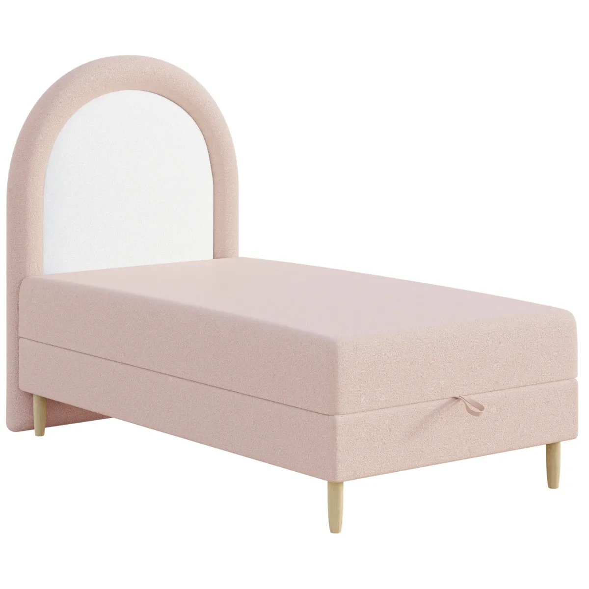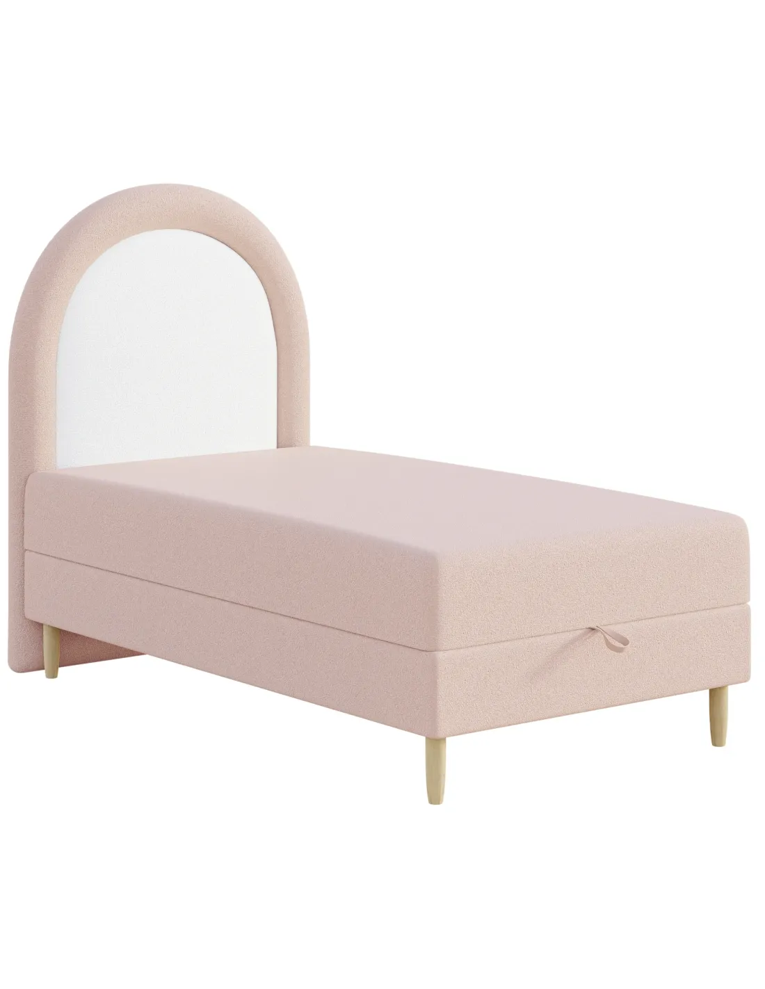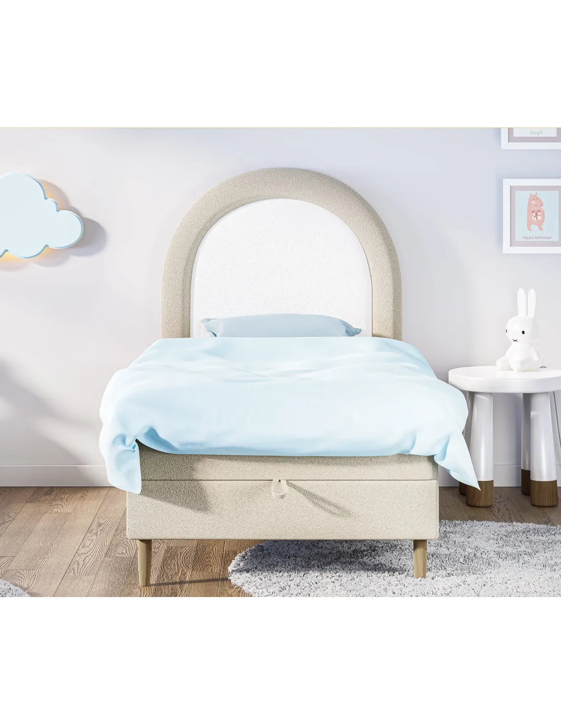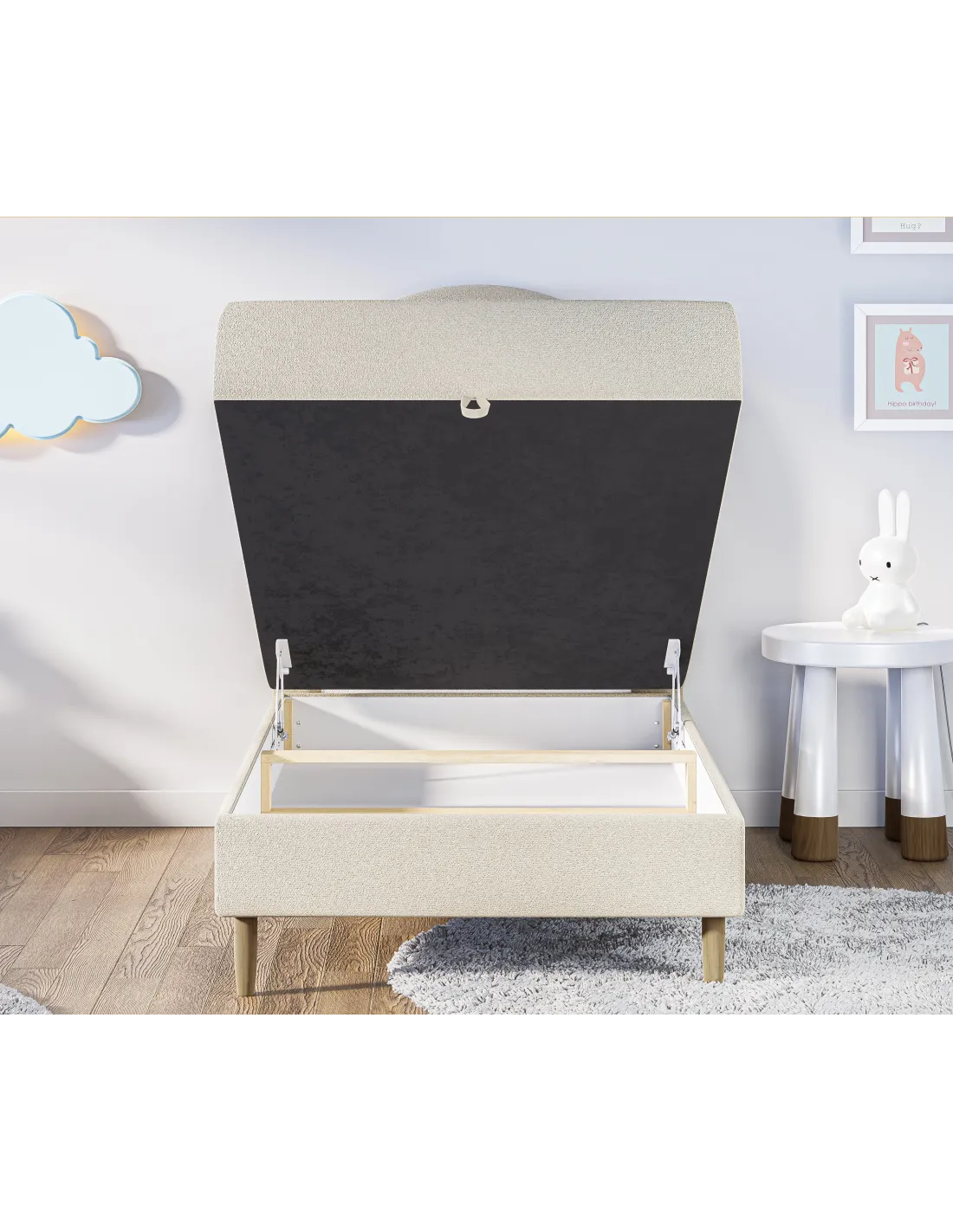 Baza łóżka została wykonana jako solidna skrzynia z pojemnikiem na pościel otwieranym od przodu – idealna na przechowywanie zabawek, pościeli czy sezonowych tekstyliów. Materac bazowy oparty jest na sprężynie typu bonell i piance T-25 o wysokości 20 cm, co gwarantuje odpowiednie wsparcie dla kręgosłupa oraz komfortowy sen. Całość uzupełniają drewniane nogi o wysokości 12 cm, które nadają lekkości formie i podkreślają naturalny charakter mebla.