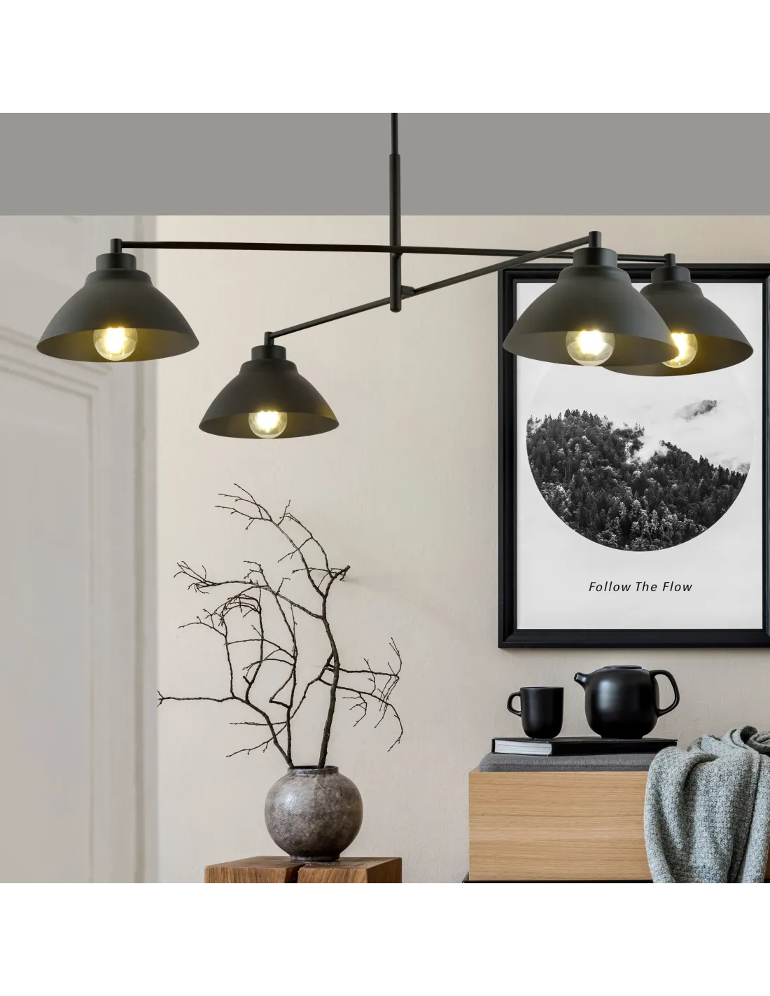 MAVERICK 4-punktowa to model, który z powodzeniem odnajdzie się w dużych jadalniach, nowoczesnych kuchniach oraz otwartych salonach. Cztery źródła światła doskonale doświetlają przestrzeń, a metalowe klosze kierujące światło w dół podkreślają strefy funkcjonalne wnętrza. Konstrukcja lampy nadaje całości industrialnego charakteru, wpisując się w aktualne trendy wnętrzarskie.