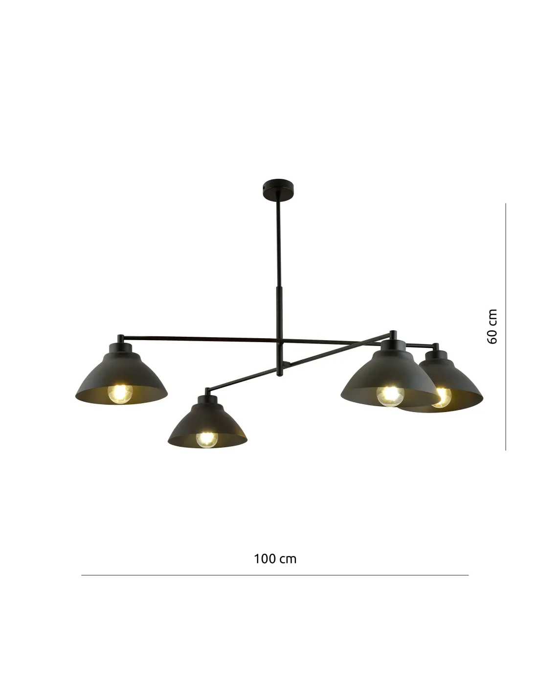 Lampa została wykonana z wysokiej jakości metalu, co gwarantuje jej trwałość i niezawodność. Dzięki zastosowaniu czterech źródeł światła E27, daje równomierne i mocne oświetlenie. Stała wysokość 58 cm i szerokość 100 cm sprawiają, że model ten doskonale wpisuje się w przestronne wnętrza, zapewniając komfort użytkowania i elegancki wygląd.