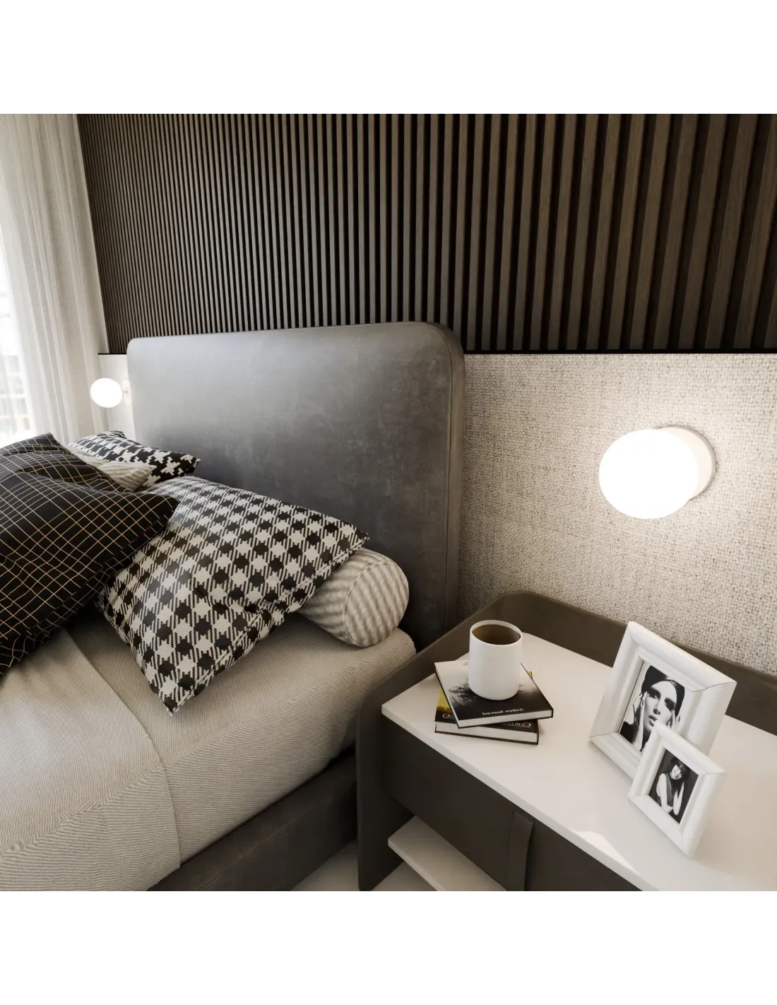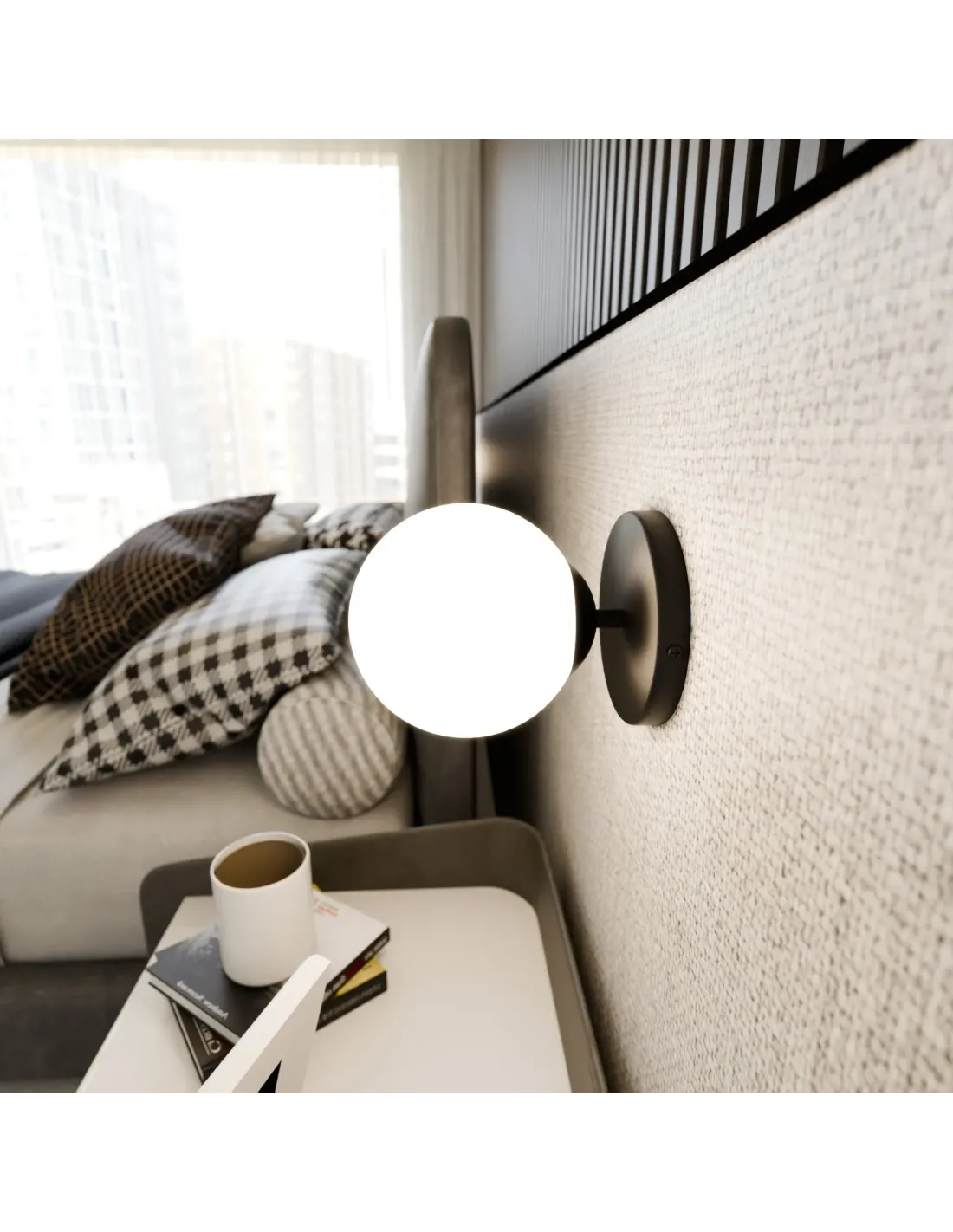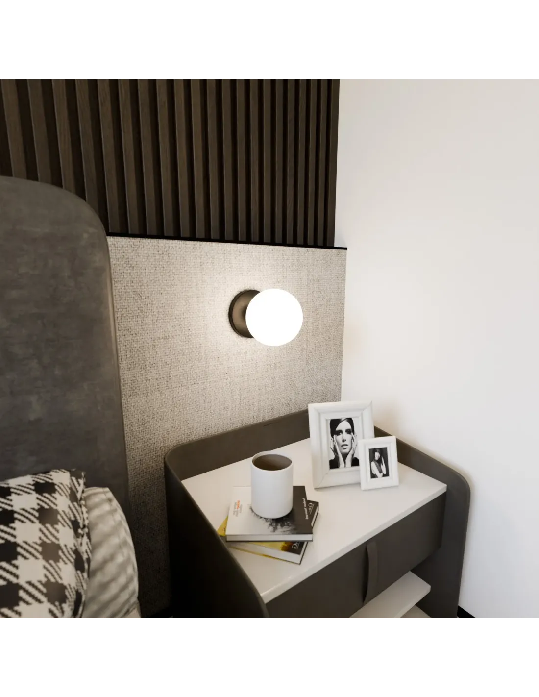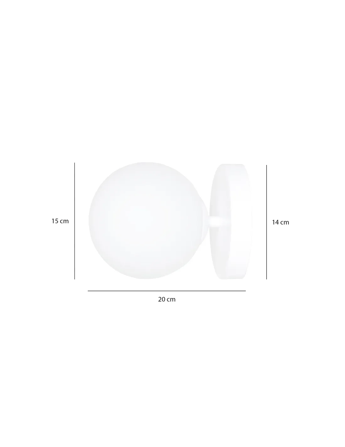 Największą ozdobą lampy jest mleczny, szklany klosz o średnicy 15 cm, który łagodnie rozprasza światło, tworząc ciepły i przytulny klimat. Światło nie razi, lecz delikatnie rozlewa się po ścianie, co czyni kinkiet idealnym rozwiązaniem na wieczorne oświetlenie lub jako element warstwowego planu świetlnego.