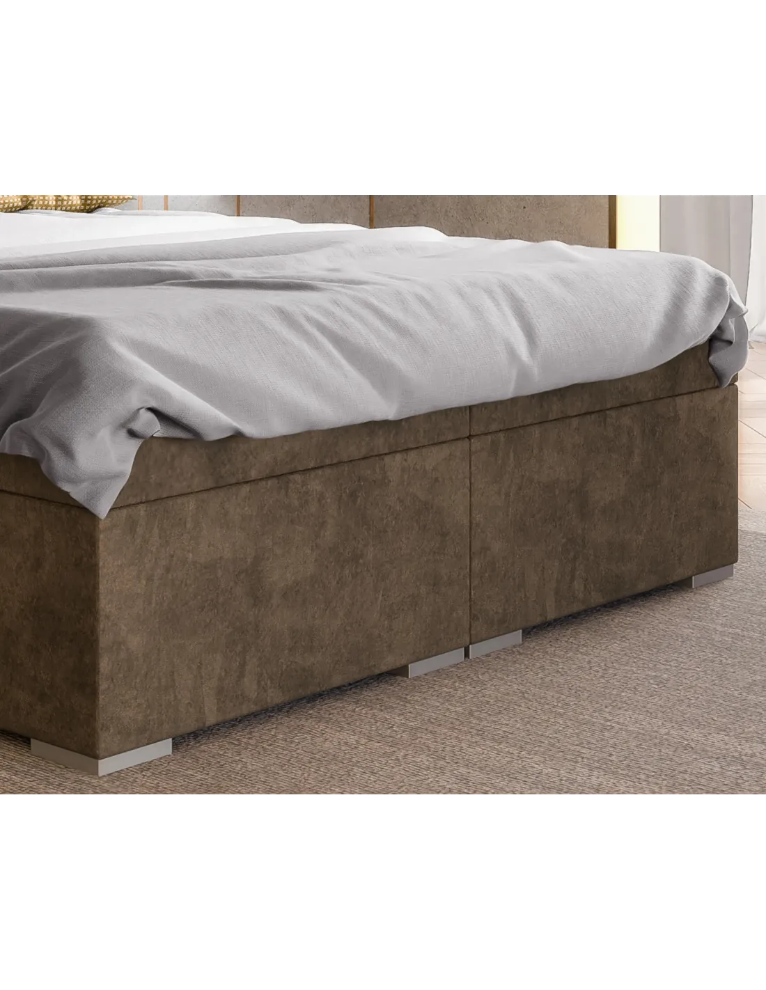 Podstawa łóżka została wyposażona w dwie pojemne skrzynie na pościel, otwierane z boków, co czyni model niezwykle praktycznym rozwiązaniem do codziennego użytku. To idealne miejsce do przechowywania pościeli, koców czy ubrań sezonowych, dzięki czemu przestrzeń w sypialni pozostaje zawsze uporządkowana. Dodatkowo, tkanina antypoślizgowa zastosowana w ekranach łóżka zwiększa jego stabilność oraz bezpieczeństwo użytkowania.