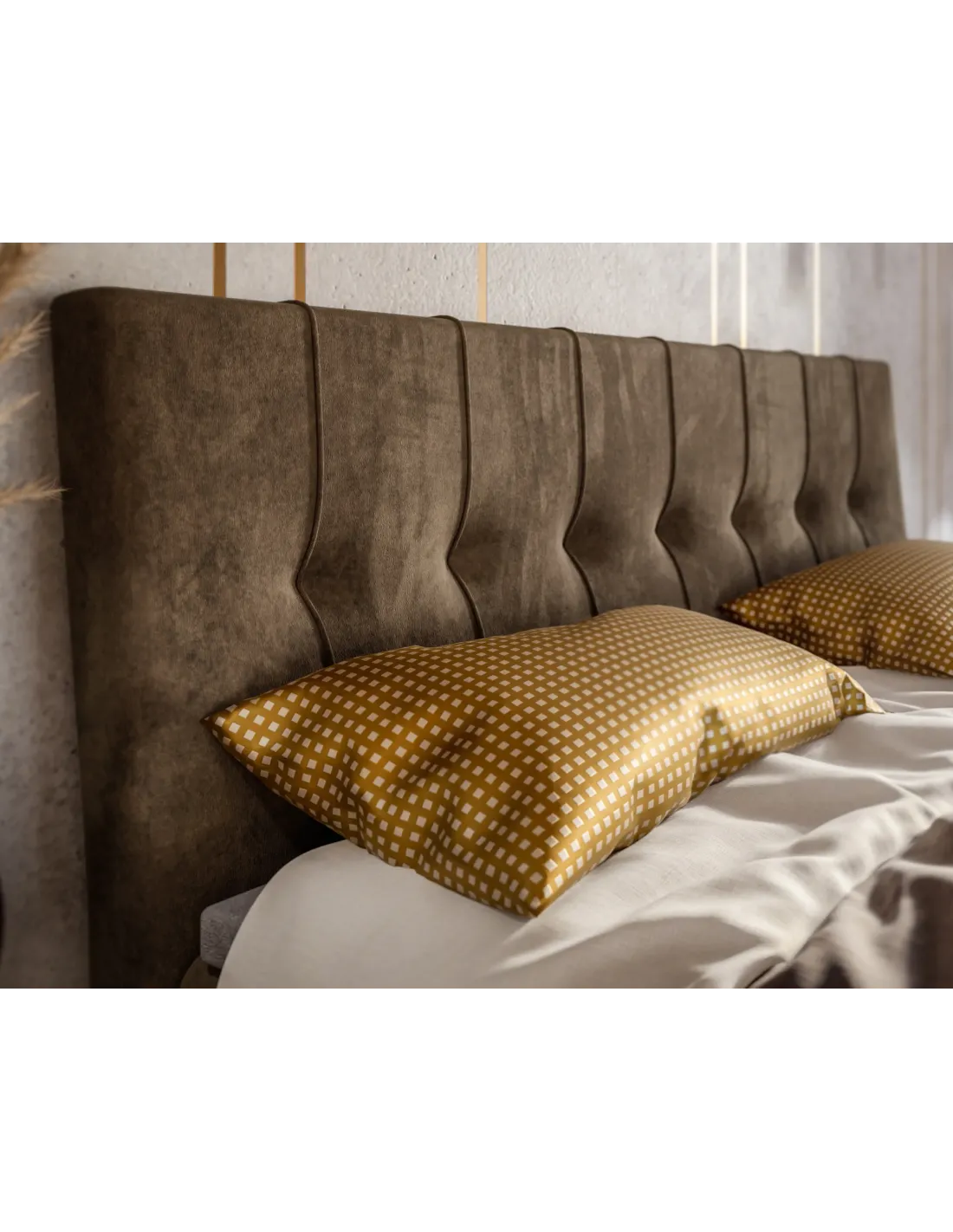 • Eleganckie wezgłowie z pionowymi przeszyciami i rzędem dekoracyjnych guzików