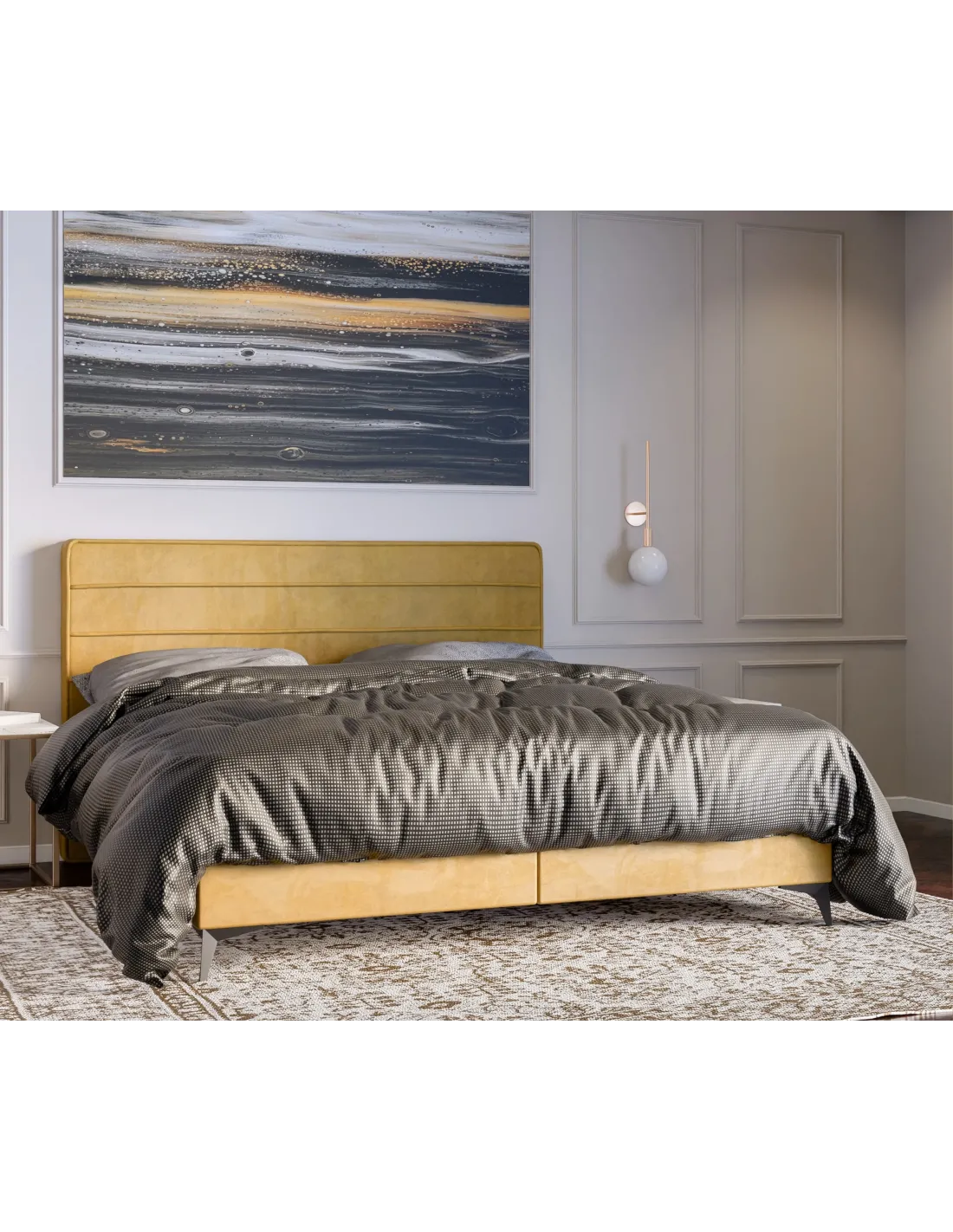 Model HORIZO łączy minimalistyczny styl z luksusowym wykończeniem. Poziome przeszycia oraz delikatna lamówka na wezgłowiu tworzą efektowną, symetryczną kompozycję, która doskonale wpisuje się w nowoczesne aranżacje sypialni. Metalowe nogi o różnorodnych wykończeniach pozwalają dopasować mebel do indywidualnego stylu wnętrza – od klasycznej elegancji po loftową prostotę. Stabilna konstrukcja oraz staranność wykonania gwarantują trwałość i wygodę użytkowania przez długie lata. Ergonomiczna wysokość siedziska ułatwia codzienne korzystanie z łóżka, a miękkie wezgłowie zapewnia komfort nawet podczas długich wieczorów spędzonych z książką lub przy filmie.