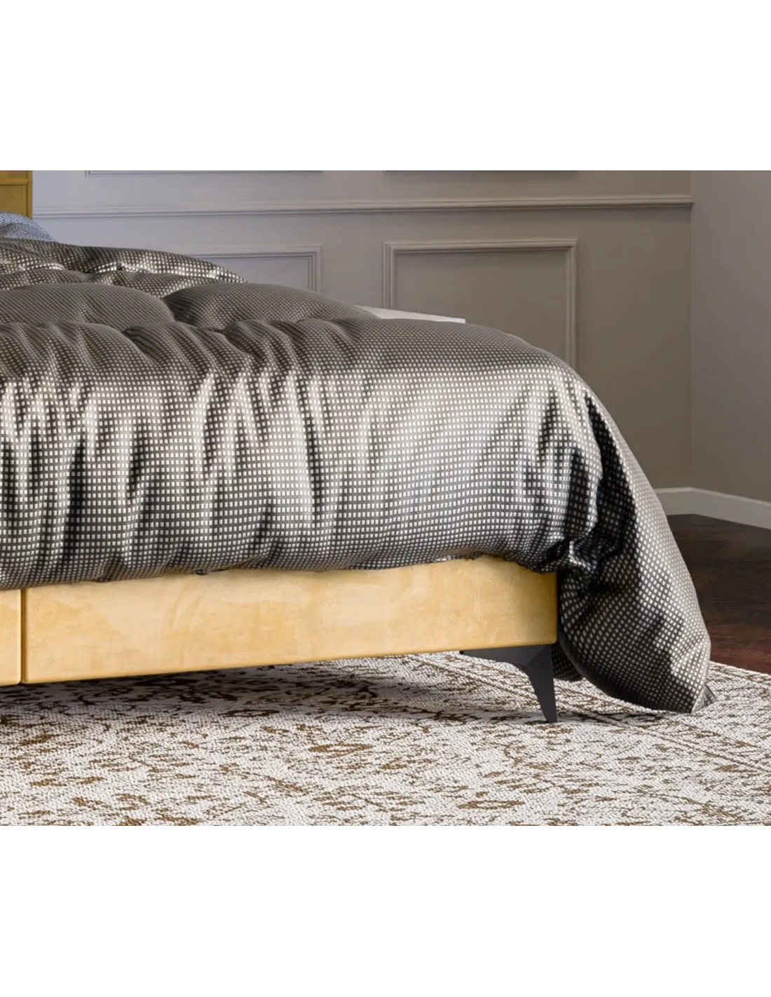 Solidna podstawa z białej płyty meblowej gwarantuje trwałość i stabilność konstrukcji, a zastosowanie tkaniny antypoślizgowej w ekranach łóżka zwiększa bezpieczeństwo użytkowania, zapobiegając przesuwaniu się materaca. Całość uzupełniają metalowe nogi dostępne w wykończeniach: czarny mat, złoto lub chrom, które dodają nowoczesnego charakteru i elegancji. Wielopoziomowa konstrukcja łóżka zapewnia ergonomiczną wysokość, łącząc wygodę z estetyką.