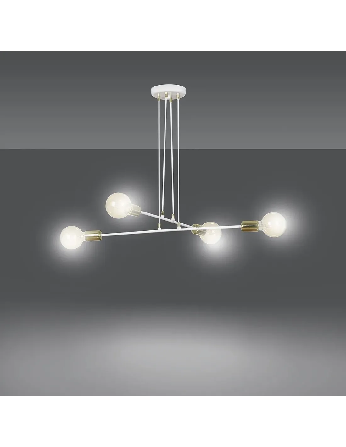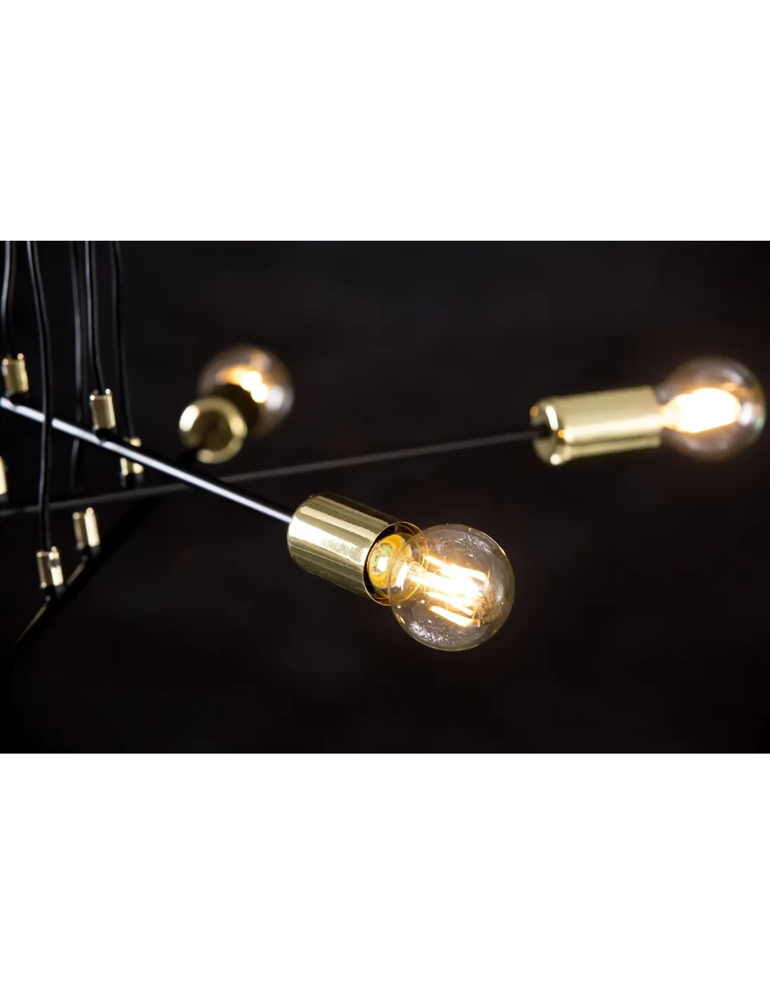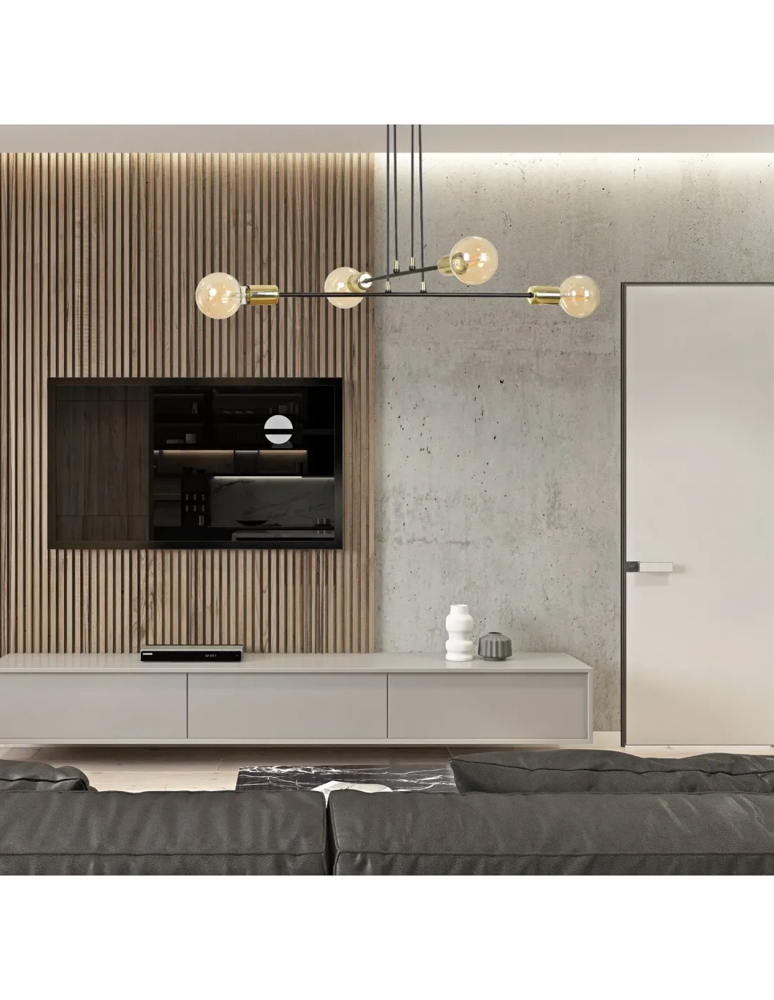 Brak kloszy pozwala na pełną ekspozycję żarówek, co otwiera możliwości doboru efektownych źródeł światła – idealnych dla osób ceniących nowoczesne i industrialne akcenty. Złote detale wprowadzają do wnętrza nutę luksusu i harmonijnie współgrają zarówno z czernią, jak i bielą konstrukcji. Dzięki regulacji wysokości i kompaktowej średnicy podsufitki, lampa może być zamontowana zarówno centralnie, jak i jako część większej kompozycji oświetleniowej.