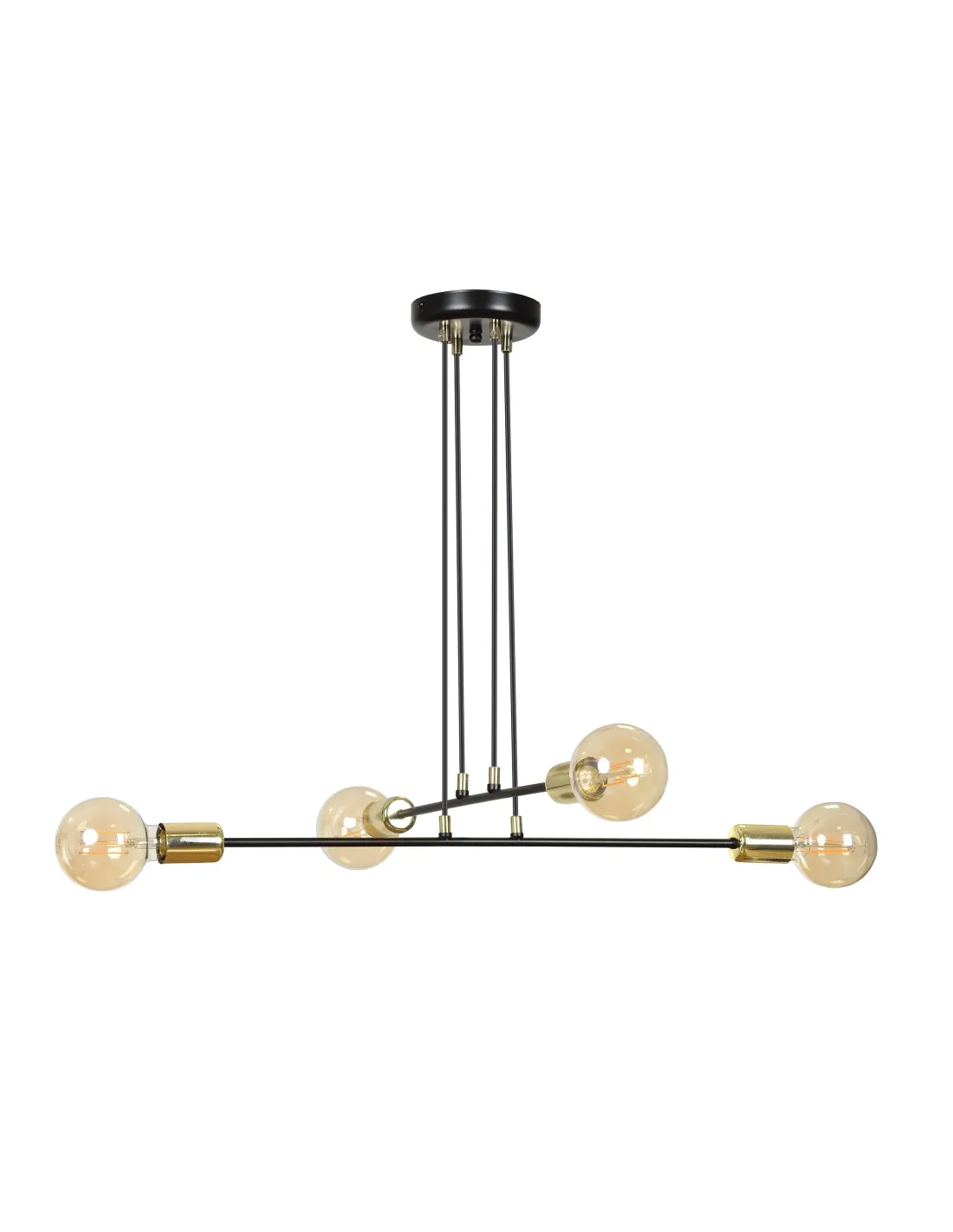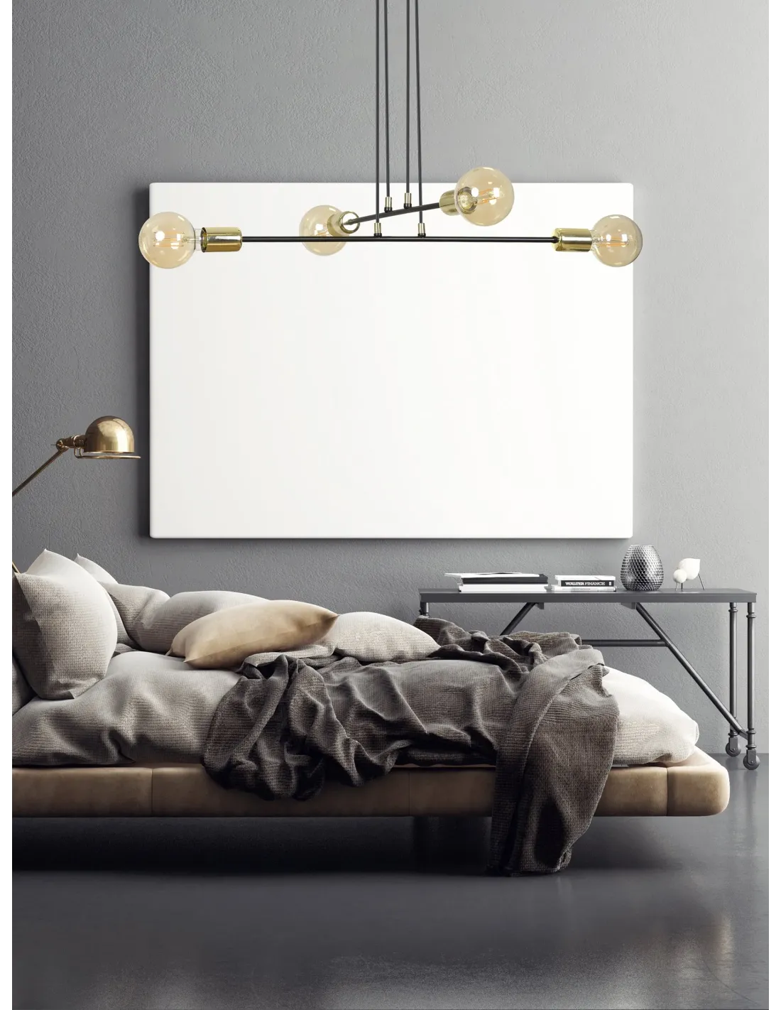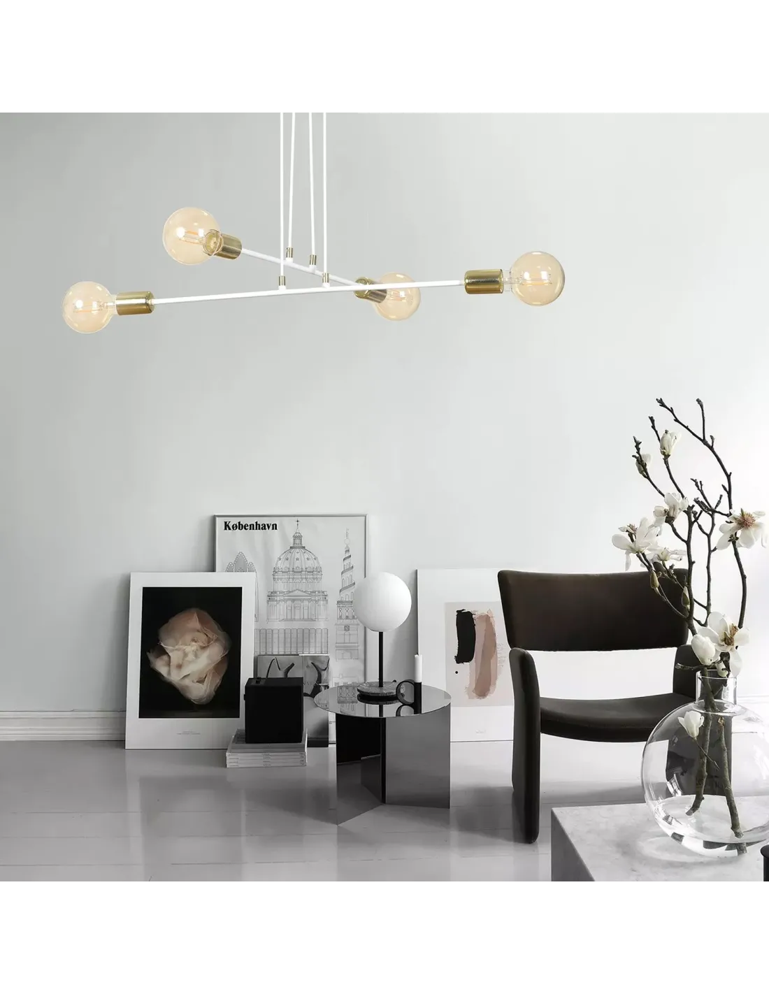 Brak kloszy pozwala na pełną ekspozycję żarówek, co otwiera możliwości doboru efektownych źródeł światła – idealnych dla osób ceniących nowoczesne i industrialne akcenty. Złote detale wprowadzają do wnętrza nutę luksusu i harmonijnie współgrają zarówno z czernią, jak i bielą konstrukcji. Dzięki regulacji wysokości i kompaktowej średnicy podsufitki, lampa może być zamontowana zarówno centralnie, jak i jako część większej kompozycji oświetleniowej.
