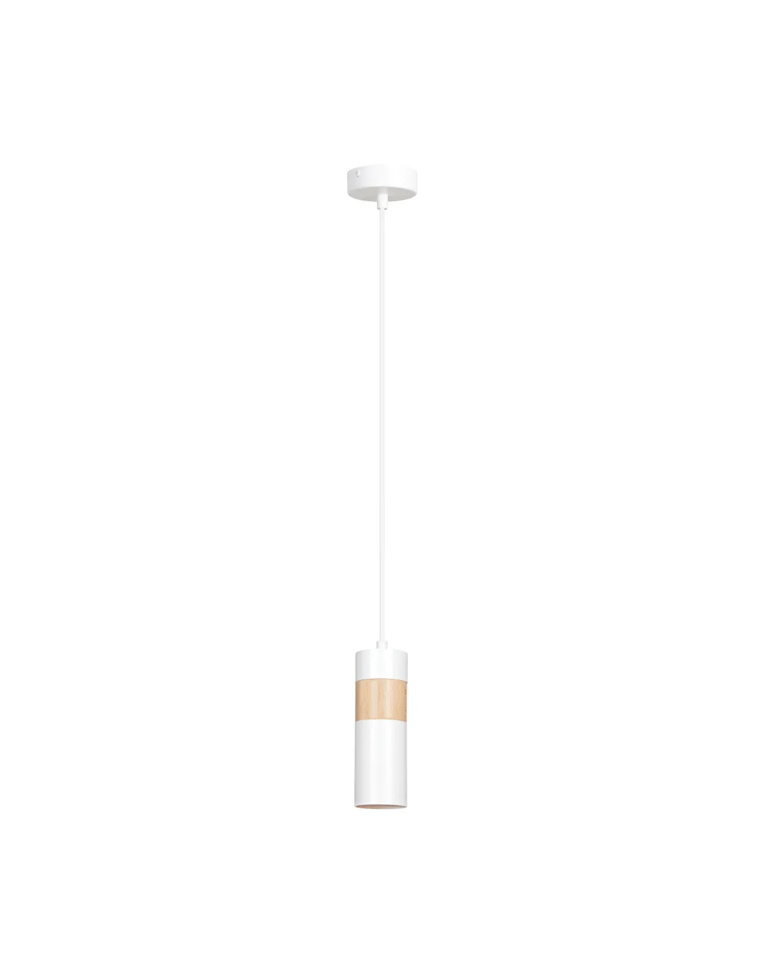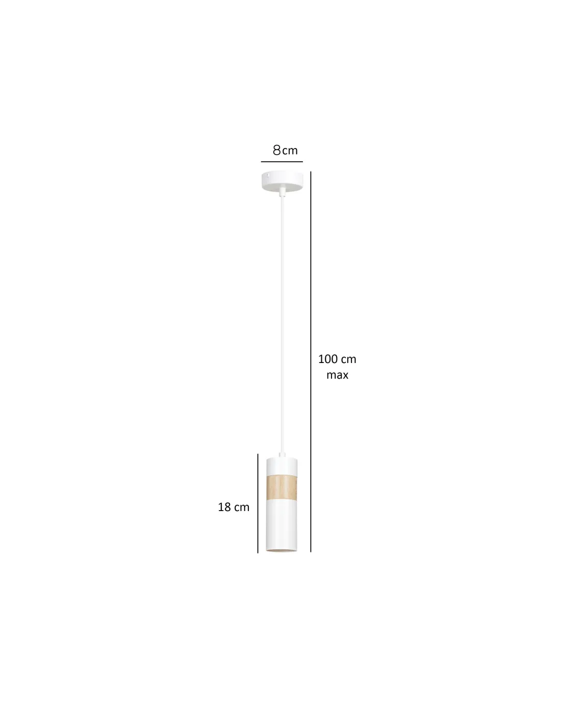 Prosty klosz wykonany z malowanego proszkowo metalu w kolorze białym nadaje lampie lekkości i estetycznego charakteru, a detal z naturalnego drewna w górnej części oprawy wprowadza przytulność i naturalne ciepło. Regulowana wysokość zawieszenia do 100 cm pozwala idealnie dopasować lampę do rodzaju i funkcji pomieszczenia – może być zamontowana nisko nad blatem roboczym lub wyżej, jako subtelny akcent świetlny.