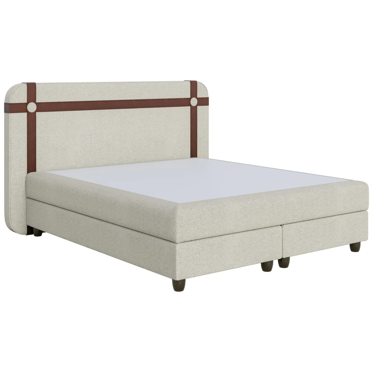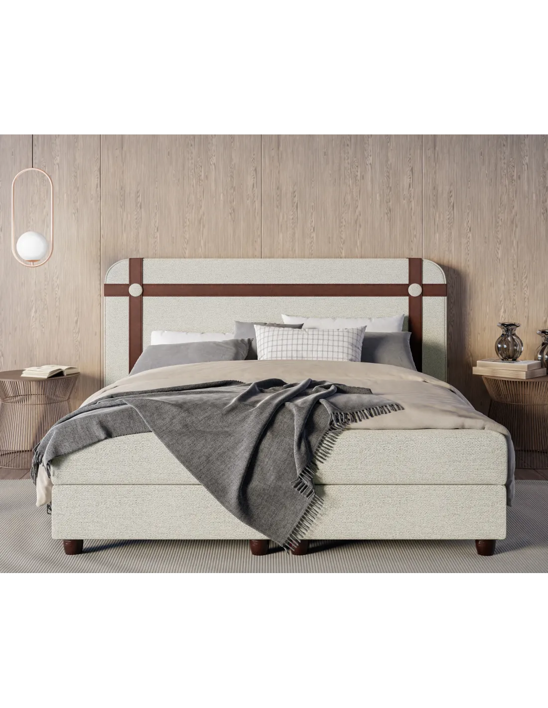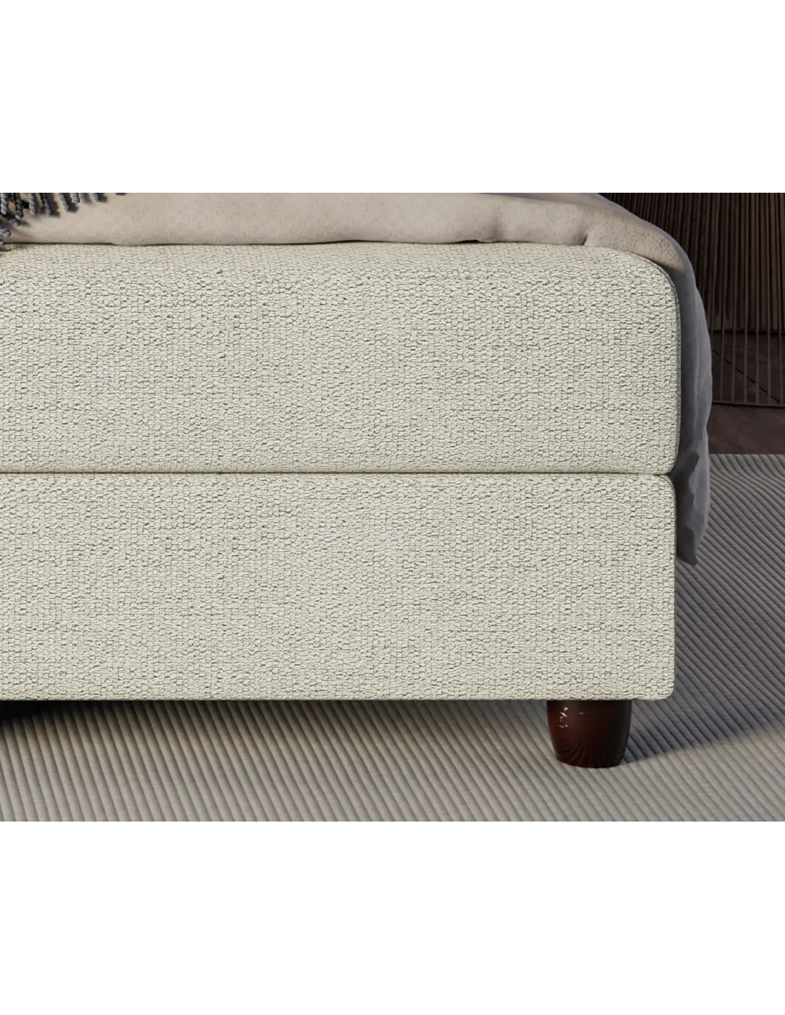 Solidna drewniana baza łóżka, pozbawiona pojemnika na pościel, podkreśla minimalistyczny charakter konstrukcji, zachowując jednocześnie pełną stabilność i trwałość. Tkanina antypoślizgowa zastosowana w ekranach łóżka zwiększa bezpieczeństwo i wygodę użytkowania, zapobiegając przesuwaniu się materaca. Drewniane nogi doskonale komponują się z całością, dodając konstrukcji lekkości i naturalnego wdzięku, a ich wysokość zapewnia łatwy dostęp pod łóżko i komfort codziennego użytkowania.