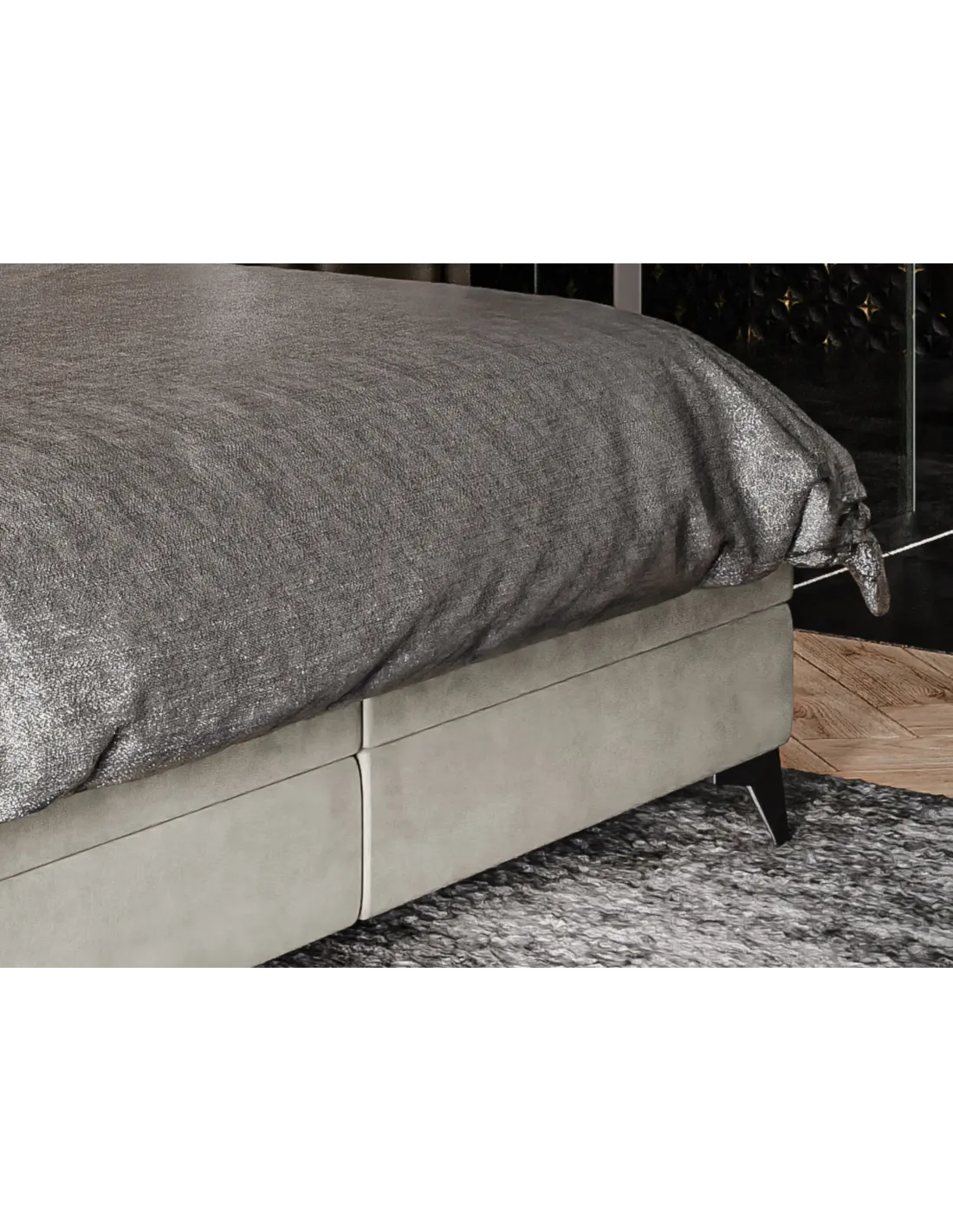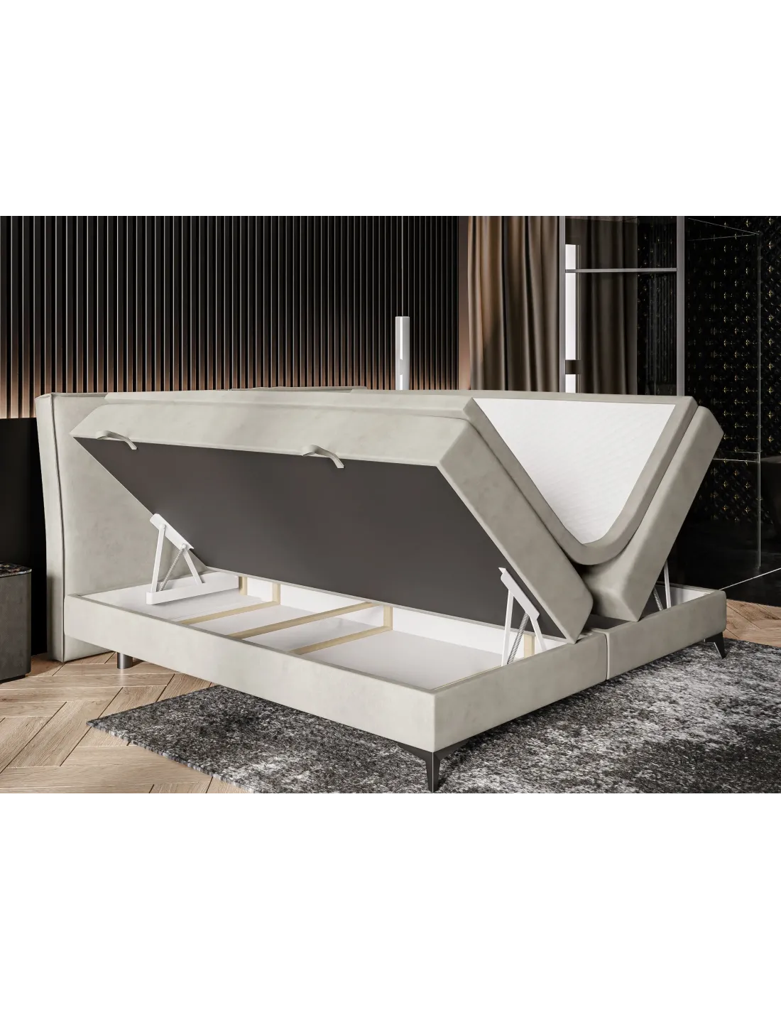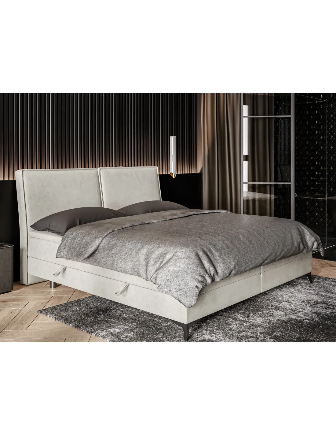 Model LOLLY LAVERTO to idealne rozwiązanie dla osób, które cenią wygodę i minimalistyczny, ale elegancki wygląd. Pojemne skrzynie na pościel otwierane na boki to praktyczny element ułatwiający przechowywanie, co pozwala utrzymać porządek i maksymalnie wykorzystać przestrzeń sypialni. Dzięki solidnej konstrukcji i dopracowanym detalom łóżko Lolly zachwyca zarówno funkcjonalnością, jak i estetyką. Proste, symetryczne przeszycia i starannie dobrane proporcje wezgłowia nadają mu subtelnej elegancji, a metalowe nogi podkreślają jego współczesny charakter.