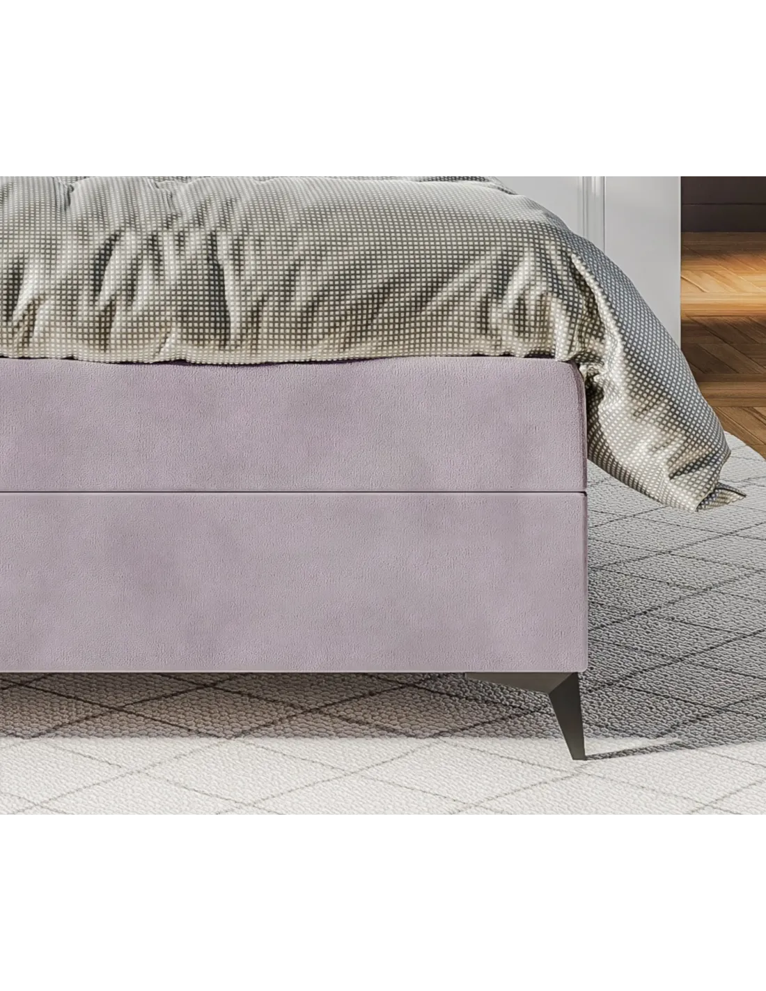 Podstawa łóżka została wykonana z solidnej płyty meblowej, co gwarantuje trwałość i stabilność konstrukcji. Dwie pojemne skrzynie na pościel otwierane na boki stanowią niezwykle praktyczne rozwiązanie, pozwalające w łatwy sposób przechowywać pościel, koce lub inne akcesoria, utrzymując porządek w sypialni. W ekranach zastosowano tkaninę antypoślizgową, która zapobiega przesuwaniu się materaca, zwiększając bezpieczeństwo użytkowania. Całość uzupełniają metalowe nogi w kolorze czarnym matowym lub chromowanym, które dodają konstrukcji lekkości i elegancji, jednocześnie zapewniając stabilność.