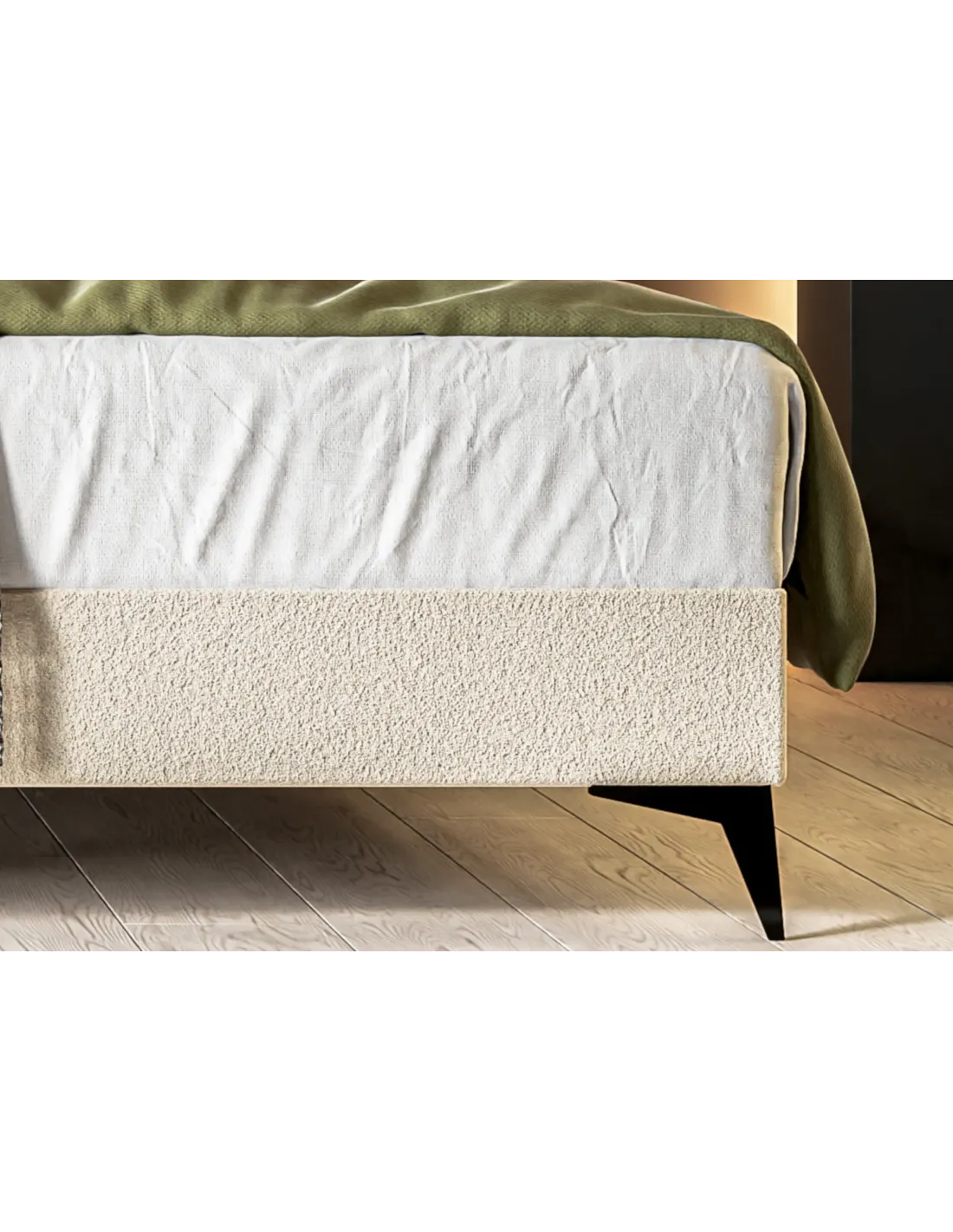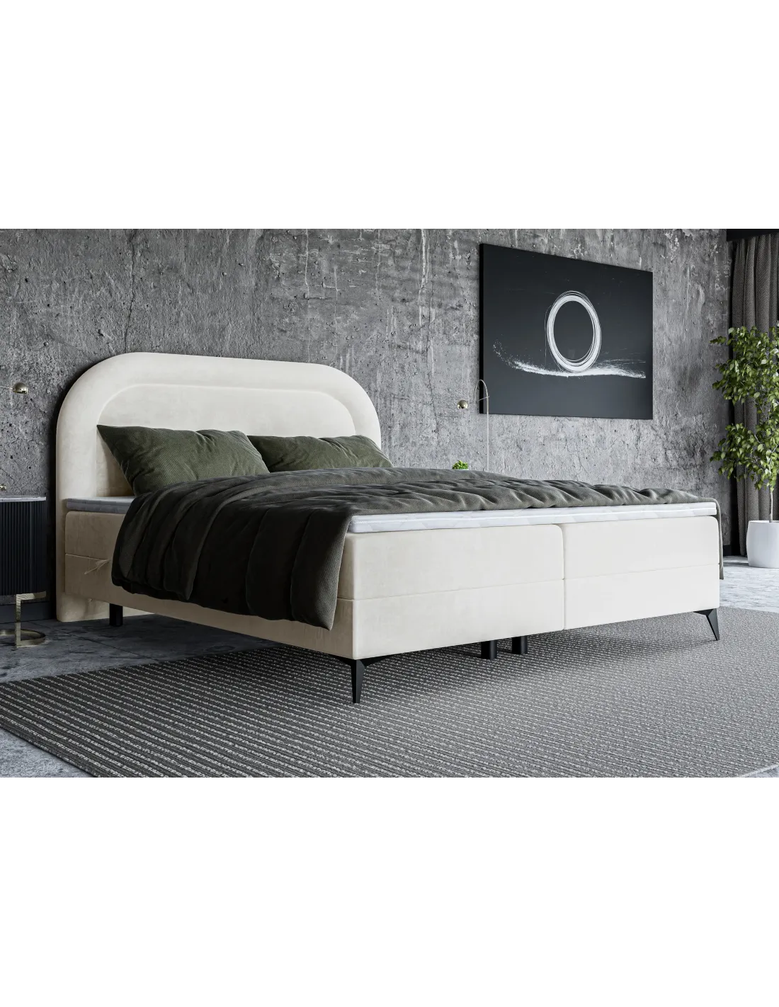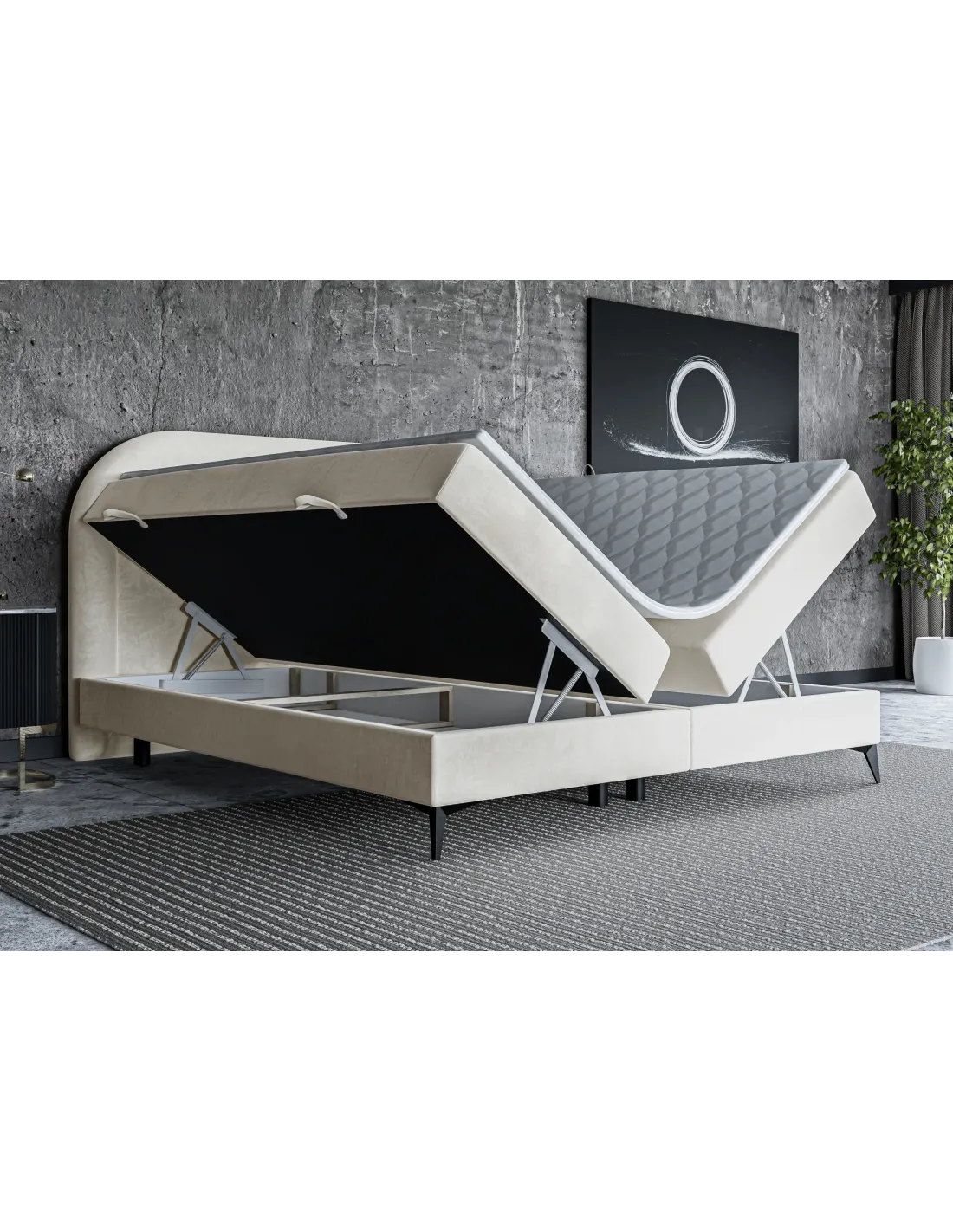 Konstrukcja łóżka opiera się na solidnej podstawie z płyty meblowej, co zapewnia trwałość i stabilność przez lata. Metalowe nogi, dostępne w kolorze czarnym matowym, złotym lub chromowanym, nadają całości elegancji i lekkości. Wielopoziomowa konstrukcja o wysokości siedziska 54 cm zapewnia ergonomię i wygodę użytkowania, a pojemniki na pościel wbudowane w podstawę łóżka pozwalają na praktyczne wykorzystanie przestrzeni. To idealne rozwiązanie dla osób ceniących porządek i estetykę w swojej sypialni.