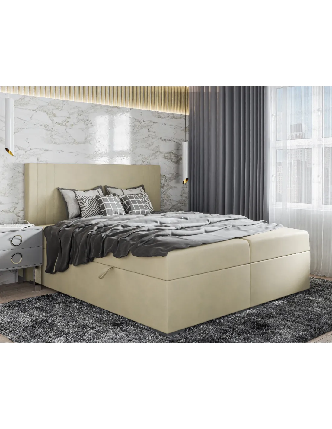 Łóżko MORANO LAVERTO wyróżnia się nowoczesnym designem oraz funkcjonalnymi rozwiązaniami. Model został zaprojektowany tak, by łączyć stylowy wygląd z maksymalną wygodą użytkowania. Pojemne skrzynie na pościel otwierane na boki umożliwiają przechowywanie pościeli, koców lub sezonowych tekstyliów, co pozwala efektywnie zagospodarować przestrzeń sypialni. W ekranach łóżka zastosowano tkaninę antypoślizgową, która stabilizuje materac i zapobiega jego przesuwaniu się podczas snu. Całość dopełnia trwała podstawa z białej płyty meblowej, zapewniająca solidność konstrukcji oraz estetyczny wygląd.