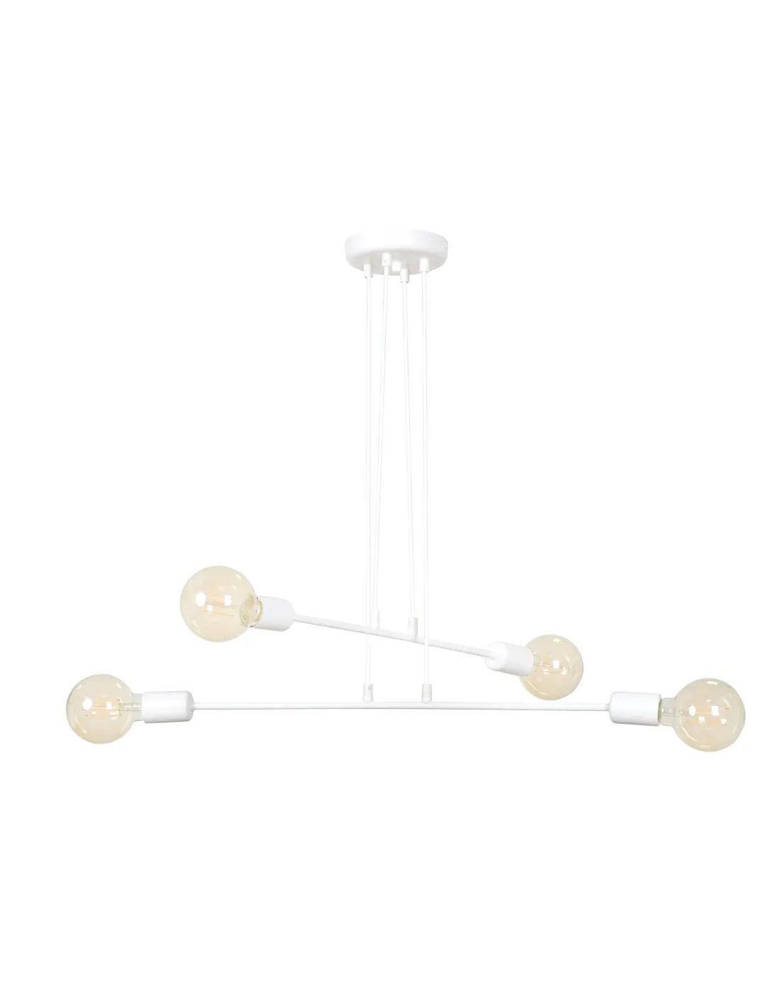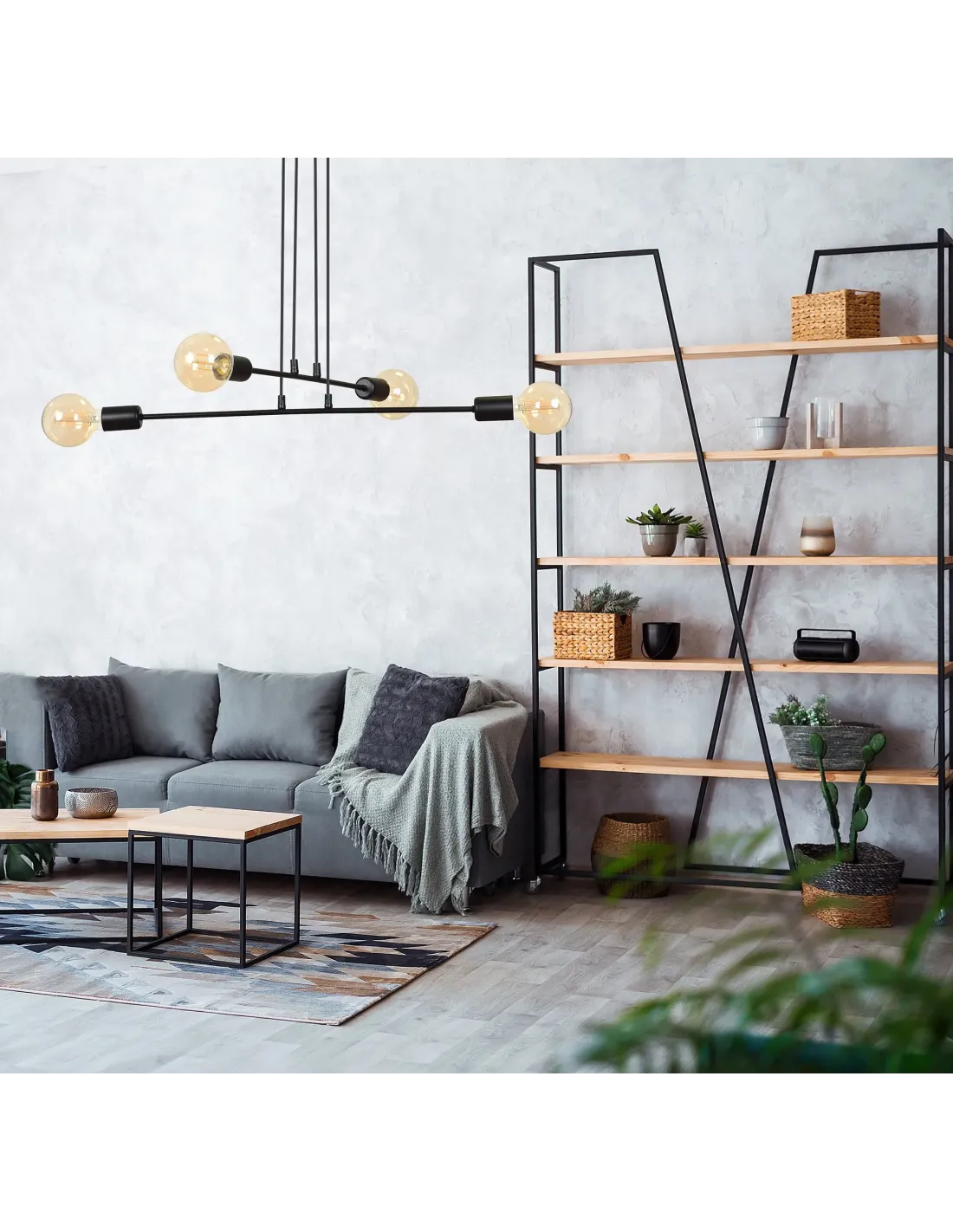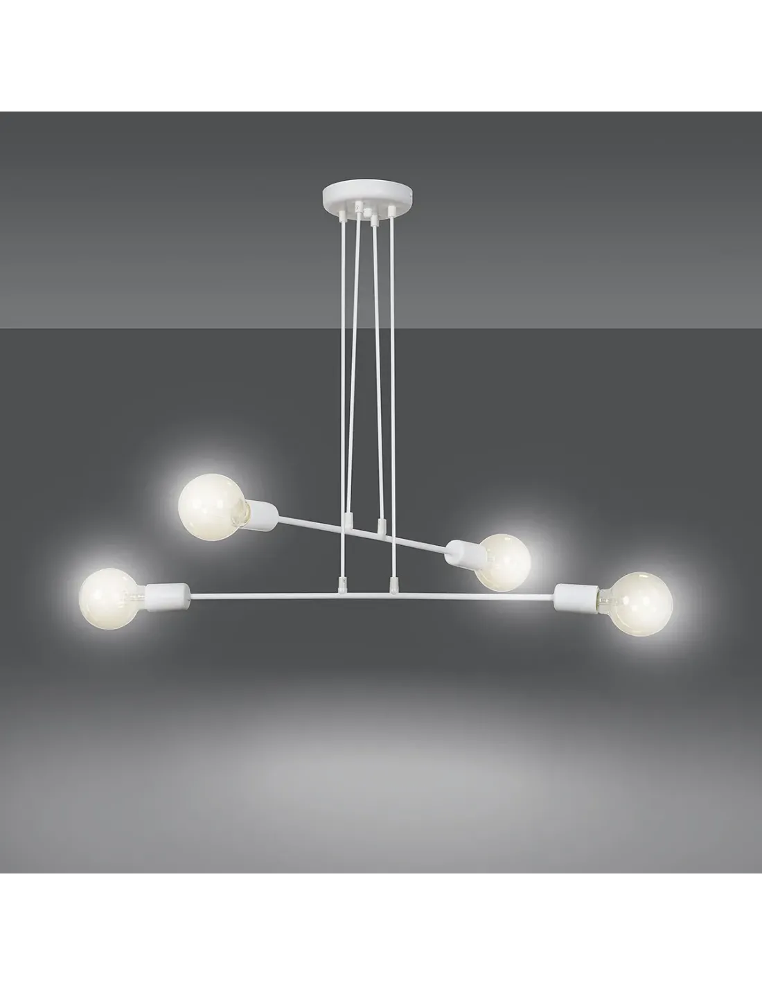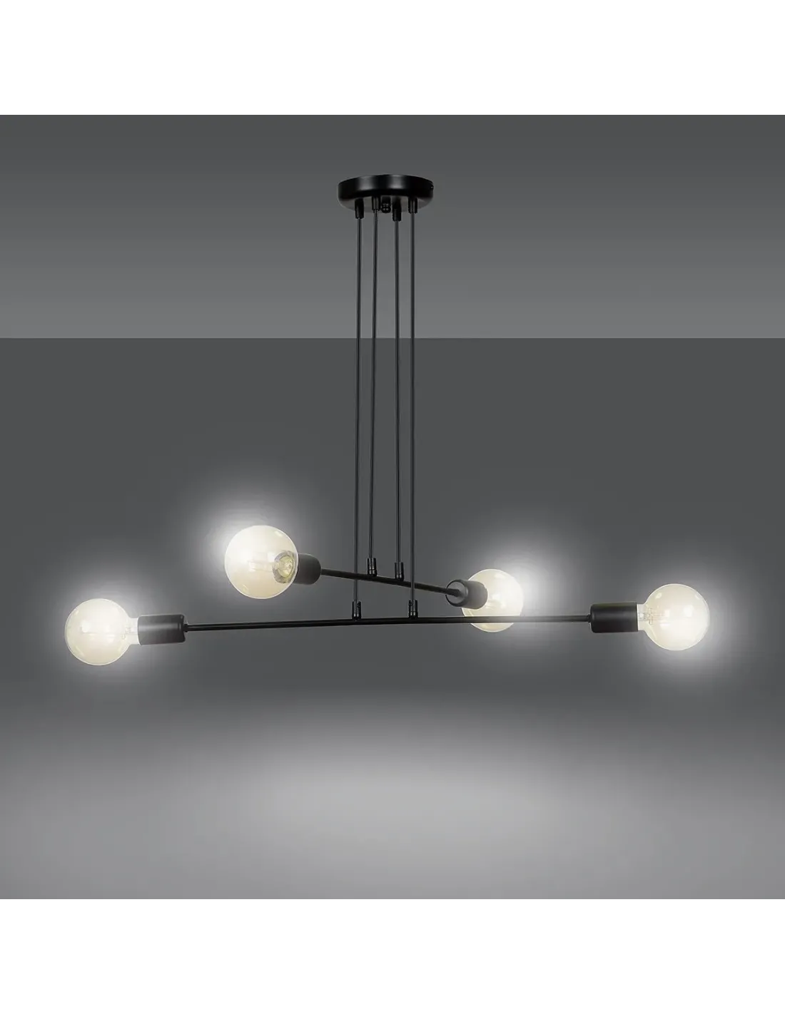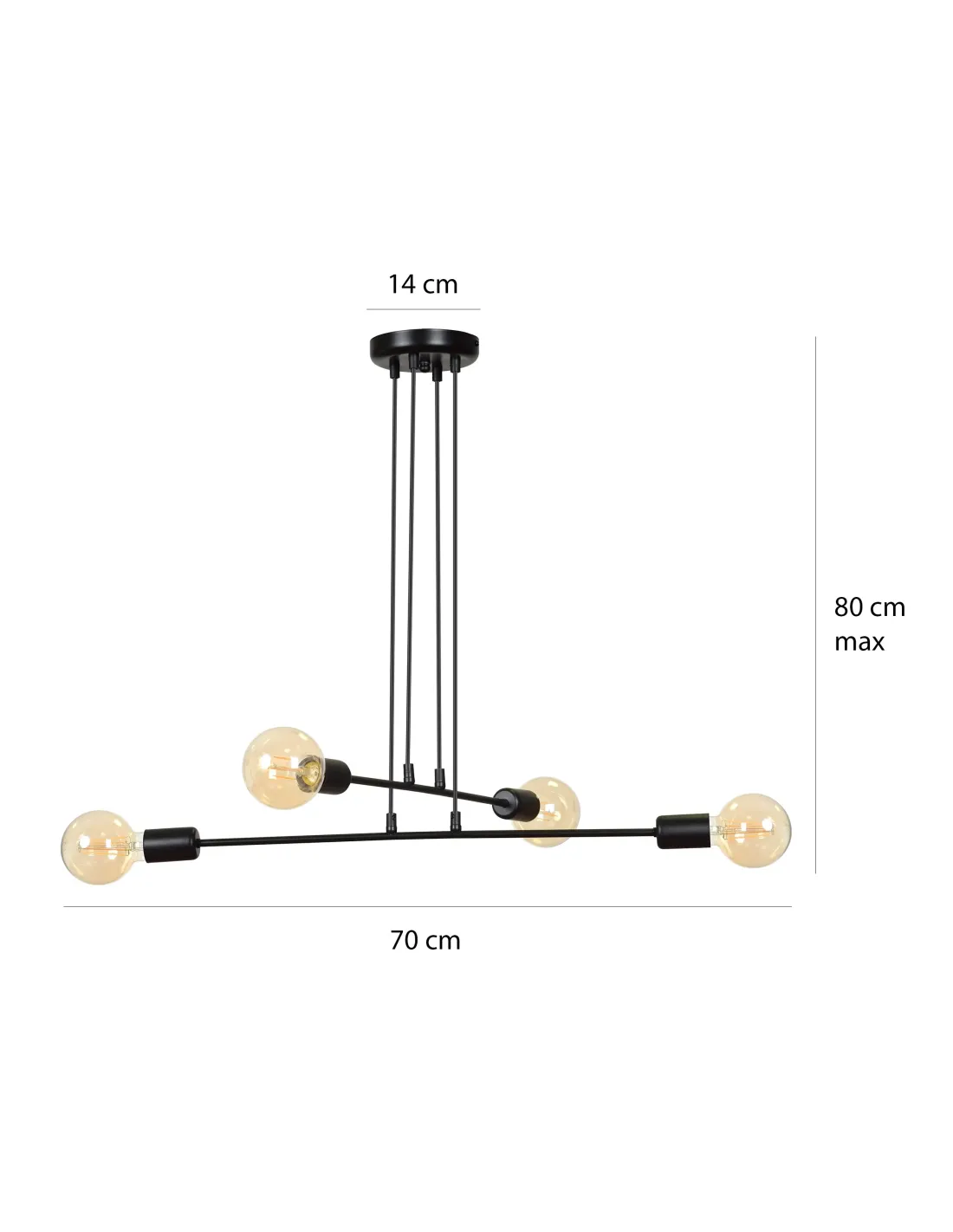 Model MULTIPO wyposażony jest w cztery punkty świetlne, rozmieszczone symetrycznie na poziomej osi, co zapewnia równomierne oświetlenie całego pomieszczenia. Każda z oprawek przeznaczona jest na żarówkę z gwintem E27, a brak kloszy pozwala na pełne wyeksponowanie dekoracyjnych źródeł światła, które stają się integralnym elementem kompozycji. To rozwiązanie nadaje lampie surowego i nowoczesnego charakteru, zgodnego z duchem industrialnego designu.