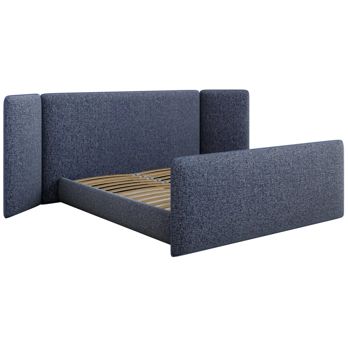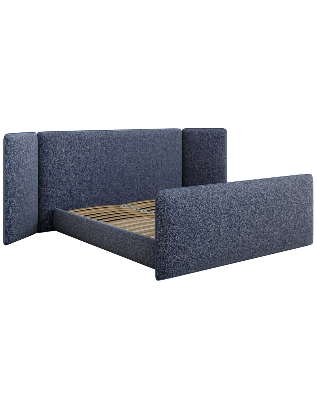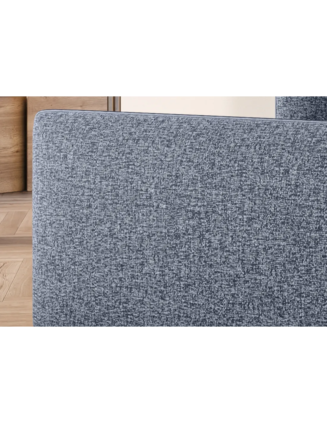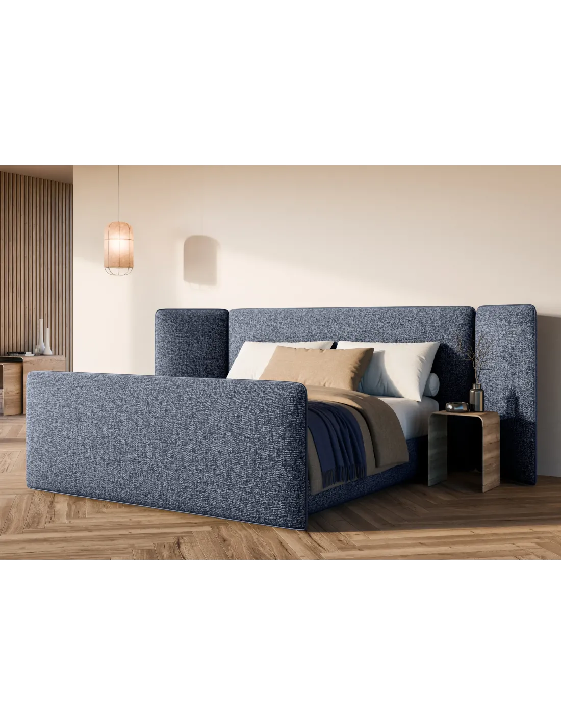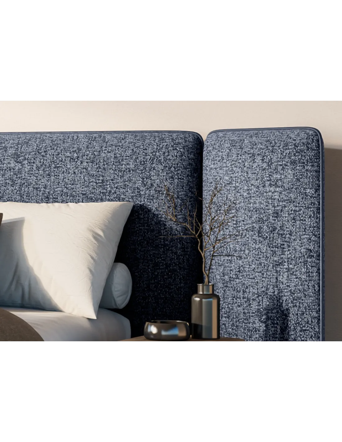Zarówno wezgłowie, jak i przedni panel zostały wykończone subtelną lamówką o grubości 1 cm, biegnącą wzdłuż krawędzi, co dodaje całości elegancji i wyrafinowanego charakteru. Tapicerowane elementy wykonano z najwyższej jakości tkanin, które są trwałe, przyjemne w dotyku i dostępne w różnych kolorach.