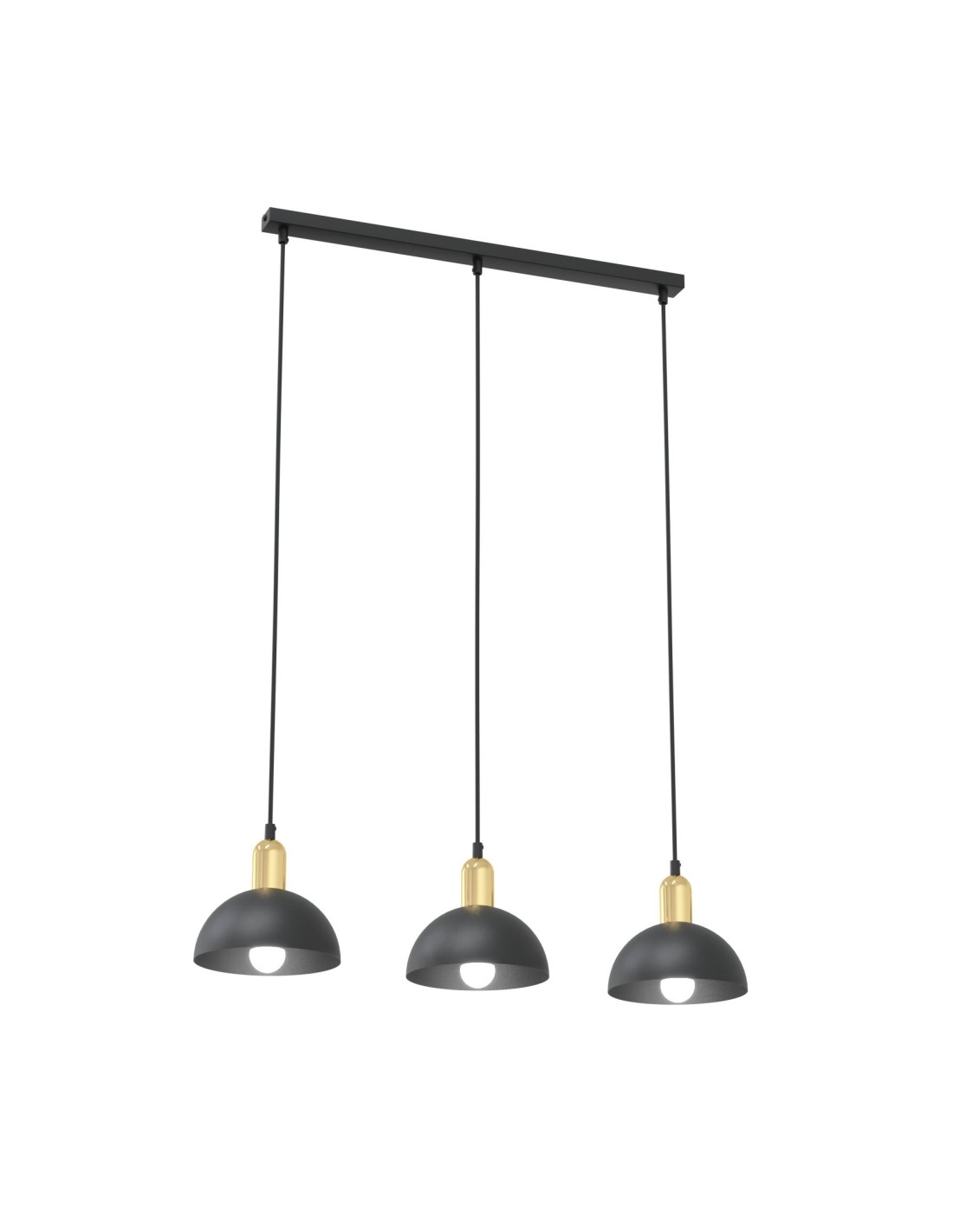 MOTO wyróżnia się przemyślaną, symetryczną konstrukcją oraz złotymi detalami, które przyciągają wzrok, nie dominując przy tym całej aranżacji. Lampa składa się z trzech kloszy osadzonych na poziomej listwie, zawieszonych na regulowanych przewodach, co pozwala na dostosowanie wysokości do wymagań pomieszczenia. Klosze skierowane są ku dołowi, zapewniając skoncentrowane i równomierne oświetlenie.