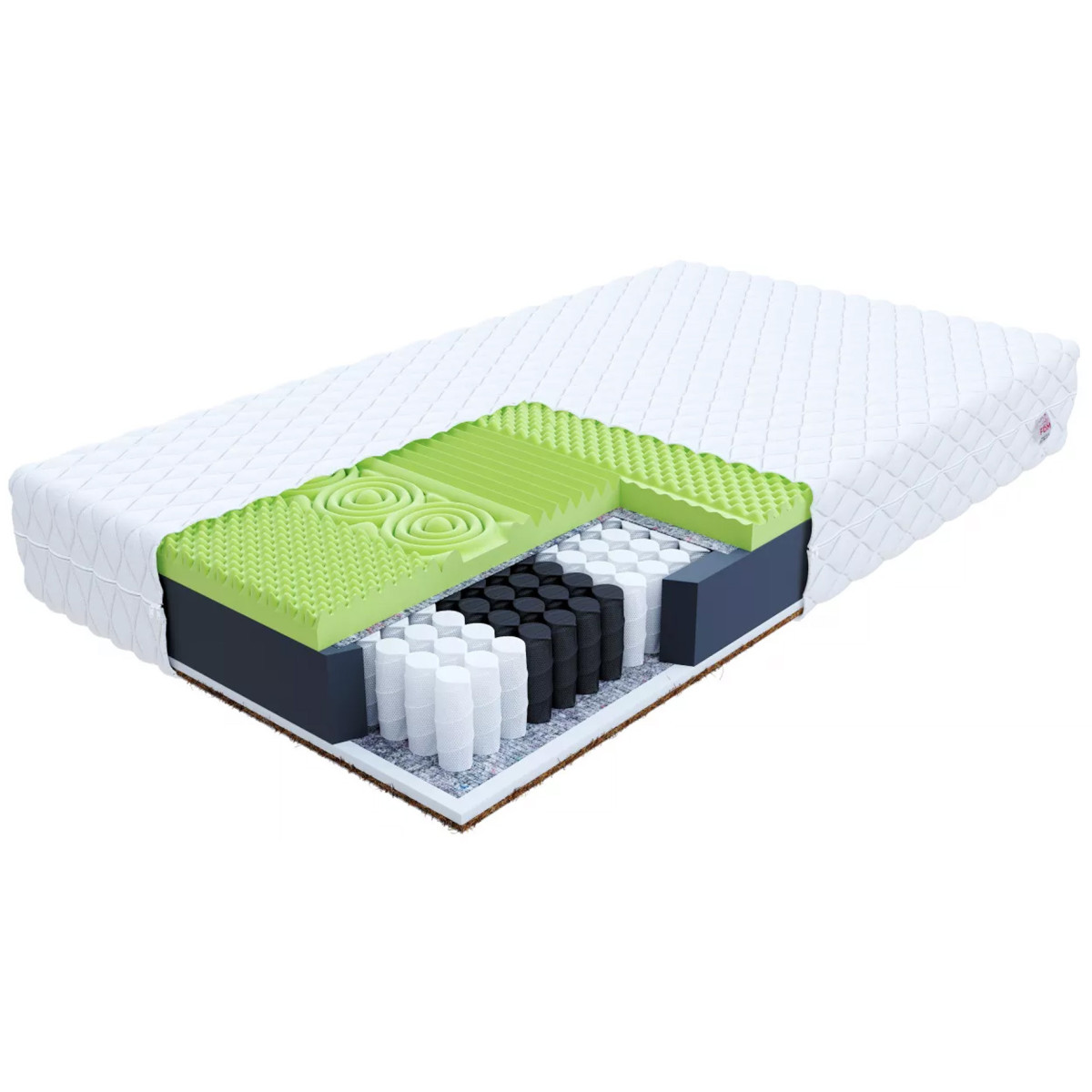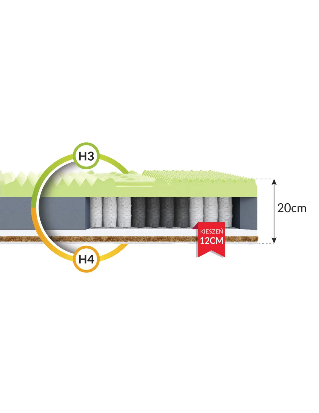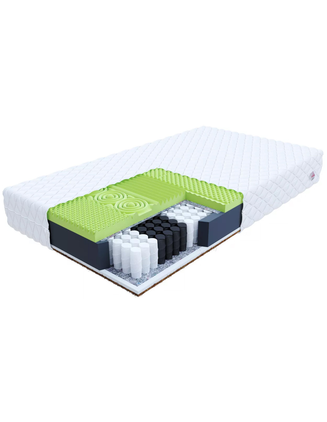 Zaawansowana 7-strefowa konstrukcja umożliwia różnicowanie podparcia dla poszczególnych części ciała, co pozytywnie wpływa na rozluźnienie mięśni i komfortowy sen. Warstwa kokosu usztywnia całą powierzchnię oraz poprawia przewiewność materaca. Pianka poliuretanowa T25 odpowiada za trwałość i elastyczność, a profilowana pianka wysokoelastyczna HR zapewnia wyjątkowy komfort i efekt delikatnego masażu.