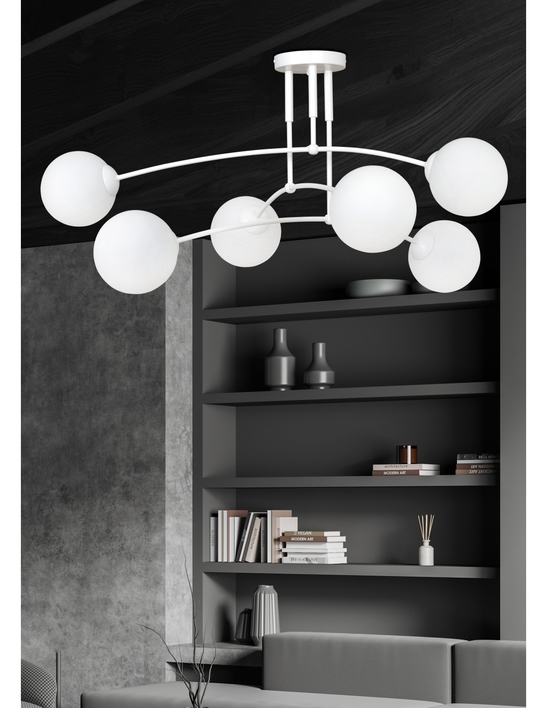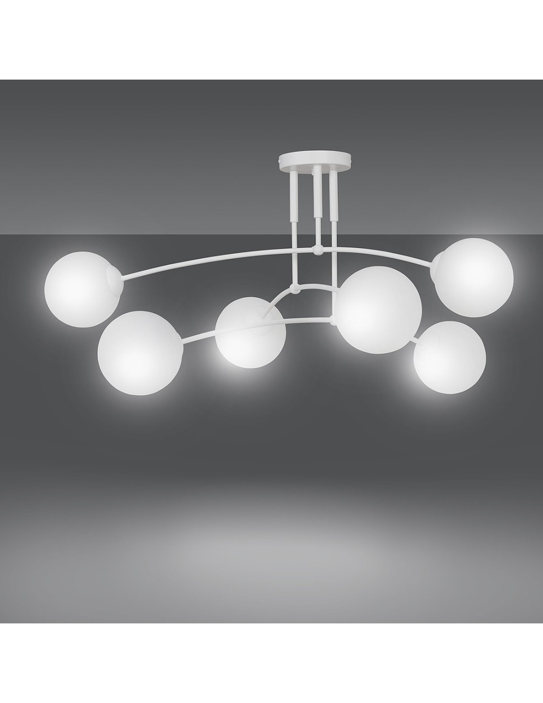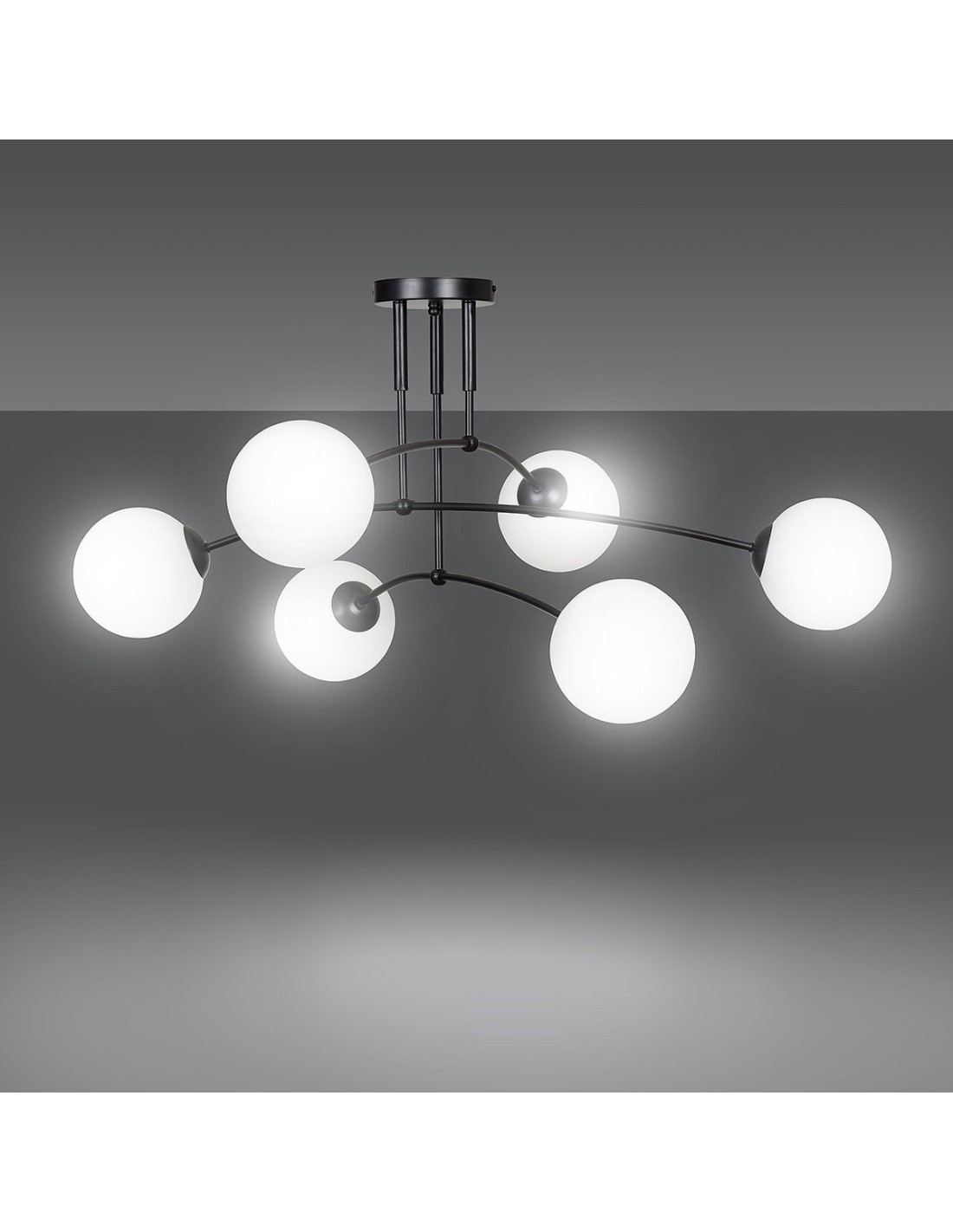 Lampa PREGOS 6 wyróżnia się geometrycznym układem sześciu kloszy, które zapewniają szerokie i równomierne oświetlenie. Każdy klosz wykonany został z mlecznego szkła, co pozwala uzyskać miękkie światło, sprzyjające odpoczynkowi i relaksowi. Metalowa konstrukcja w kolorze czarnym wprowadza nowoczesny charakter i elegancką prostotę.