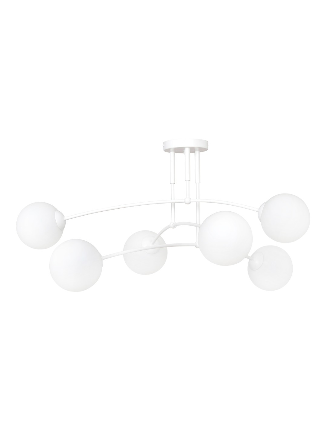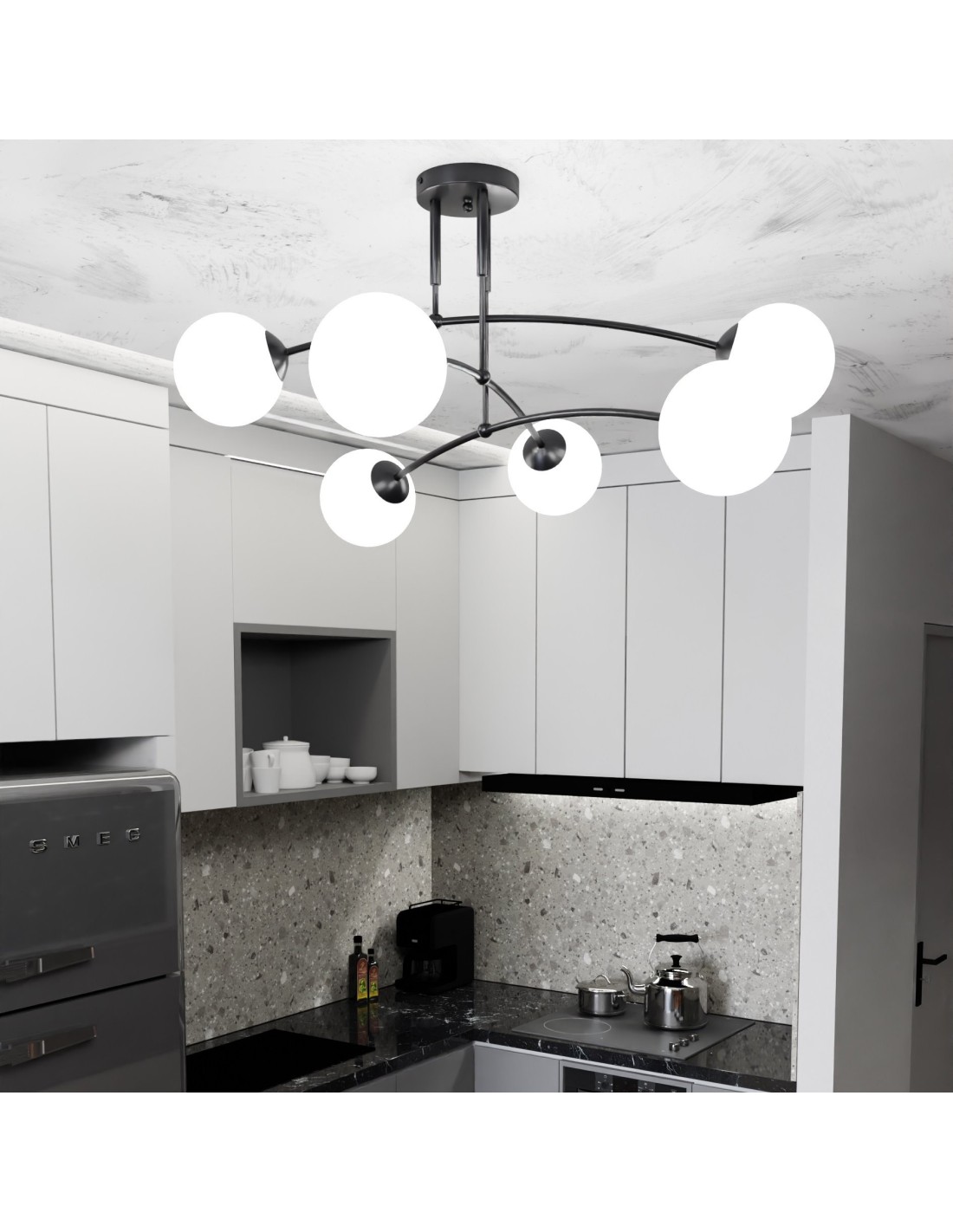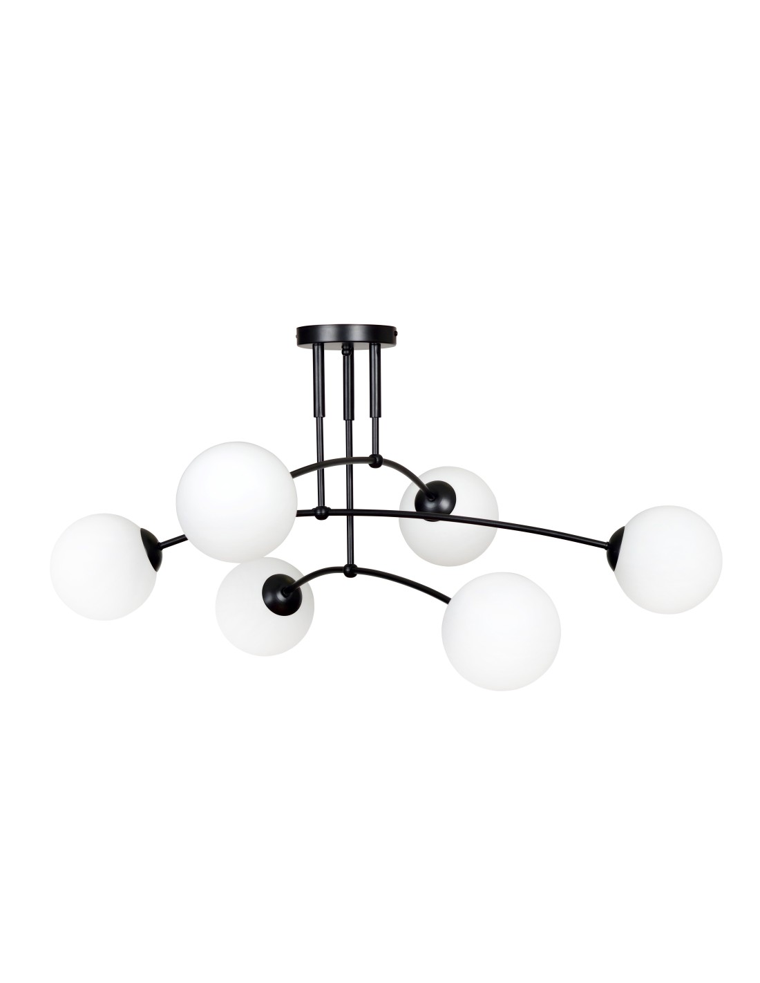 Lampa PREGOS 6 wyróżnia się geometrycznym układem sześciu kloszy, które zapewniają szerokie i równomierne oświetlenie. Każdy klosz wykonany został z mlecznego szkła, co pozwala uzyskać miękkie światło, sprzyjające odpoczynkowi i relaksowi. Metalowa konstrukcja w kolorze czarnym wprowadza nowoczesny charakter i elegancką prostotę.