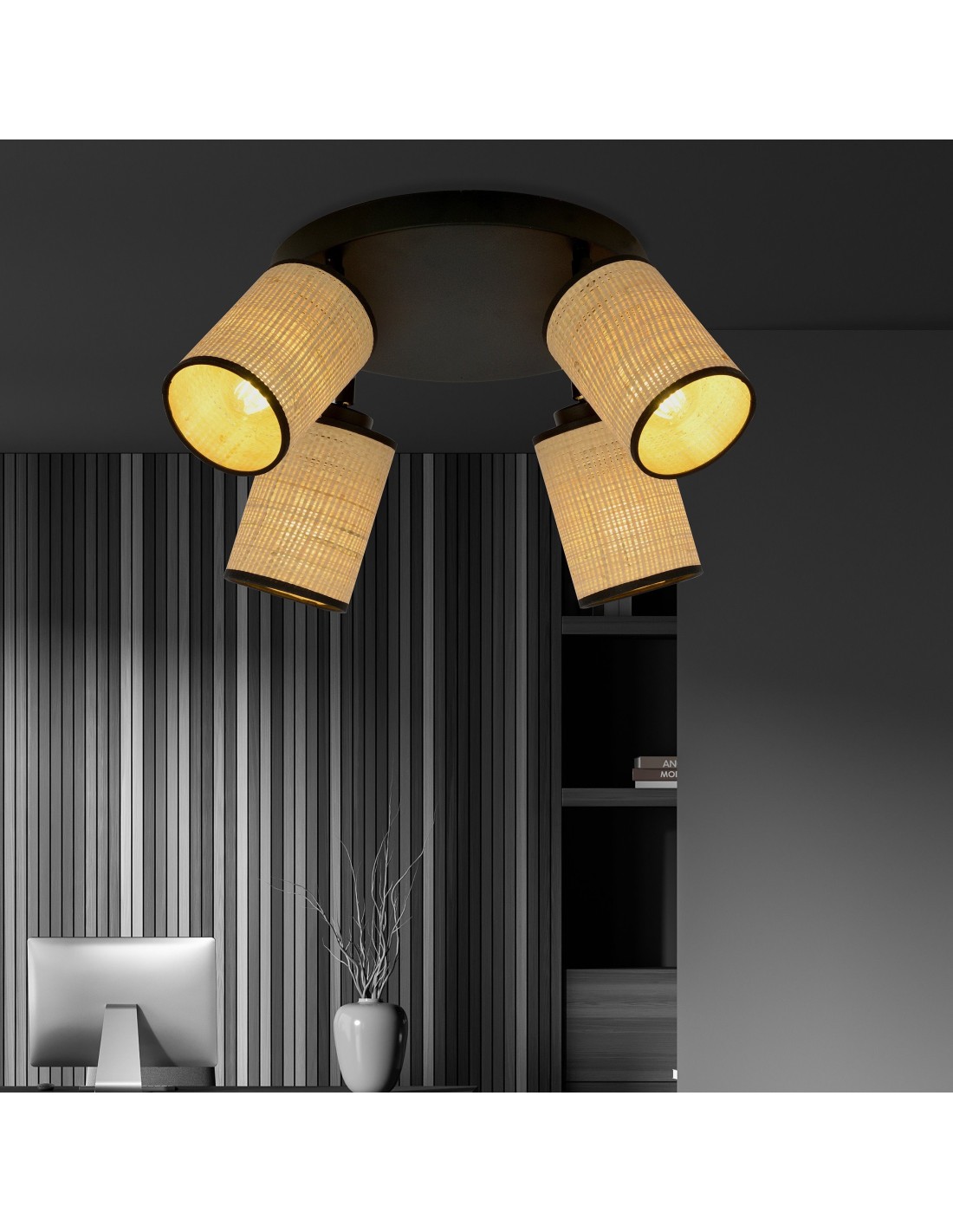 YOGA 4 Premium to esencja naturalnego stylu w nowoczesnym wydaniu. Ten czteropunktowy plafon sufitowy przyciąga wzrok eleganckim połączeniem czarnej, metalowej podstawy i ręcznie wyplecionych rattanowych abażurów. Dzięki swojej formie i wyjątkowym materiałom staje się nie tylko funkcjonalnym źródłem światła, ale także ozdobą, która wprowadza do wnętrza ciepło, styl i harmonię.
