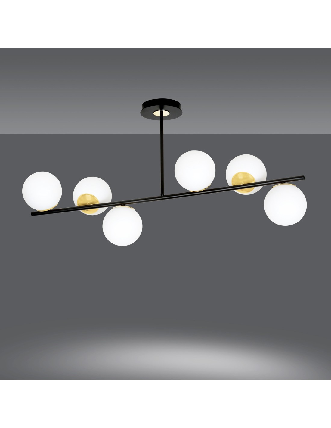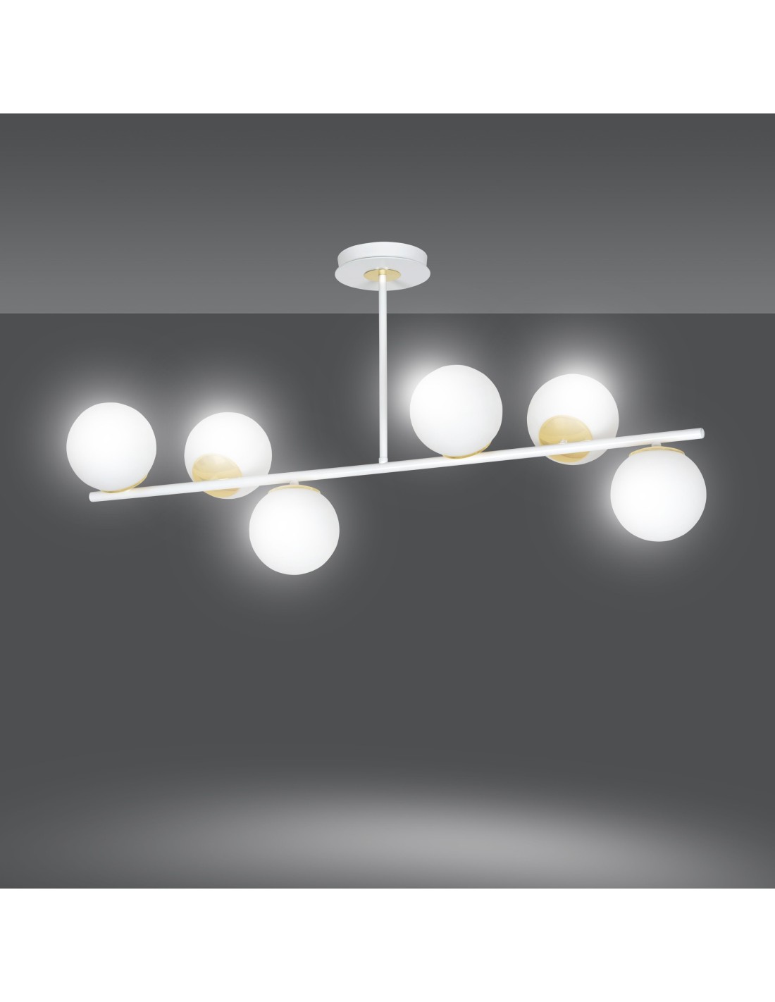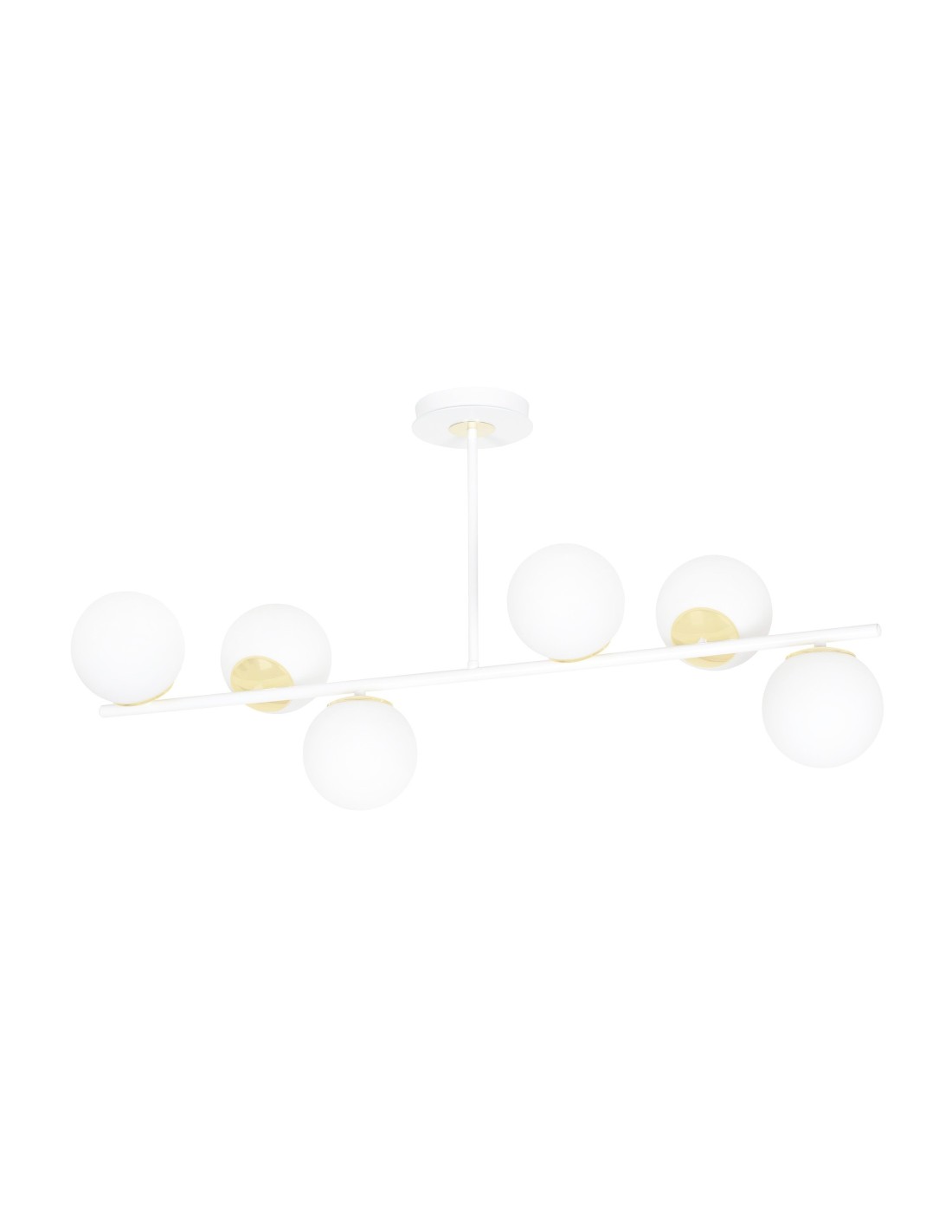 Delikatne, mleczne klosze pięknie rozpraszają światło, tworząc harmonijną i przytulną atmosferę. Złote elementy konstrukcji dodają lampie wyrafinowanego charakteru, wprowadzając do wnętrza elegancję i ponadczasowy szyk. To oświetlenie, które nie tylko doświetla przestrzeń, ale również staje się dekoracyjnym punktem wnętrza.