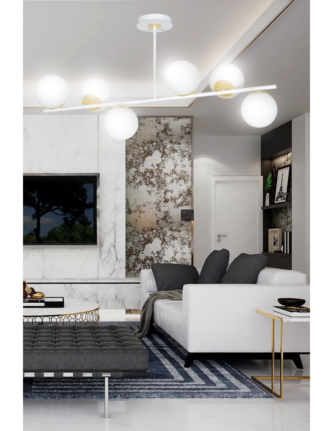 Seria FLOKI dostępna jest w wersjach na 4 lub 6 punktów świetlnych, co pozwala na dopasowanie lampy do wielkości wnętrza. Czarny wariant z dodatkiem złota podkreśla nowoczesny, luksusowy charakter przestrzeni, podczas gdy biała wersja optycznie ją powiększa i rozświetla.