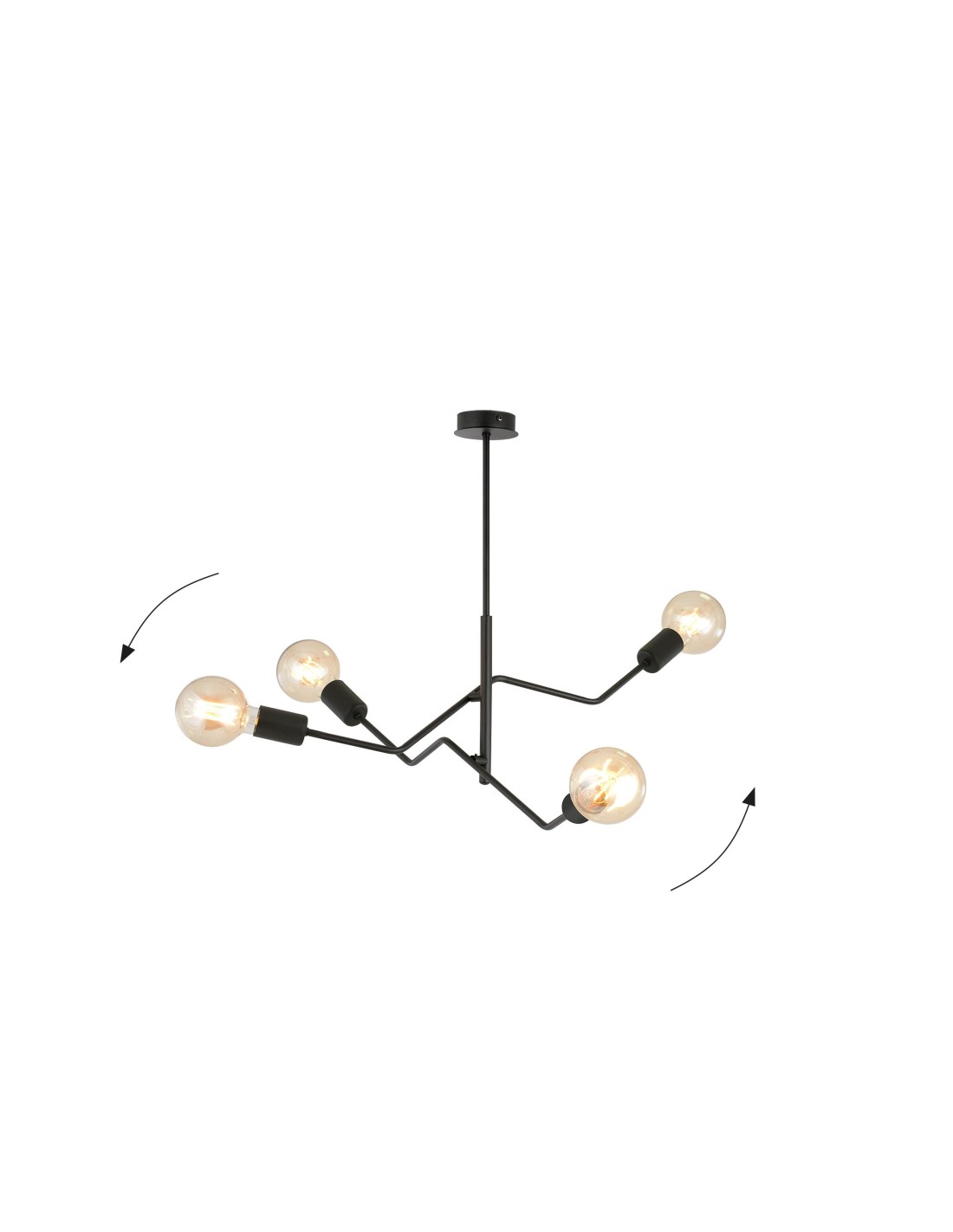 Wersja FRIX 4 oferuje cztery punkty świetlne rozstawione pod różnymi kątami, co zapewnia dobre rozproszenie światła i optymalne doświetlenie wnętrza. Czarna konstrukcja z widocznymi żarówkami oraz złotymi detalami dodaje lampie elegancji i nowoczesnego charakteru. Idealna do salonu, przestrzeni open space, kuchni czy nowoczesnego biura.