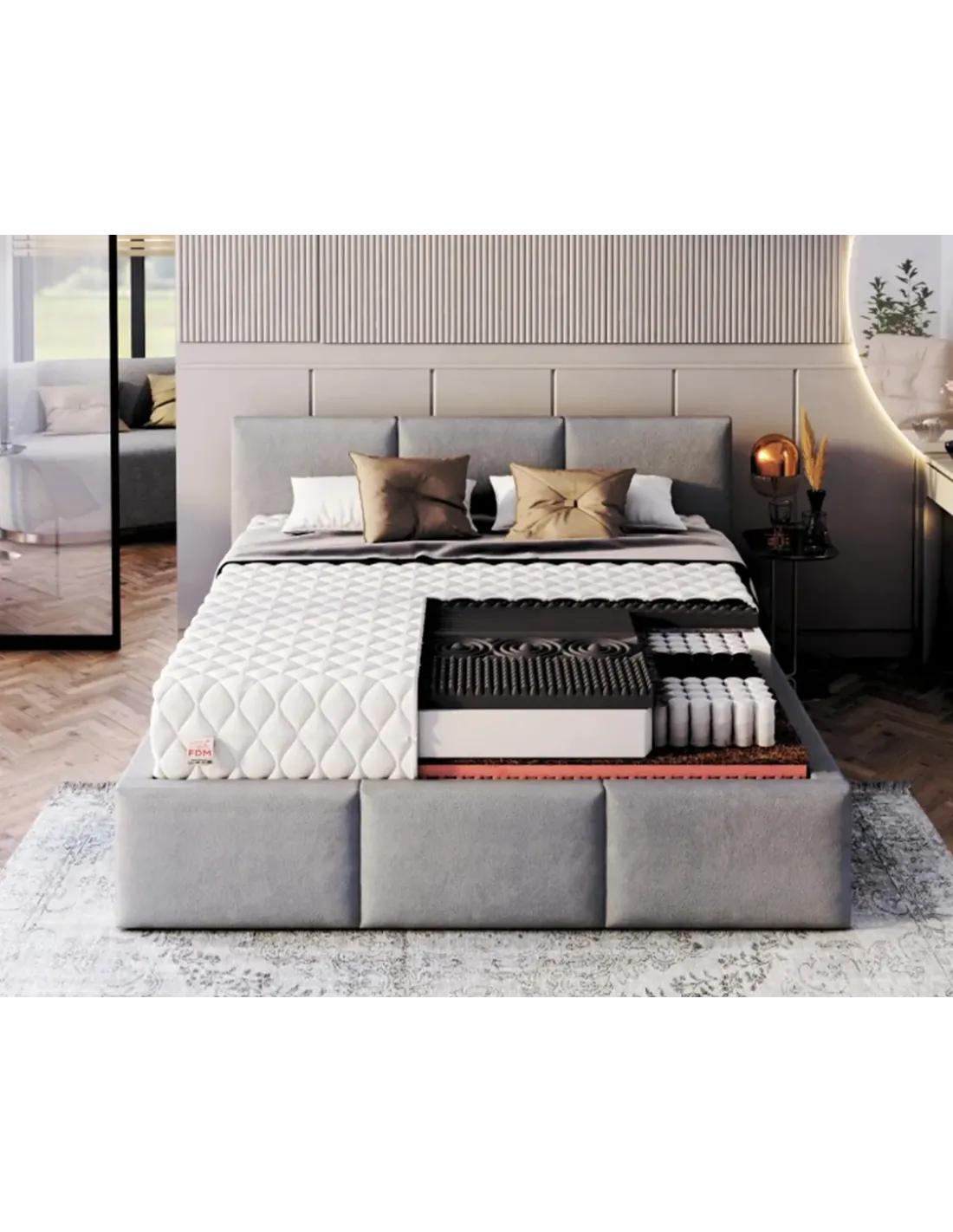 Materac GINASO FDM wyróżnia się nowoczesnym wkładem sprężynowym NanoHARD, który gwarantuje niezależną pracę każdej sprężyny, a jednocześnie wykazuje zwiększoną odporność na deformacje. Dzięki 7-strefowej konstrukcji materac zapewnia indywidualne podparcie dla każdej części ciała – od głowy aż po stopy. Komfort użytkowania podnosi pianka wysokoelastyczna HR, odpowiadająca za sprężystość i odpowiednią wentylację, a pianka termoelastyczna VISCO reaguje na temperaturę ciała, dopasowując się idealnie do jego kształtu. Dzięki temu GINASO to materac, który wspiera kręgosłup, ułatwia zasypianie i sprzyja regeneracji. Zastosowanie naturalnego kokosa w warstwie wewnętrznej zapewnia lepszą sztywność, chroni przed wilgocią i rozwijaniem się pleśni oraz alergenów.