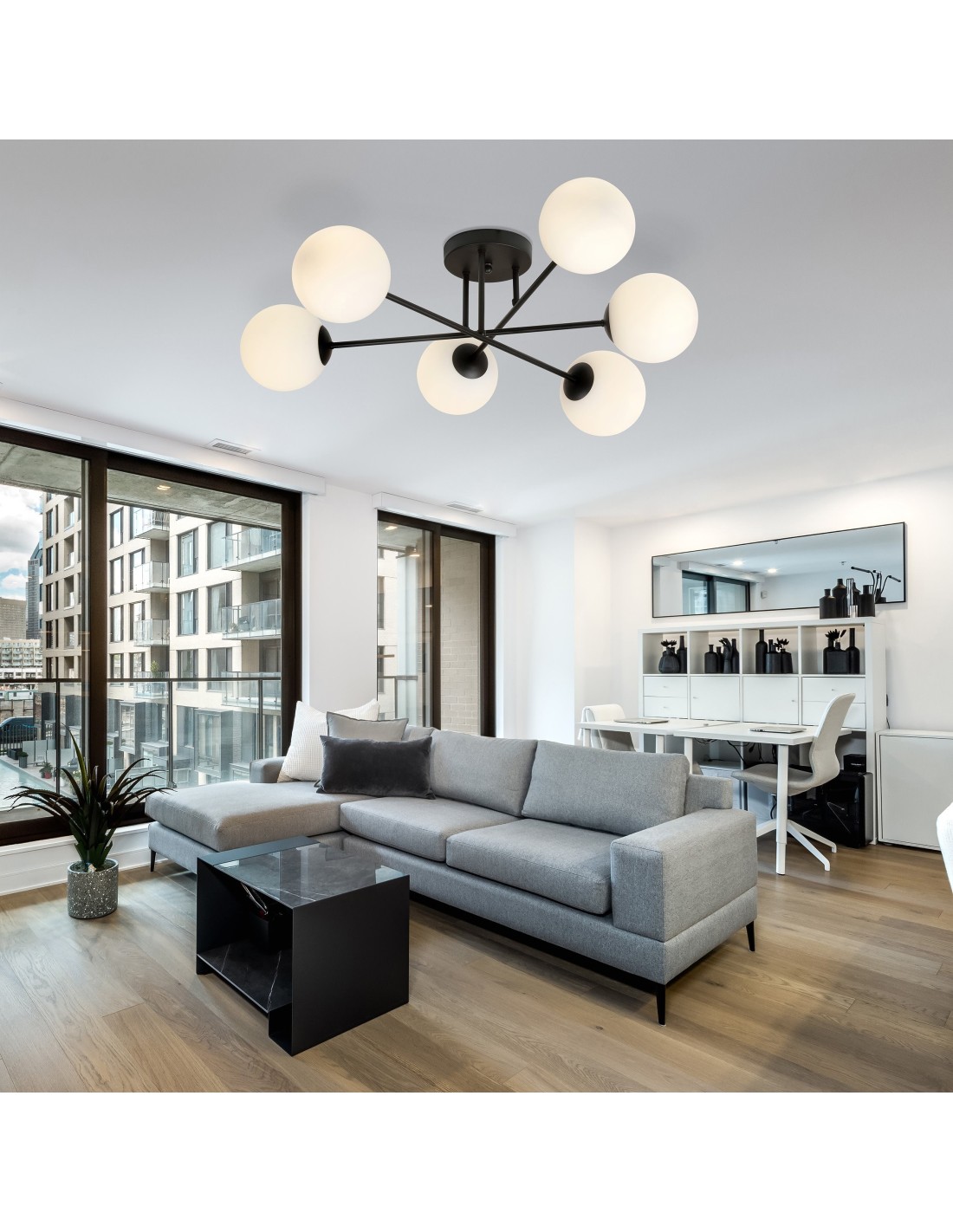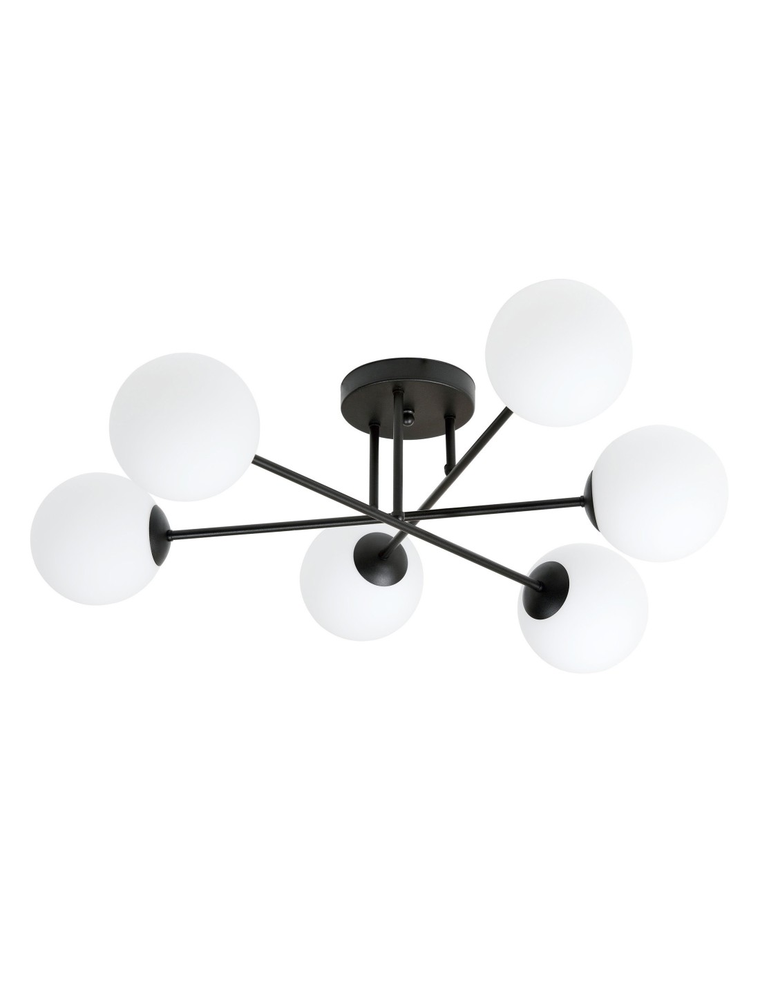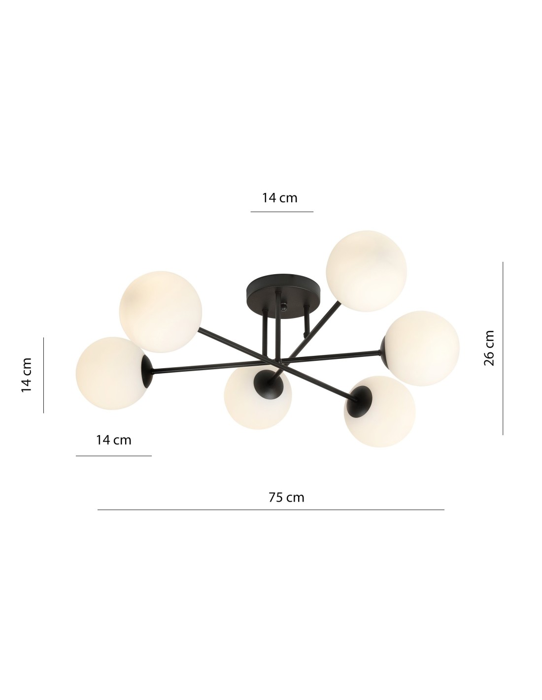 ROMA wyróżnia się minimalistyczną linią i symetrycznym układem sześciu kloszy, rozmieszczonych w taki sposób, by zapewnić optymalne oświetlenie całego pomieszczenia. Każdy z kloszy wykonany jest z mlecznobiałego szkła, co pozwala uzyskać delikatne, przyjemne dla oka światło. Czarna, metalowa konstrukcja dodaje elegancji i współczesnego charakteru, tworzy kontrast, który sprawdza się zarówno w jasnych, jak i ciemnych aranżacjach.