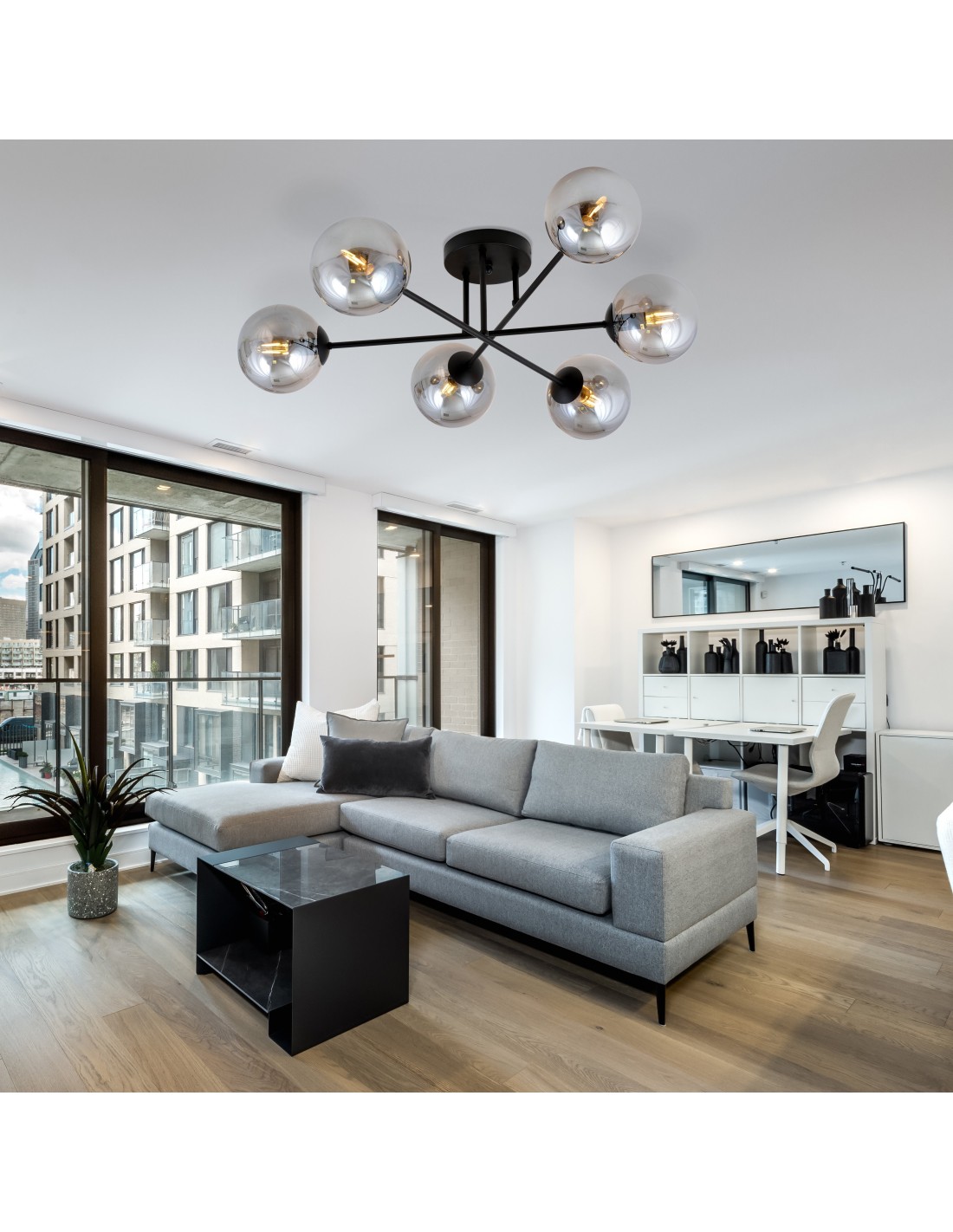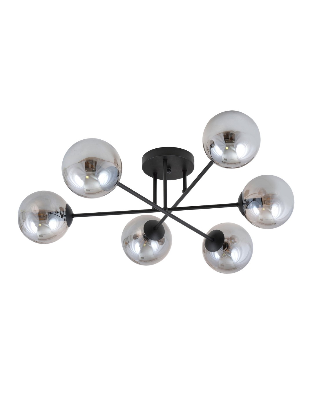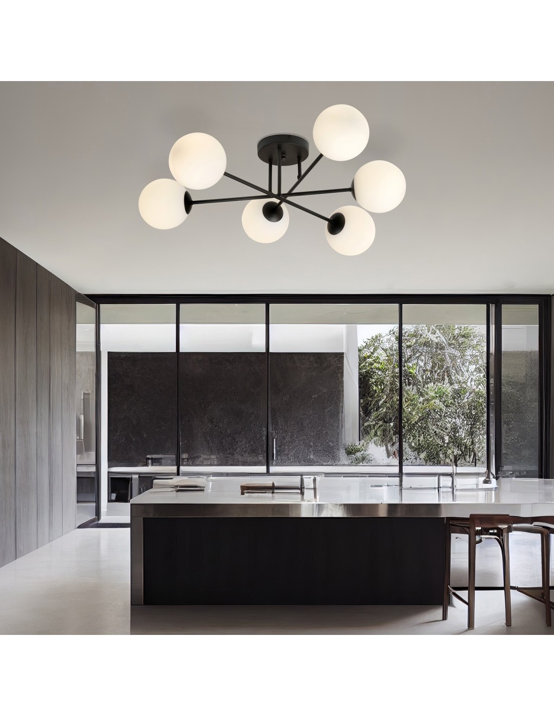 ROMA wyróżnia się minimalistyczną linią i symetrycznym układem sześciu kloszy, rozmieszczonych w taki sposób, by zapewnić optymalne oświetlenie całego pomieszczenia. Każdy z kloszy wykonany jest z mlecznobiałego szkła, co pozwala uzyskać delikatne, przyjemne dla oka światło. Czarna, metalowa konstrukcja dodaje elegancji i współczesnego charakteru, tworzy kontrast, który sprawdza się zarówno w jasnych, jak i ciemnych aranżacjach.
