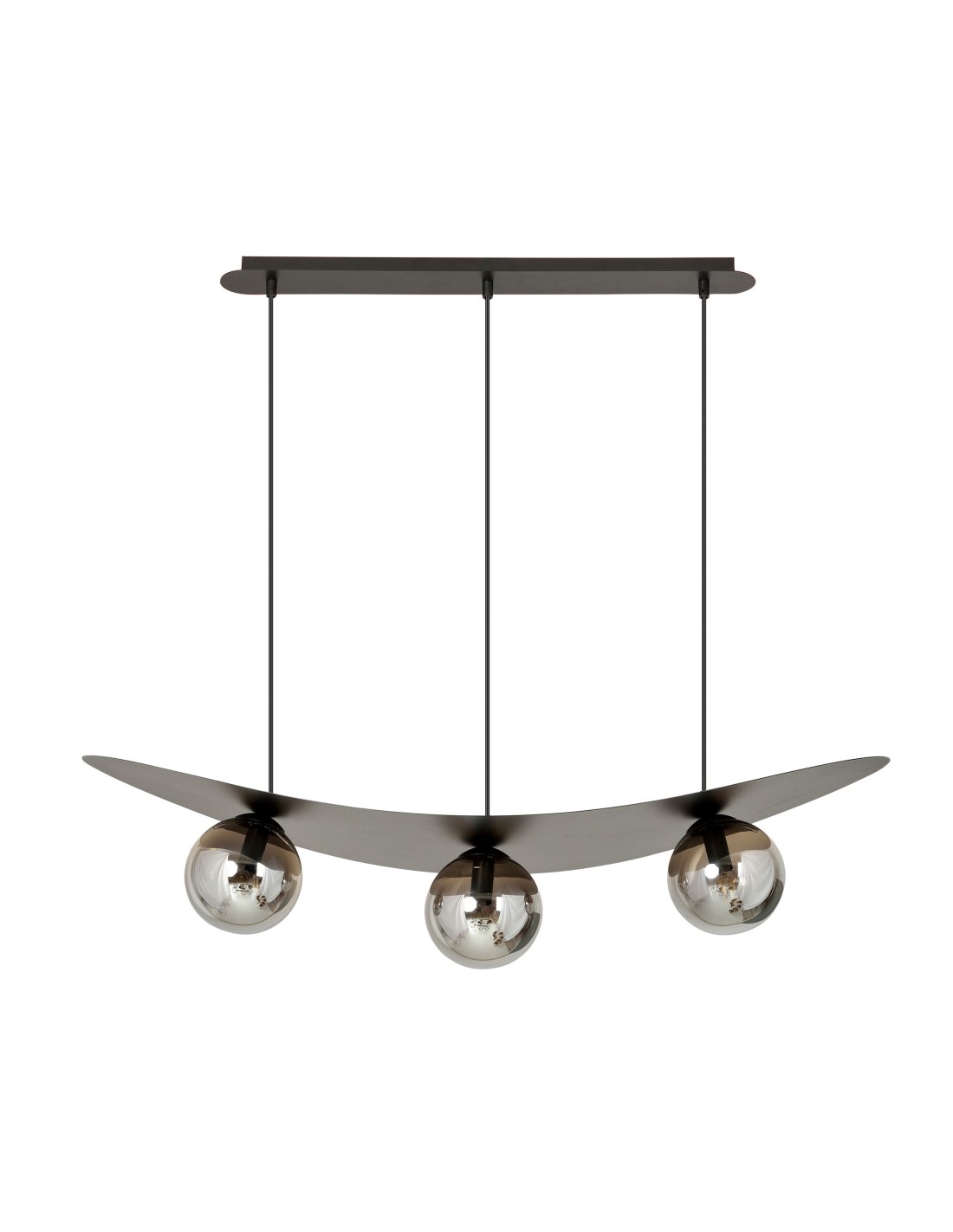 Czarne elementy stalowe kontrastują z grafitowymi, szklanymi kloszami, tworząc spójną, ponadczasową kompozycję, która znakomicie wpisuje się w aranżacje nowoczesne, loftowe i modern classic. Lekko przydymione szkło nadaje całości głębi oraz wprowadza do wnętrza wyjątkowy klimat. Lampa nie tylko oświetla, ale również dekoruje, stanowiąc ważny element kompozycyjny wystroju.