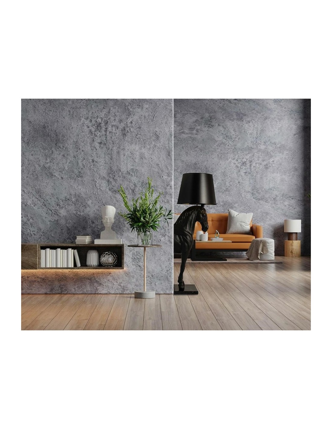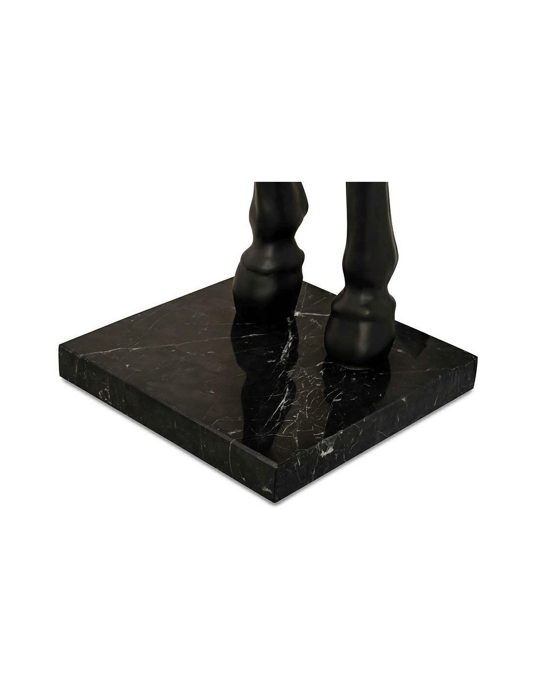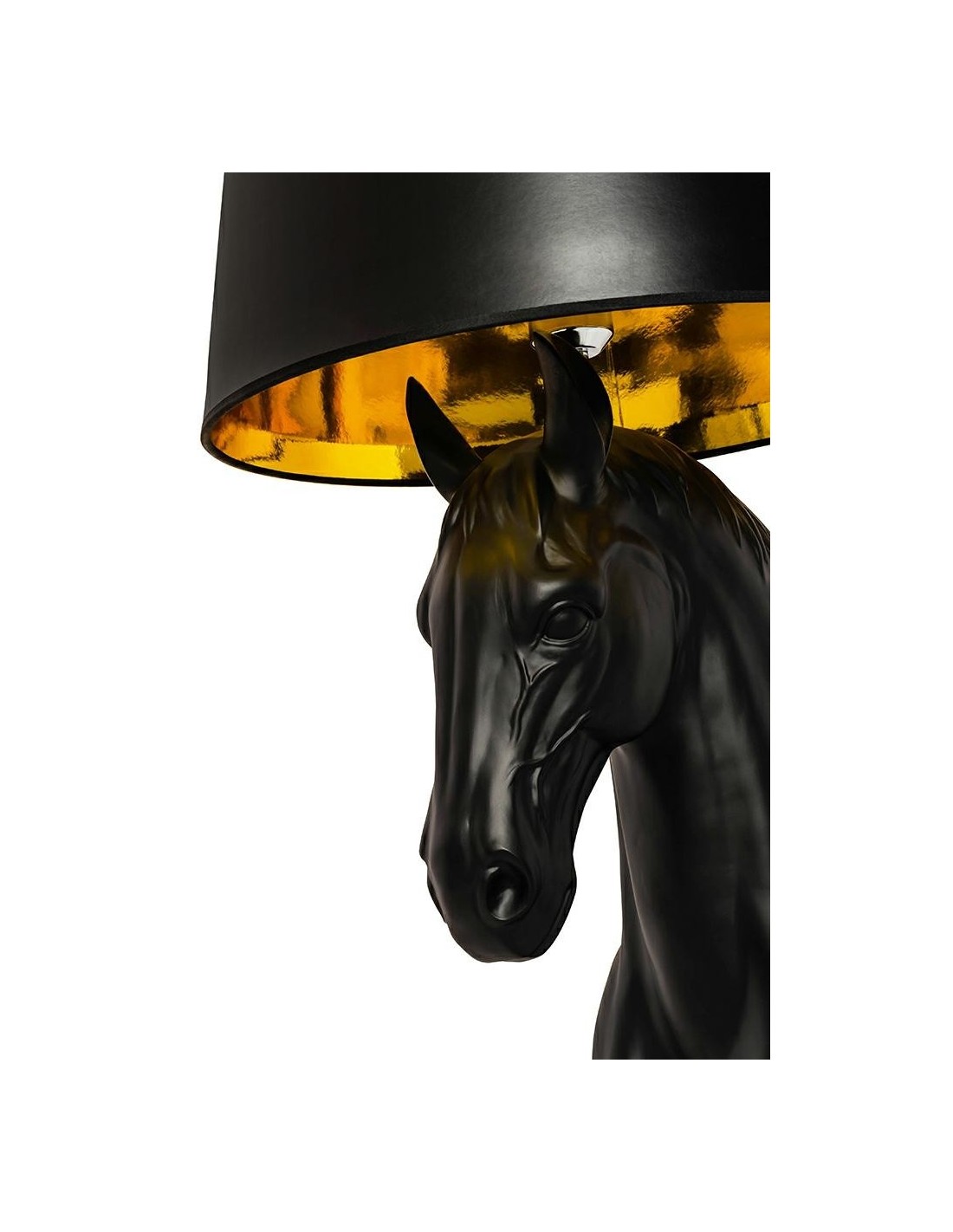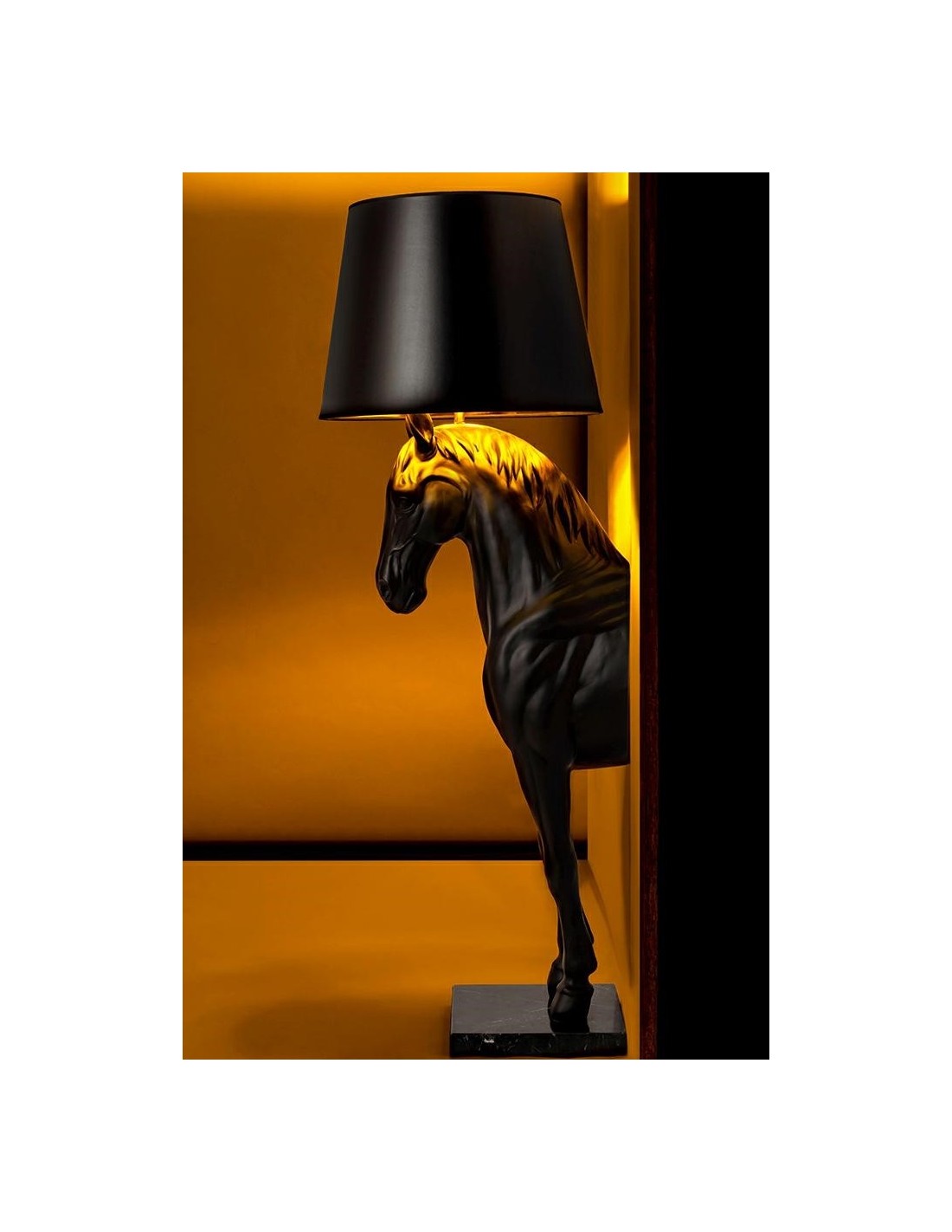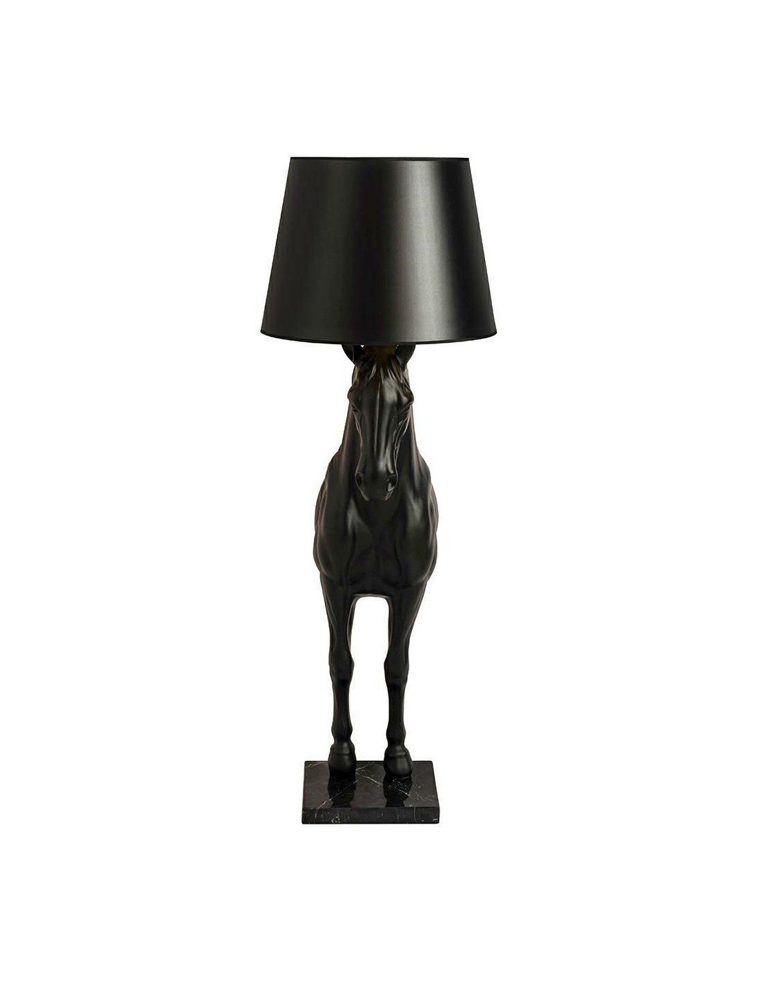 HORSE STAND S to wyjątkowy projekt łączący artystyczną formę z praktycznym zastosowaniem. Wykonana w całości z włókna szklanego figura konia, ustawiona na marmurowej podstawie, nadaje lampie monumentalnego wyglądu i zapewnia jej trwałość. Matowa, czarna powierzchnia w połączeniu z eleganckim abażurem tworzy wyważony kontrast i podkreśla prestiż całej kompozycji.