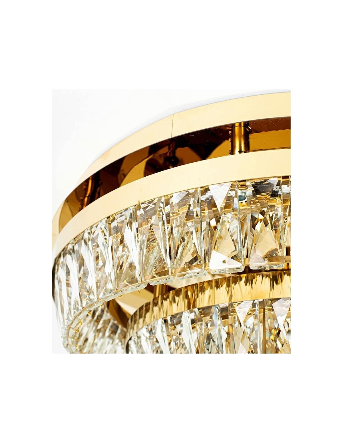 MOOSEE SAVOY 2 Złota zachwyca nie tylko eleganckim wyglądem, ale także starannością wykonania i funkcjonalnością. Jej konstrukcja opiera się na stabilnej, złotej obręczy z dekoracyjnymi, podłużnymi kryształkami, które tworzą przyjemną grę światła na suficie i ścianach. Kształt plafonu zapewnia równomierne oświetlenie, a jednocześnie nadaje wnętrzu luksusowego charakteru.