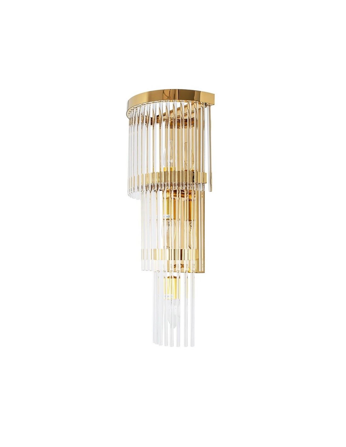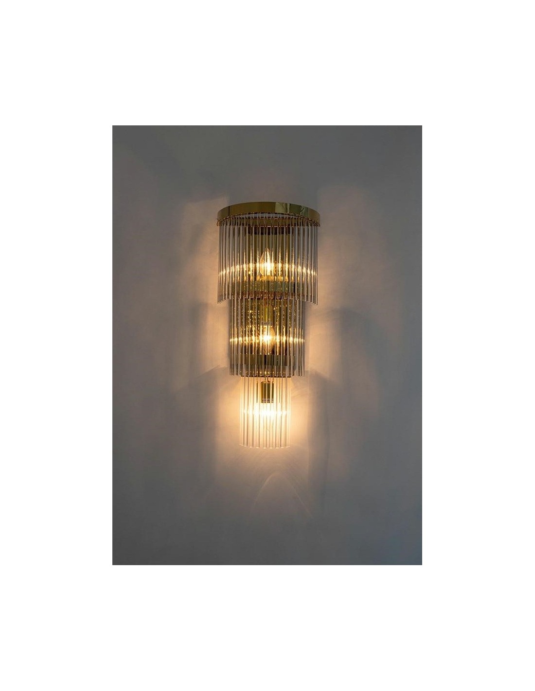 MOOSEE ESTRO Złota to elegancka lampa ścienna w stylu glamour, która łączy nowoczesne trendy z klasyczną elegancją. Wykonana z połączenia stali nierdzewnej w złotym wykończeniu oraz transparentnego szkła, stanowi nie tylko źródło światła, ale i wyrafinowaną dekorację ścienną. Jej wyjątkowa konstrukcja, złożona z kaskadowo zawieszonych kloszy, tworzy efekt świetlny, który dodaje wnętrzom głębi i luksusu.